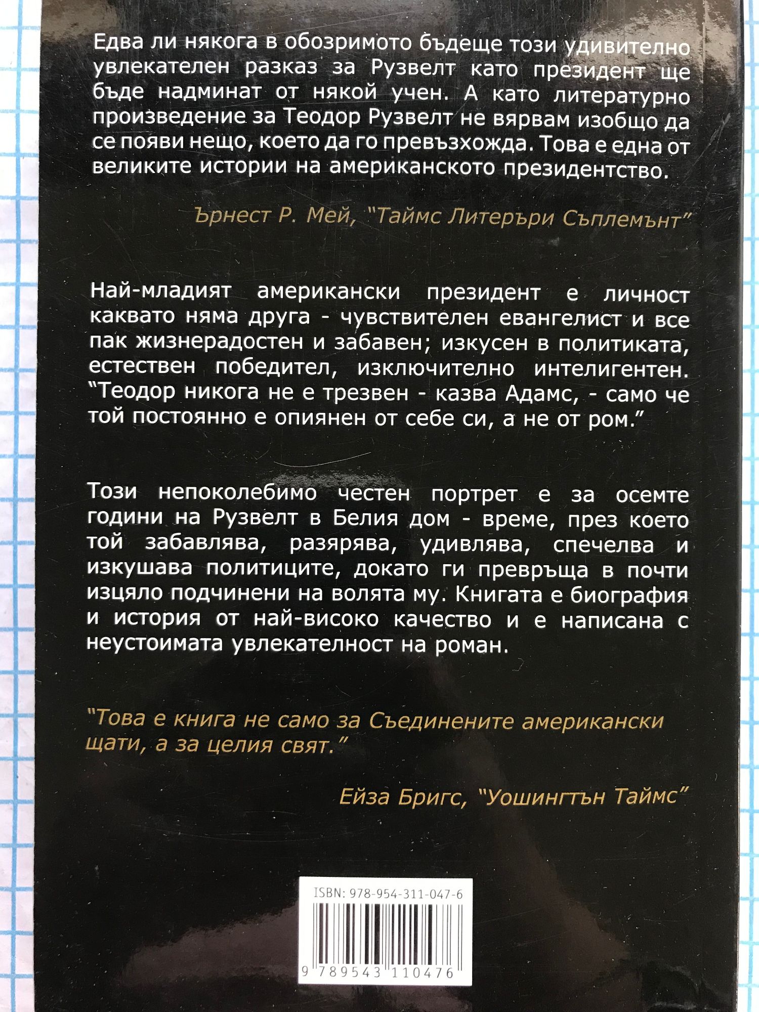 Най-младият американски президент е личност каквато няма друга - чувствителен евангелист и все пак жизнерадостен и забавен; изкусен в политиката, естествен победител, изключително интелигентен. "Теодор никога не е трезвен - казва Адамс - само че той постоянно е опиянен от себе си, а не от ром." Този непоколебимо честен портрет е за осемте години на Рузвелт в Белия дом - време, през което той забавлява, разярява, удивлява, спечелва и изкушава политиците, докато ги превръща в почти изцяло подчинени на волята му. Книгата е биография и история от най-високо качество и е написана с неустоимата увлекателност на роман.
