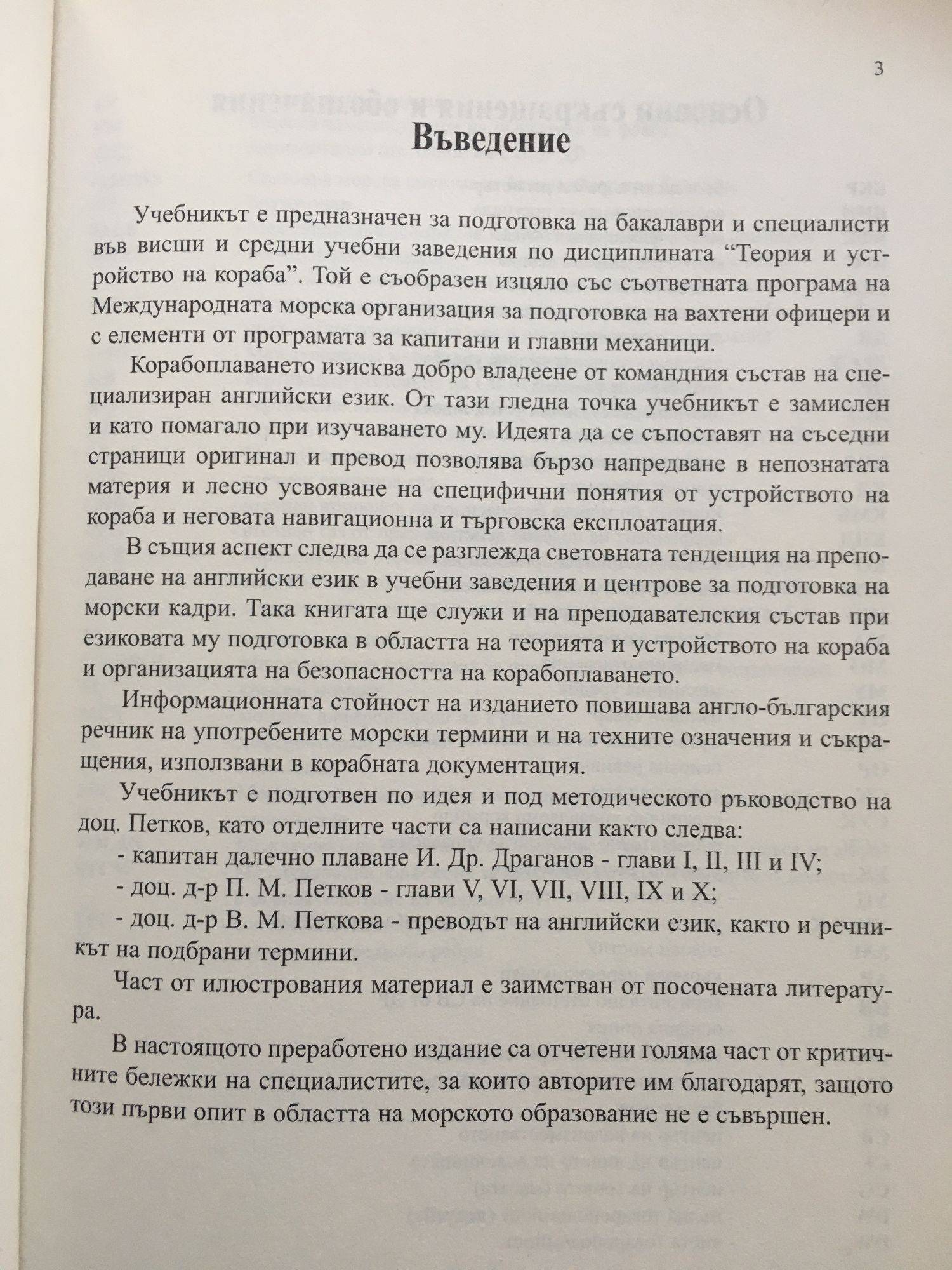 Учебникът е предназначен за подготовка на бакалаври и специалисти във висши и средни учебни заведения по дисциплината "Теория и устройство на кораба". Той е съобразен изцяло със съответната програма на Международната морска организация за подготовка на вахтени офицери и с елементи от програмата за капитани и главни механици. Корабоплаването изисква добро владеене от командния състав на специализиран английски език. От тази гледна точка учебникът е замислен и като помагало при изучаването му. Идеята да се съпоставят на съседни страници оригинал и превод позволява бързо напредване в непознатата материя и лесно усвояване на специфични понятия от устройството на кораба и неговата навигационна и търговска експлоатация. В същия аспект следва да се разглежда световната тенденция на преподаване на английски език в учебни заведения и центрове за подготовка на морски кадри. Така книгата ще служи и на преподавателския състав при езиковата му подготовка в областта на теорията и устройството на кораба и организацията на безопасността на корабоплаването. Информационната стойност на изданието повишава англо-българския речник на употребените морски термини и на техните означения и съкращения, използвани в корабната документация.