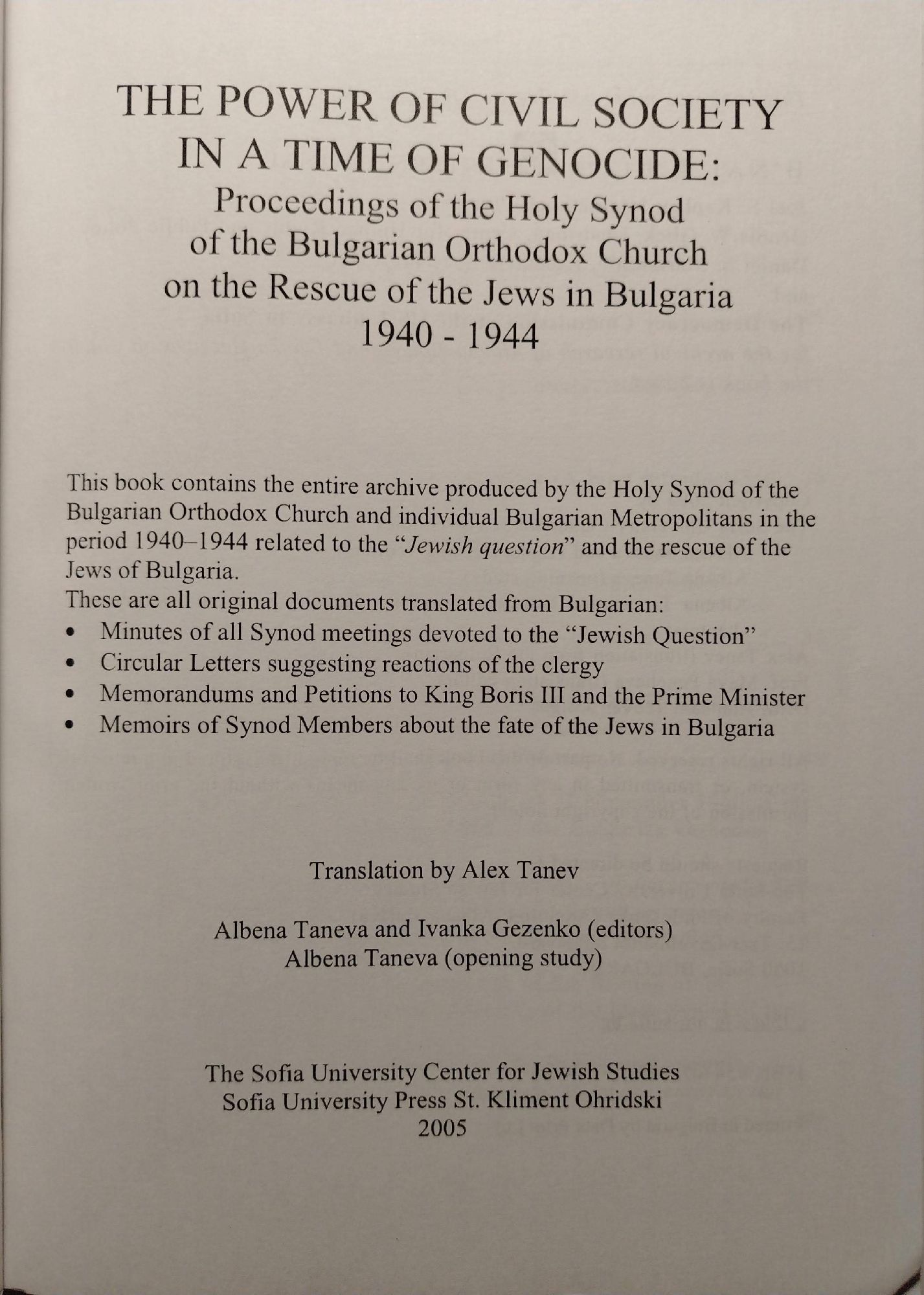 The Power of Civil Society in a Time of Genocide: Proceedings of the Holy Synod of the Bulgarian Orthodox Church on the Rescue of the Jews in Bulgaria 1940-1944