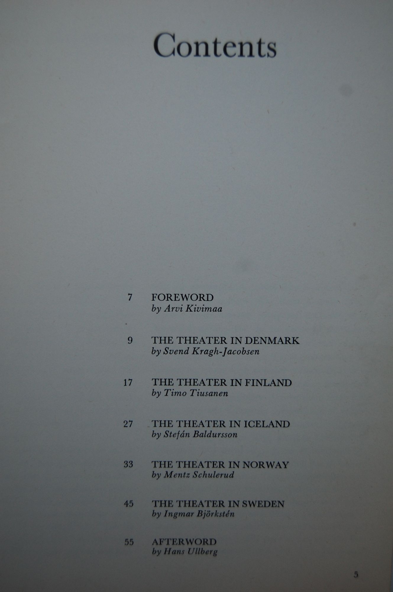 This book, in which every Scandinavian country (Denmark, Finland, Iceland, Norway and Sweden) presents the characteristics of its own theater, appears upon the initiative of The Scandinavian Theater Union (Nordisk Teaterunion), the central organization of the Scandinavian theater life. This work can be neither a theater history nor an encyclopedia of theater; it is a bundle of observations and conclusions written by various writer-personalities. Perhaps, however, it as such manifests the solidarity of the Scandinavian theaters. The theater is the sum of different endeavors in the Scandinavian democracies, where man is the measure of everything also in dramatic activities.