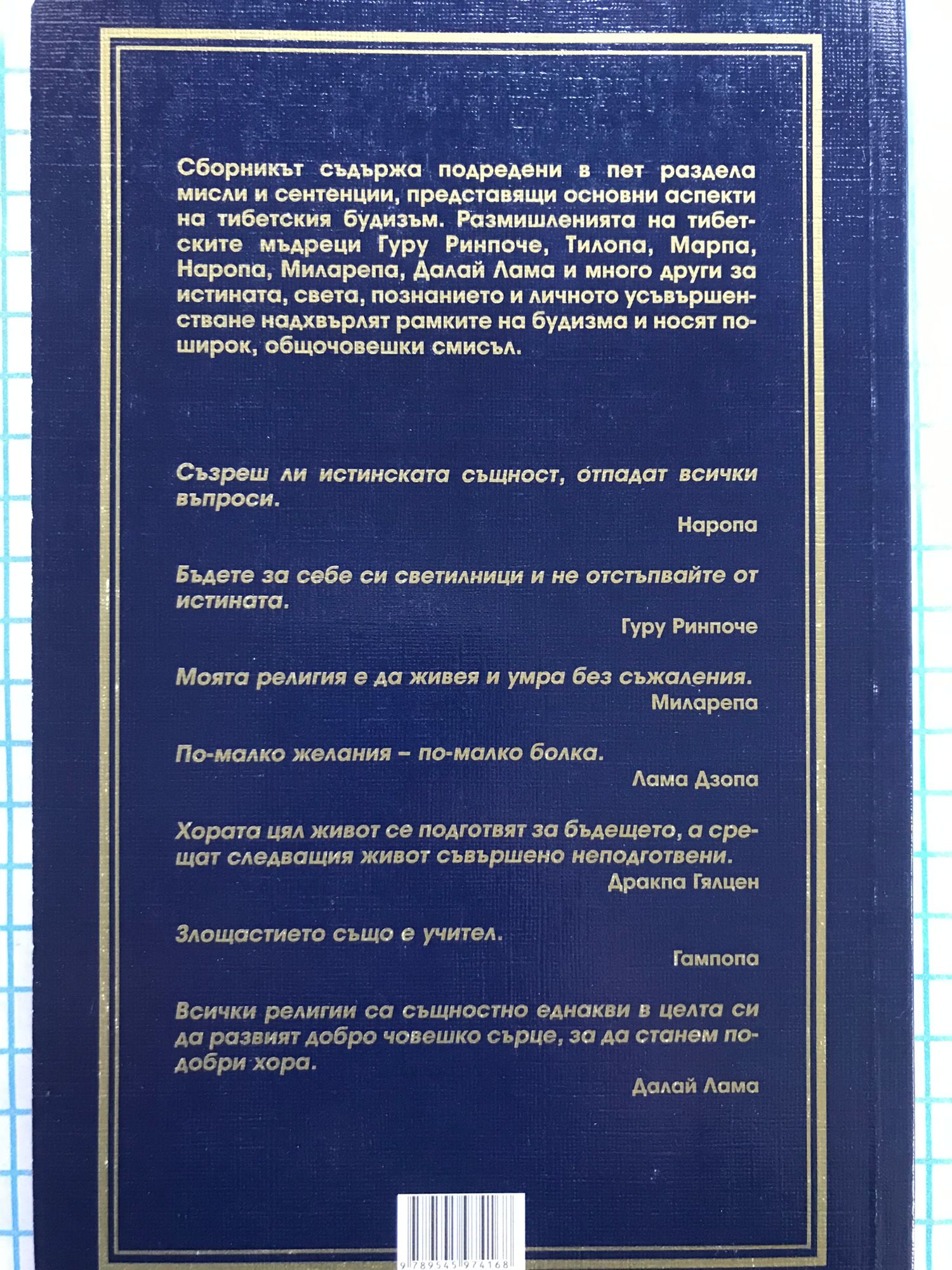 Сборникът съдържа подредени в пет раздела мисли и сентенции, представящи основни аспекти на тибетския будизъм. Размишленията на тибетските мъдреци Гуру Ринпоче, Тилопа, Марпа, Наропа, Миларепа, Далай Лама и много други за истината, света, познанието и личното усъвършенстване надхвърлят рамките на будизма и носят по-широк, общочовешки смисъл. "Съзреш ли истинската същност, отпадат всички въпроси.." Наропа "Бъдете за себе си светилници и не отстъпвайте от истината." Гуру Ринпоче "Моята религия е да живея и умра без съжаления." Миларепа "По-малко желания – по-малко болка." Лама Дзопа "Хората цял живот се подготвят за бъдещето, а срещат следващия живот съвършено неподготвени." Дракпа Гялцен "Злощастието също е учител." Гампопа "Всички религии са същностно еднакви в целта си да развият добро човешко сърце, за да станем по-добри хора." Далай Лама