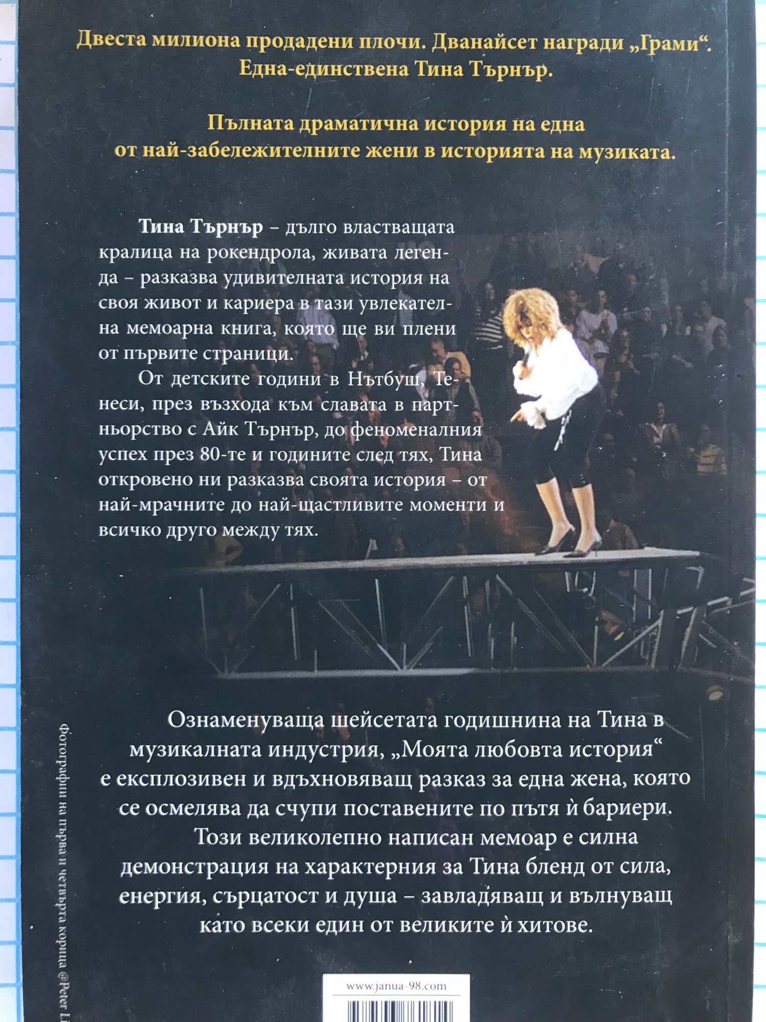 Двеста милиона продадени плочи. Дванайсет награди „Грами“. Една единствена Тина Търнър. Пълната, драматична история на една от най-забележителните жени в историята на музиката. Тина Търнър – дълго властващата кралица на рокендрола, живата легенда – разказва удивителната история на своя живот и кариера в тази увлекателна мемоарна книга, която ще ви плени от първите страници. От детските години в Нътбуш, Тенеси, до възхода към славата в партньорство с Айк Търнър, до феноменалния успех през 80-те и годините след тях, Тина откровено ни разказва своята история – от най-мрачните до най-щастливите моменти и всичко друго между тях. Ознаменуваща шейсетата годишнина на Тина в музикалната индустрия, „Моята любовна история“ е експлозивен и вдъхновяващ разказ за една жена, която се осмелява да счупи поставените по пътя ѝ бариери. Този великолепно написан мемоар е силна демонстрация на характерния за Тина бленд от сила, енергия, сърцатост и душа – завладяващ и вълнуващ като всеки един от великите ѝ хитове.