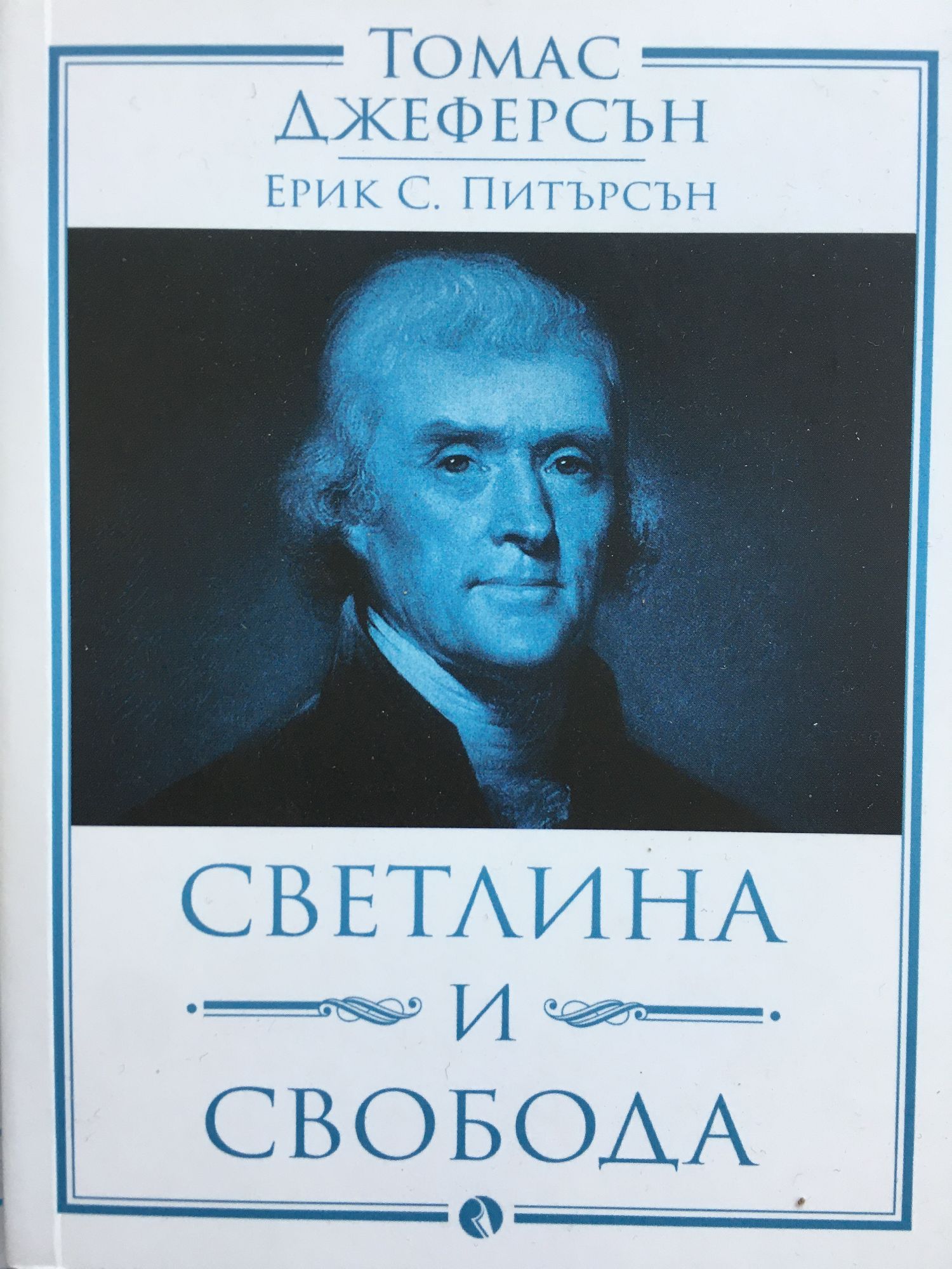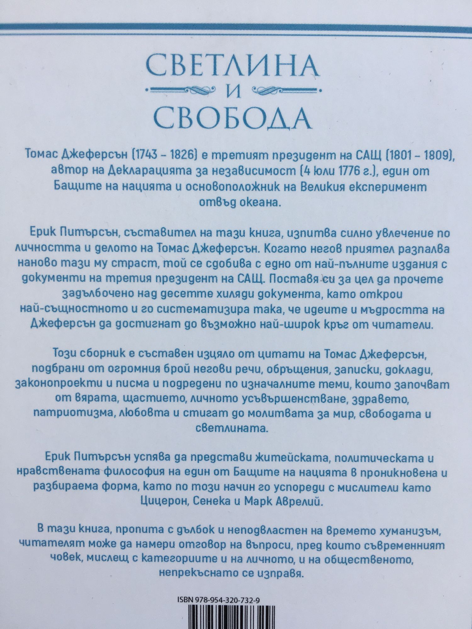 Томас Джеферсън (1743 – 1826) е третият президент на САЩ (1801 – 1809), автор на Декларацията за независимост (4 юли 1776 г.), един от Бащите на нацията и основоположник на Великия експеримент отвъд океана. Ерик Питърсън, съставител на тази книга, изпитва силно увлечение по личността и делото на Томас Джеферсън. Когато негов приятел разпалва наново тази му страст, той се сдобива с едно от най-пълните издания с документи на третия президент на САЩ. Поставя си за цел да прочете задълбочено над десетте хиляди документа, като открои най-същностното и до систематизира така, че идеите и мъдростта на Джеферсън да достигнат до възможно най-широк кръг от читатели. Този сборник е съставен изцяло от цитати на Томас Джеферсън, подбрани от огромния брой негови речи, обръщения, записки, доклади, законопроекти и писма и подредени по изначалните теми, които започват от вярата, щастието, личното усъвършенстване, здравето, патриотизма, любовта и стигат до молитвата за мир, свободата и светлината. Ерик Питърсън успява да представи житейската, политическата и нравствената философия на един от Бащите на нацията в проникновена и разбираема форма, като по този начин го успореди с мислители като Цицерон, Сенека и Марк Аврелий. В тази книга, пропита с дълбок и неподвластен на времето хуманизъм, читателят може да намери отговор на въпроси, пред които съвременният човек, мислещ с категориите и на личното, и на общественото, непрекъснато се изправя.