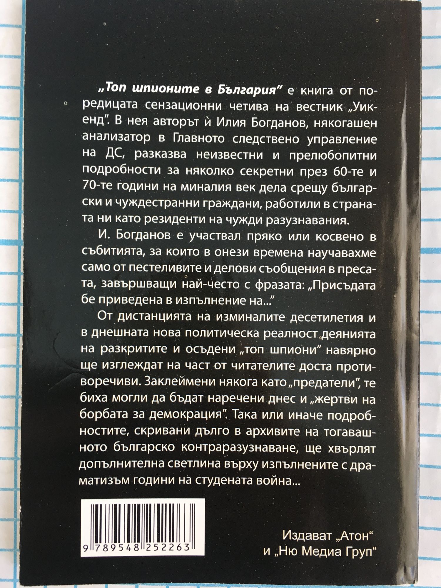 „Топ шпионите в България" е книга от поредицата сензационни четива на вестник „Уикенд". В нея авторът й Илия Богданов, някогашен анализатор в Главното следствено управление на ДС, разказва неизвестни и прелюбопитни подробности за няколко секретни през 60-те и 70-те години на миналия век дела срещу български и чуждестранни граждани, работили в страната ни като резиденти на чужди разузнавания. И. Богданов е участвал пряко или косвено в събитията, за които в онези времена научавахме само от пестеливите и делови съобщения в пресата, завършващи най-често с фразата: „Присъдата бе приведена в изпълнение на..." От дистанцията на изминалите десетилетия и в днешната нова политическа реалност деянията на разкритите и осъдени „топ шпиони" навярно ще изглеждат на част от читателите доста противоречиви. Заклеймени някога като „предатели", те биха могли да бъдат наречени днес и „жертви на борбата за демокрация". Така или иначе подробностите, скривани дълго в архивите на тогавашното българско контраразузнаване, ще хвърлят допълнителна светлина върху изпълнените с драматизъм години на студената война...