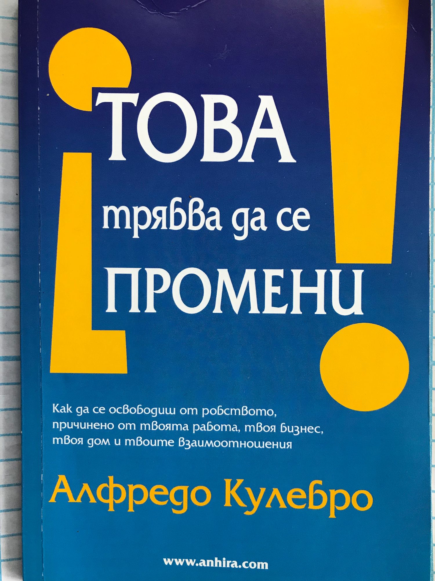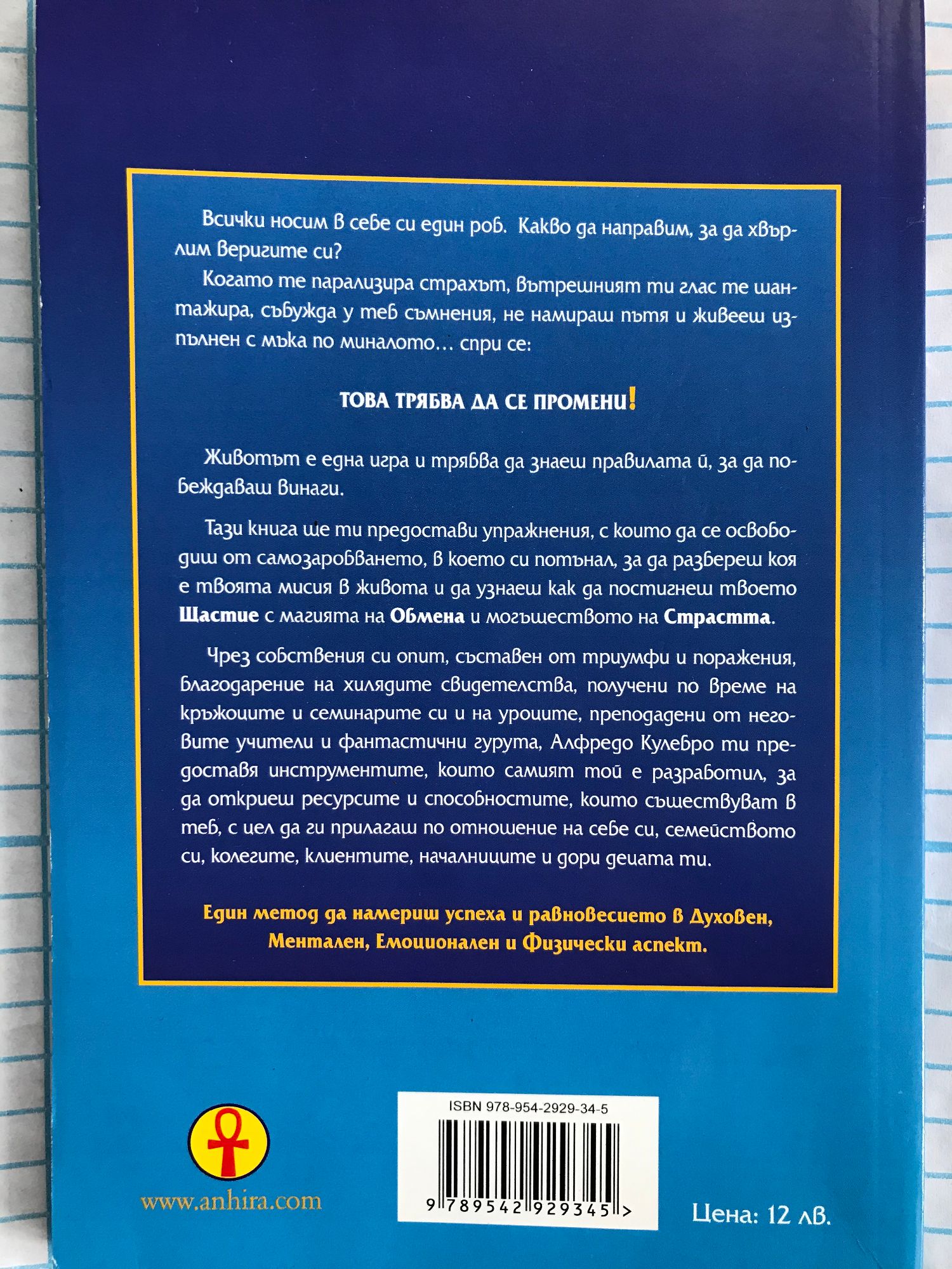 Всички носил в себе си един роб. Какво да направим, за да хвърлим веригите си? Когато те парализира страхът, вътрешният ти глас те шантажира, събужда у теб съмнения, не намираш пътя и живееш изпълнен с мъка по миналото.. спри се: Това трябва да се промени! Животът е една игра и трябва да знаеш правилата ѝ, за да побеждаваш винаги. Тази книга ще ти предостави упражнения, с които да се освободиш от самозаробването, в което си потънал, за да разбереш коя е твоята мисия в живота и да узнаеш как да постигнеш твоето Щастие, с магията на Обмена и могъществото на Страстта. Чрез собствения си опит, съставен от триумфи и поражения, благодарение на хилядите свидетелства, получени на по време на кръжоците и семинарите си и на уроците, получени от неговите учители и фантастични гурута, Алфредо Кулебро ти предоставя инструментите, които самият той е разработил, за да откриеш ресурсите и способностите, които съществуват в теб, с цел да ги прилагаш по отношение на себе си, семейството си, колегите, клиентите, началниците и дори децата ти.