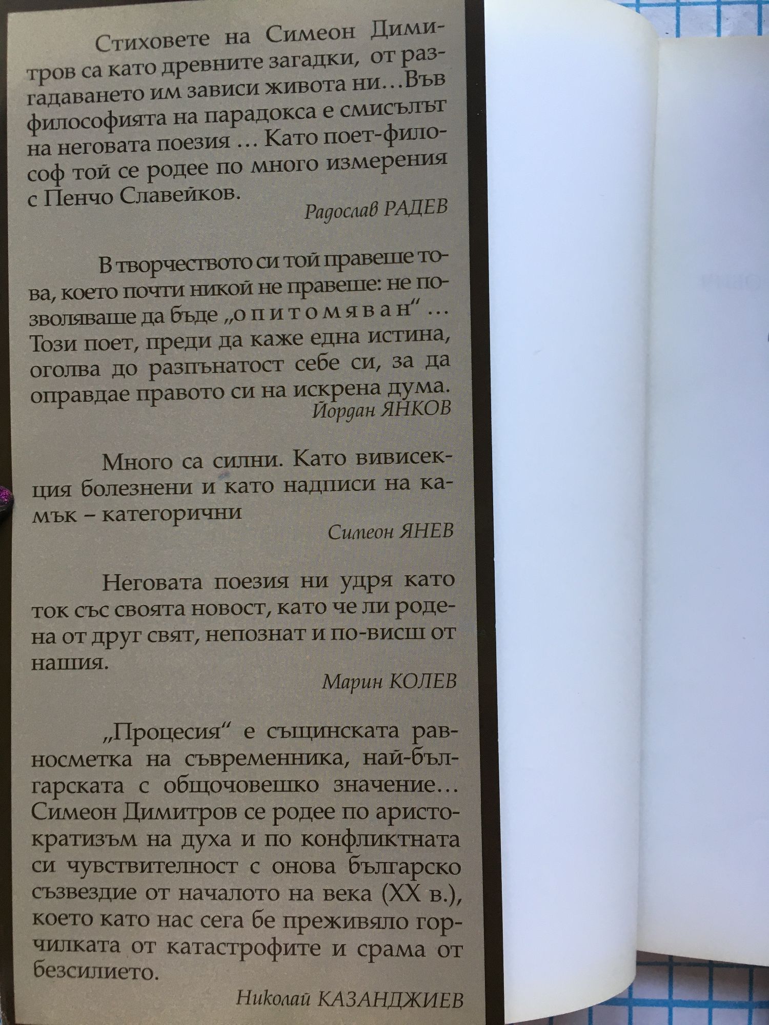 Стиховете на Симеон Димитров са като древните загадки, от разгадаването им зависи живота ни... Във философията на парадокса е смисълът на неговата поезия ... Като поет-философ той се родее по много измерения с Пенчо Славейков. Радослав РАДЕВ В творчеството си той правеше това, което почти никой не правеше; не позволяваше да бъде „опитомяван"... Този поет, преди да каже една истина, оголва до разпънатост себе си, за да оправдае правото си на искрена дума. Йордан ЯНКОВ Много са силни. Като вивисекция болезнени и като надписи на камък - категорични Симеон ЯНЕВ Неговата поезия ни удря като ток със своята новост, като че ли родена от друг свят, непознат и по-висш от нашия. Марин КОЛЕВ "Процесия" е същинската равносметка на съвременника, най-българската с общочовешко значение... Симеон Димитров се родее по аристократизъм на духа и по конфликтната си чувствителност с онова българско съзвездие от началото на века (XX в.), което като нас сега бе преживяло горчилката от катастрофите и срама от безсилието. Николай КАЗАНДЖИЕВ