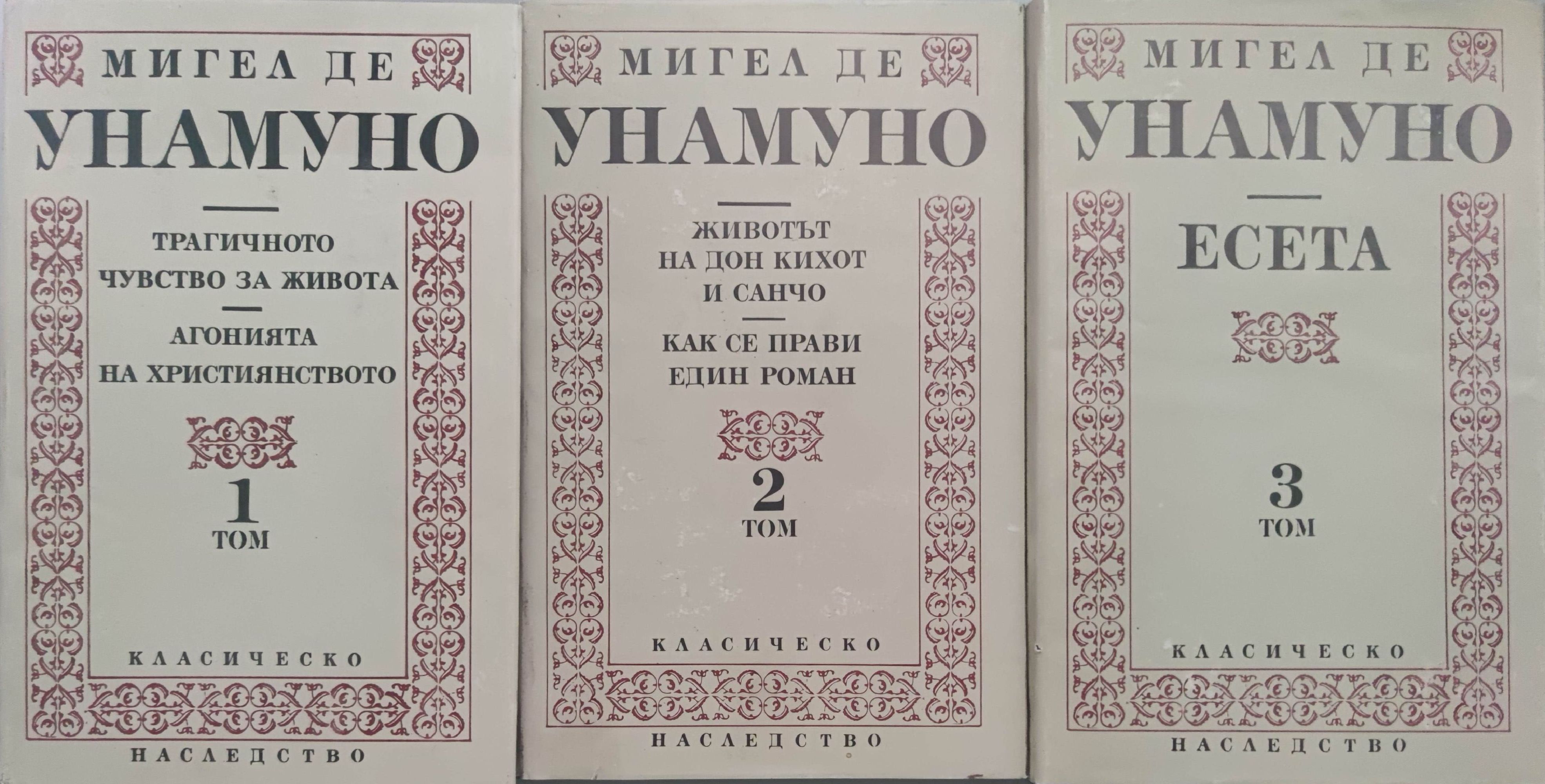 Трагичното чувство за живота (1913). Агонията на християнството (1924). Животът на Дон Кихот и Санчо (1905). Как се прави един роман (1927). Есета (1896-1912)