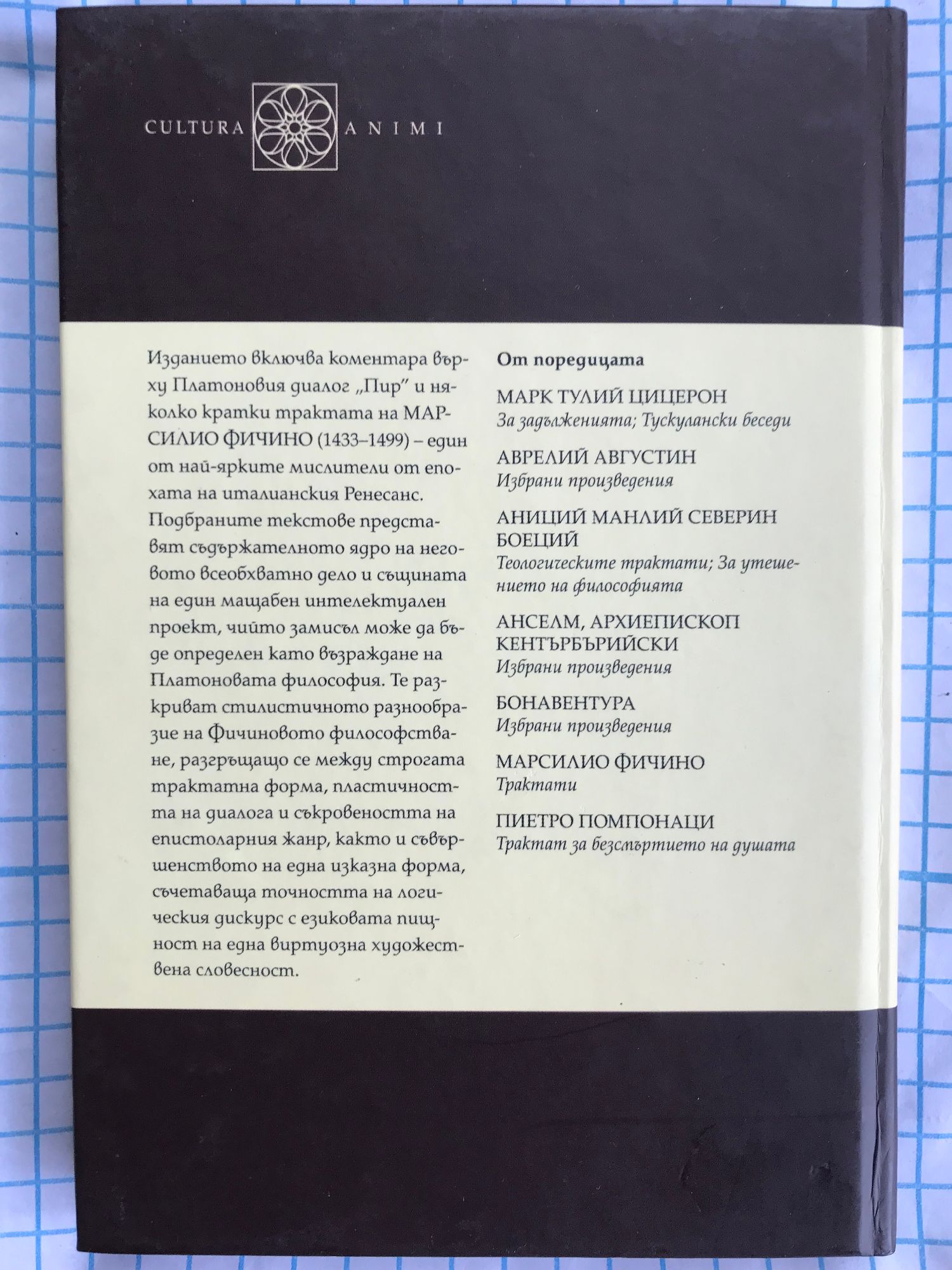 Изданието включва коментара върху Платоновия диалог „Пир" и няколко кратки трактата на МАРСИЛИО ФИЧИНО (1433-1499) - един от най-ярките мислители от епохата на италианския Ренесанс. Подбраните текстове представят съдържателното ядро на неговото всеобхватно дело и същината на един мащабен интелектуален проект, чийто замисъл може да бъде определен като възраждане на Платоновата философия. Те разкриват стилистичното разнообразие на Фичиновото философстване, разгръщащо се между строгата трактатна форма, пластичността на диалога и съкровеността на епистоларния жанр, както и съвършенството на една изказна форма, съчетаваща точността на логическия дискурс с езиковата пищност на една виртуозна художествена словесност.