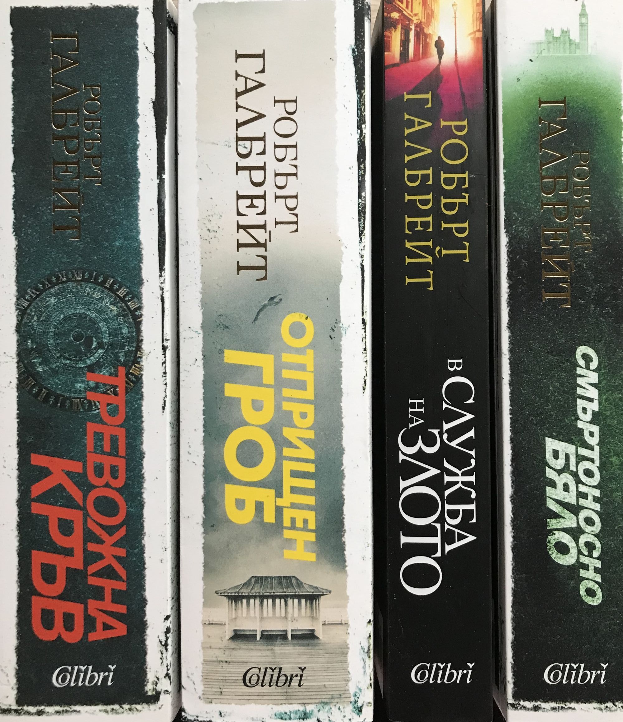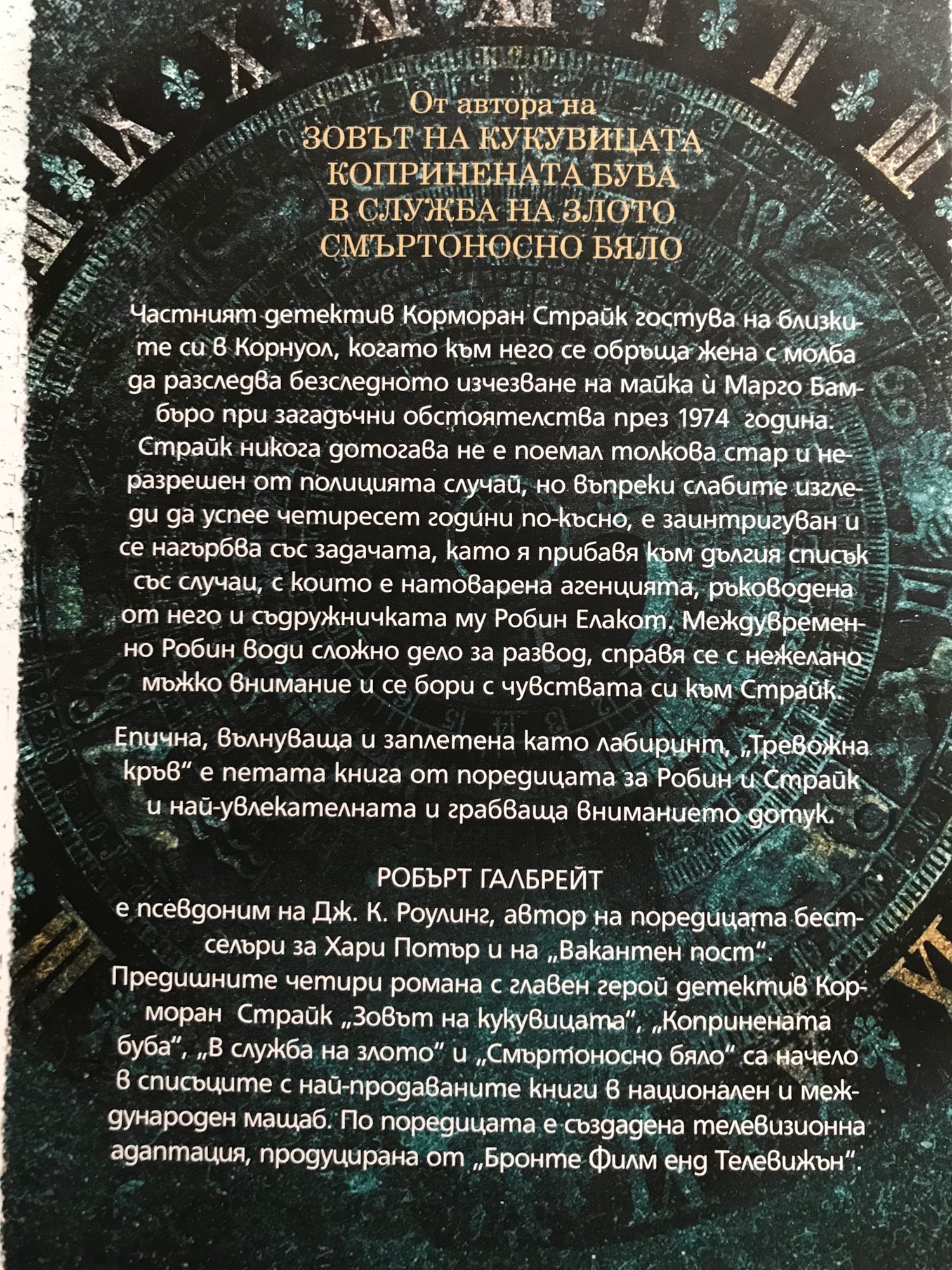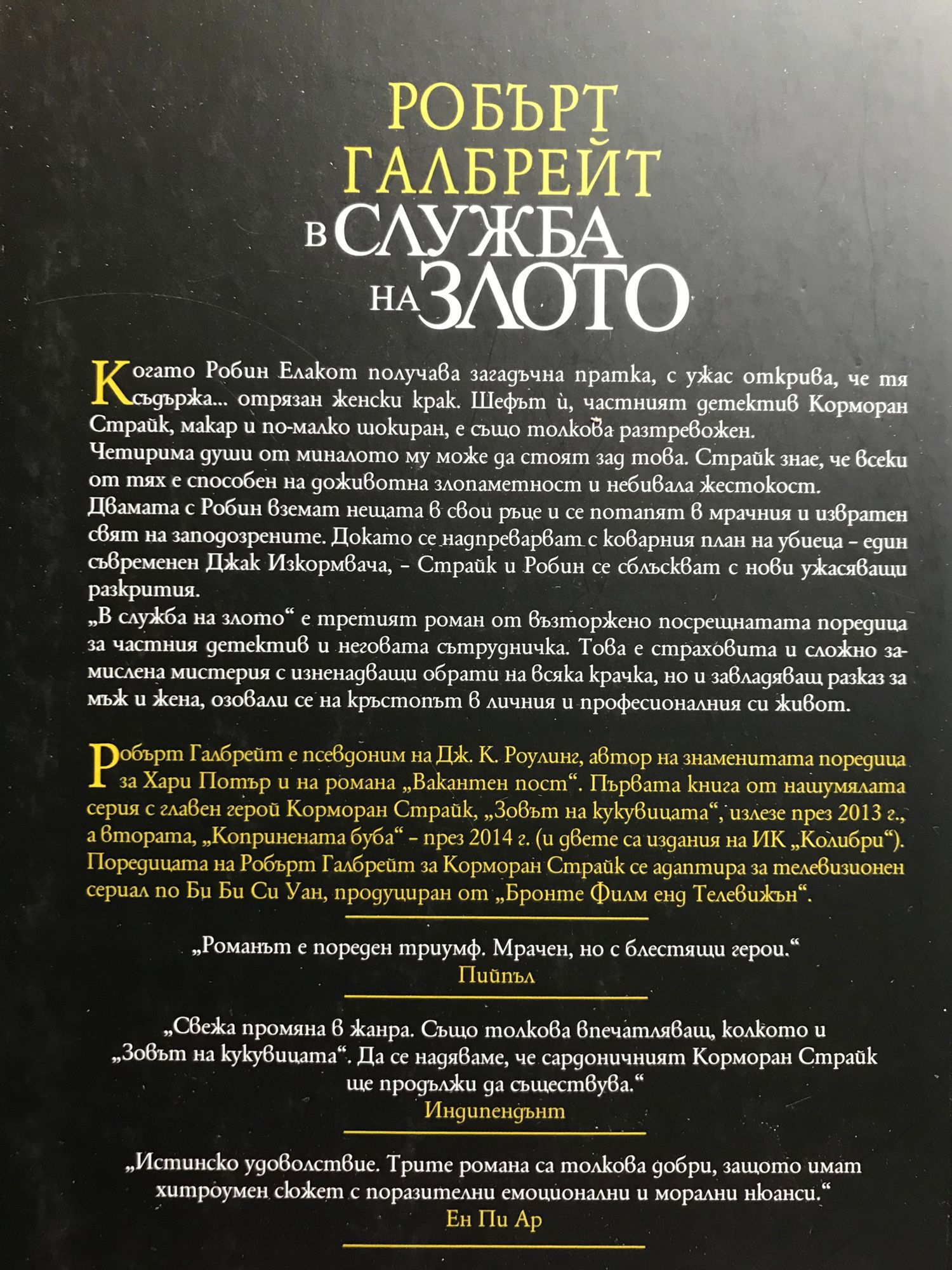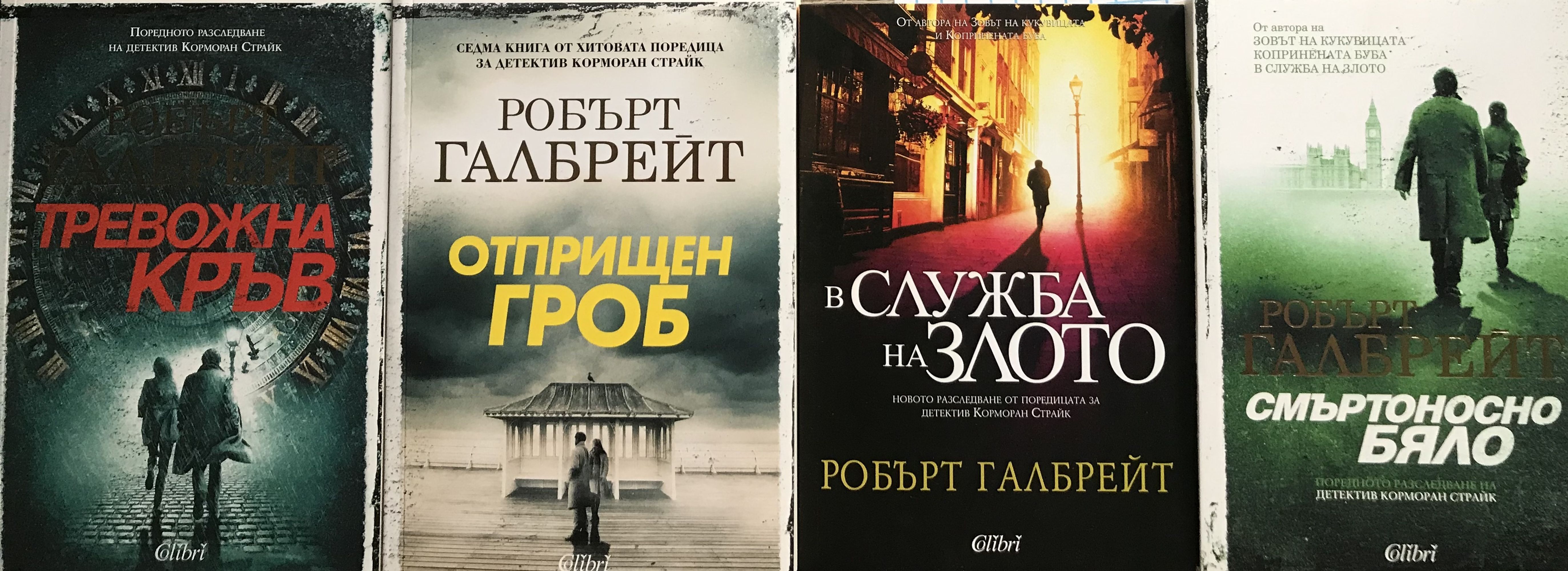 Книга 1: Частният детектив Корморан Страйк гостува на близките си в Корнуол, когато към него се обръща жена с молба да разследва безследното изчезване на майка й Марго Бамбъро при загадъчни обстоятелства през 1974 година. Страйк никога дотогава не е поемал толкова стар и неразрешен от полицията случай, но въпреки слабите изгледи да успее четиресет години по-късно, е заинтригуван и се нагърбва със задачата, като я прибавя към дългия списък със случаи, с които е натоварена агенцията, ръководена от него и съдружничката му Робин Елакот. Междувременно Робин води сложно дело за развод, справя се с нежелано мъжко внимание и се бори с чувствата си към Страйк. Епична, вълнуваща и заплетена като лабиринт, „Тревожна кръв“ е петата от поредицата за Робин и Страйк и най-увлекателната и грабваща вниманието дотук. Книга 2: С детектив Корморан Страйк се свързва разтревожен баща, чийто син аутист се е присъединил към Универсалната хуманитарна църква, религиозна общност, обитаваща изолиран кът в Източна Англия. Зад благовидната маска на благотворителност и борба в името на един по-добър свят прозират финансови изнудвания, унизително третиране на последователите, физическо и сексуално насилие, необясними смъртни случаи. За да спаси момчето, впримчено в опасен капан, съдружничката на Страйк, Робин Елакот, прониква в средите на Църквата и заживява инкогнито сред членовете й. Ала тя не е подготвена за дебнещите рискове и за жертвите, които ще й струва това начинание... Заглавието „Отприщен гроб“ и епиграфите към всяка глава, заимствани от класическата китайска „Книга на промените“, привнасят допълнителен метафоричен и тълкувателен щрих към посланията на този психологически и социален трилър. Поредният неустоим пейдж-търнър, свидетелство за разказваческата дарба на Робърт Галбрейт. Динамичен, завладяващ и ужасяващ. В. „Дейли Мейл“ Книга 3: Когато Робин Елакот получава загадъчна пратка, с ужас открива, че тя съдържа… отрязан женски крак. Шефът й, частният детектив Корморан Страйк, макар и по-малко шокиран, е също толкова разтревожен. Четирима души от миналото му може да стоят зад това. Страйк знае, че всеки от тях е способен на доживотна злопаметност и небивала жестокост. Двамата с Робин вземат нещата в свои ръце и се потапят в мрачния и извратен свят на заподозрените. Докато се надпреварват с коварния план на убиеца – един съвременен Джак Изкормвача – Страйк и Робин се сблъскват с нови ужасяващи разкрития. „В служба на злото“ е третият роман от възторжено посрещнатата поредица за частния детектив и неговата сътрудничка. Това е страховита и сложно замислена мистерия с изненадващи обрати на всяка крачка, но и завладяващ разказ за мъж и жена, озовали се на кръстопът в личния и професионалния си живот. „Романът е пореден триумф. Мрачен, но с блестящи герои.“ Пийпъл „Свежа промяна в жанра. Също толкова впечатляващ, колкото и „Зовът на кукувицата“. Да се надяваме, че сардоничният Корморан Страйк ще продължи да съществува.“ Индипендънт "Истинско удоволствие. Трите романа са толкова добри, защото имат хитроумен сюжет с поразителни емоционални и морални нюанси." Ен Пи Ар Книга 4: „Смъртоносно бяло“ е четвъртият роман от поредицата за разследванията на Корморан Страйк и Робин Елакот на Дж. К. Роулинг, написан под псевдонима Робърт Галбрейт. Този път съдр