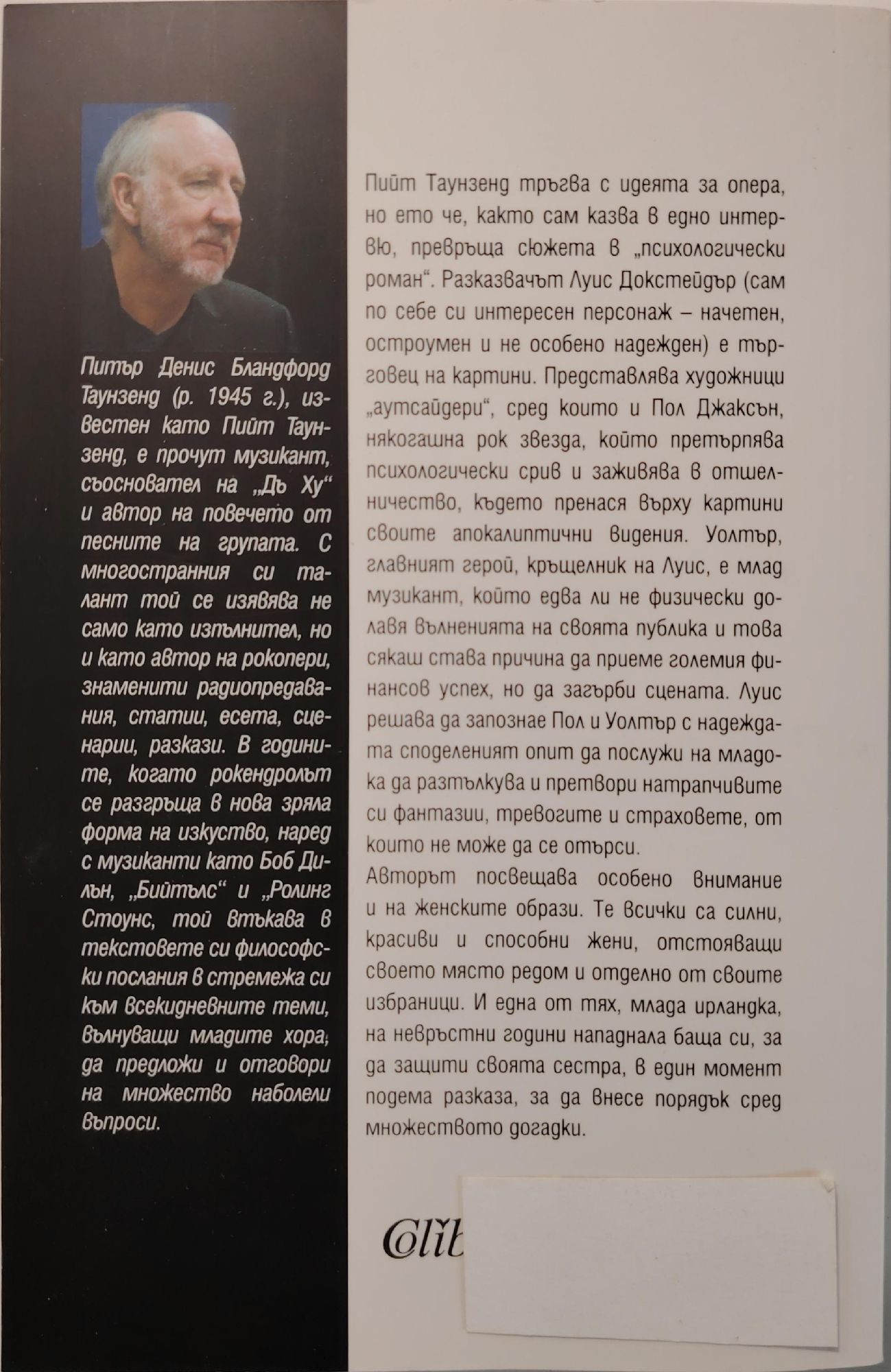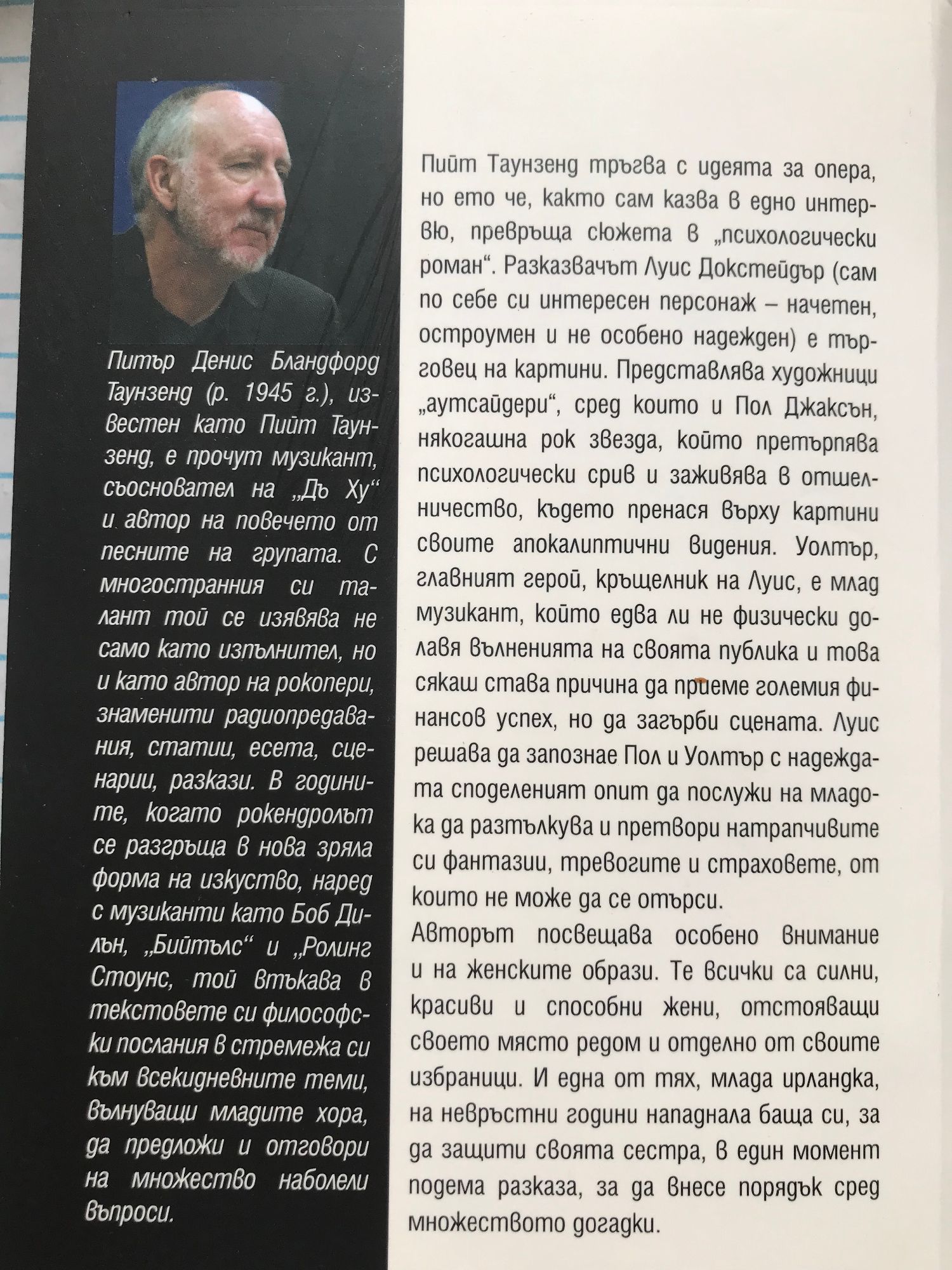 Пийт Таунзенд тръгва с идеята за опера, но ето че, както сам казва в едно интервю, превръща сюжета в "психологически роман". Разказвачът Луис Докстейдър (сам по себе си интересен персонаж - начетен, остроумен и не особено надежден) е търговец на картини. Представлява художници "аутсайдери", сред които и Пол Джаксън, някогашна рок звезда, който претърпява психологически срив и заживява в отшелничество, където пренася върху картини своите апокалиптични видения. Уолтър, главният герой, кръщелник на Луис, е млад музикант, който едва ли не физически долавя вълненията на своята публика и това сякаш става причина да приеме големия финансов успех, но да загърби сцената. Луис решава да запознае Пол и Уолтър с надеждата споделеният опит да послужи на младока да разтълкува и претвори натрапчивите си фантазии, тревогите и страховете, от които не може да се отърси. Авторът посвещава особено внимание и на женските образи. Те всички са силни, красиви и способни жени, отстояващи своето място редом и отделно от своите избраници. И една от тях, млада ирландка, на невръстни години нападнала баща си, за да защити своята сестра, в един момент подема разказа, за да внесе порядък сред множеството догадки, защото разказвачът е твърде изтощен от безбройните неочаквани обрати.