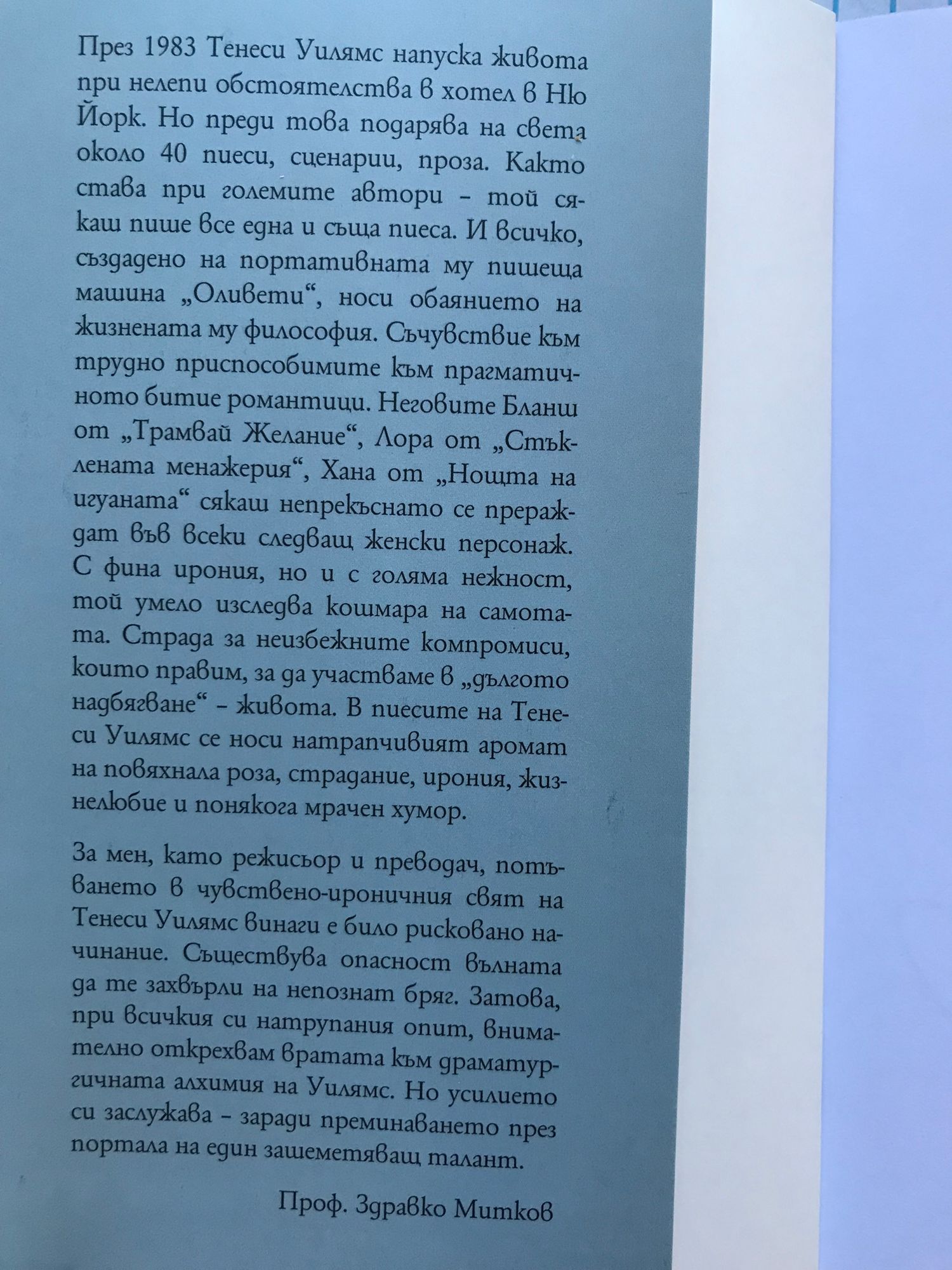През 1983 Тенеси Уилямс напуска живота при нелепи обстоятелства в хотел в Ню Йорк. Но преди това подарява на света около 40 пиеси, сценарии и проза. Както става при големите автори - той сякаш пише все една и съща пиеса. И всичко, създадено на портативната му пишеща машина „Оливети“, носи обаянието на жизнената му философия. Съчувствие към трудно приспособимите към прагматичното битие романтици. Неговите Бланш от „Трамвай Желание“, Лора от „Стъклената менажерия“, Хана от „Нощта на игуаната“ сякаш непрекъснато прераждат във всеки следващ женски персонаж. С фина ирония, но и с голяма нежност, той умело изследва кошмара на самотата. Страда за неизбежните компромиси, които правим, за да участваме в „дългото надбягване“ - живота. В пиесите на Тенеси Уилямс се носи натрапчивият аромат на повяхнала роза, страдание, ирония, жизнелюбие и понякога мрачен хумор. За мен като режисьор и преводач, потъването в чувствено-ироничния свят на Тенеси Уилямс винаги е било рисковано начинание. Съществува опасност вълната да те захвърли на непознат бряг. Затова, при всичкия си натрупан опит внимателно открехвам вратата към драматургичната алхимия на Уилямс. Но усилието си заслужава заради преминаването през портала на един зашеметяващ талант. - Проф. Здравко Митков