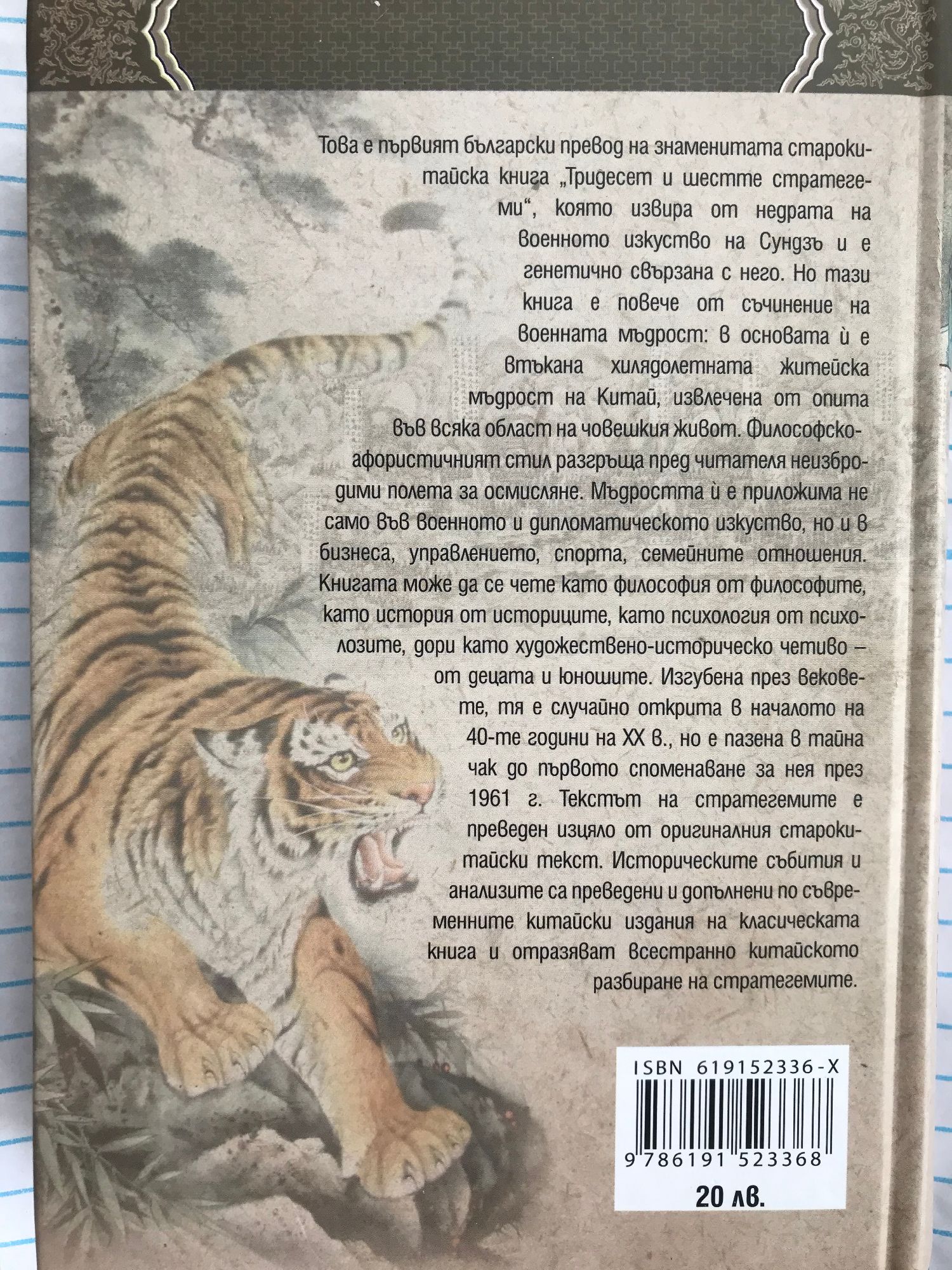 Това е първият български превод на знаменитата старокитайска книга "Тридесет и шестте стратегеми", която извира от недрата на военното изкуство на "Сун Дзъ" и е генетично свързана с него. Но тази книга е повече от съчинение на военната мъдрост: в основата ѝ е втъкана хилядолетната житейска мъдрост на Китай, извлечена от опита във всяка област на човешкия живот. Философско-афористичният стил разгръща пред читателя неизбродими полета за осмисляне. Мъдростта ѝ е приложима не само във военното и дипломатическото изкуство, но и в бизнеса, управлението, спорта, семейните отношения. Книгата може да се чете като философия от философите, като история от историците, като психология от психолозите, дори като художествено-историческо четиво – от децата и юношите. Изгубена през вековете, тя е случайно открита в началото на 40-те години на ХХ в., но е пазена в тайна чак до първото споменаване за нея през 1961 г. Текстът на стратегемите е преведен изцяло от оригиналния старокитайски текст. Историческите събития и анализите са преведени и допълнени по съвременните китайски издания на класическата книга и отразяват всестранно китайското разбиране на стратегемите.
