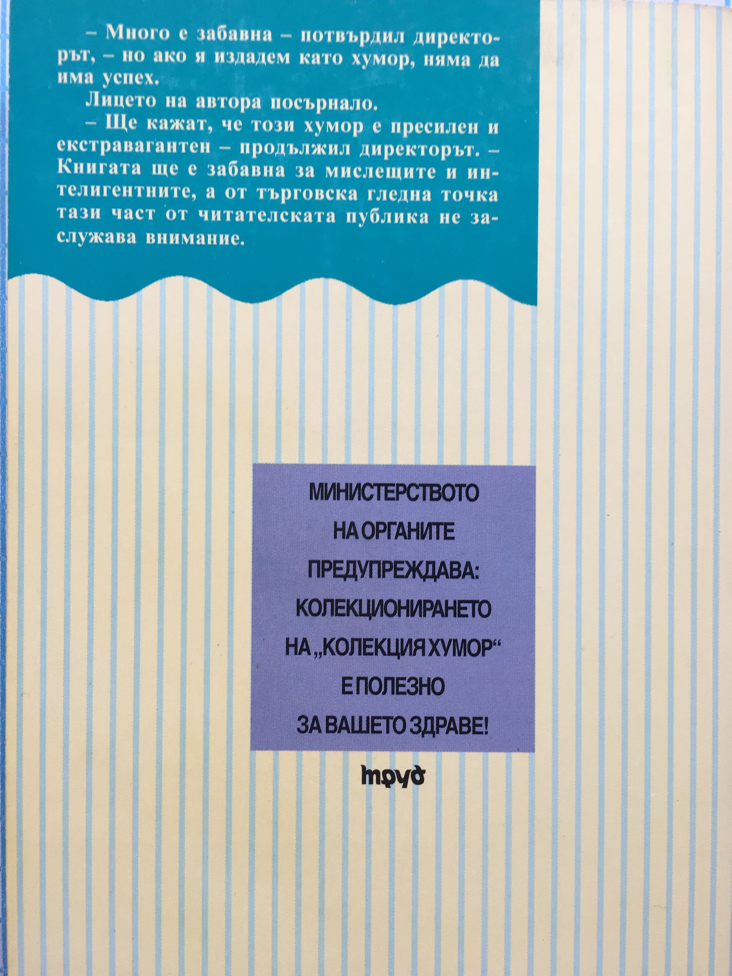 - Много е забавна - потвърдил директорът, - но ако я издадем като хумор няма да има успех. Лицето на автора посърнало. - Ще кажат, че този хумор е пресилен и екстравагантен - продължил директорът. - Книгата ще е забавна за мислещите и интелигентните, а от търговска гледна точка тази част от читателската публика не заслужава внимание.