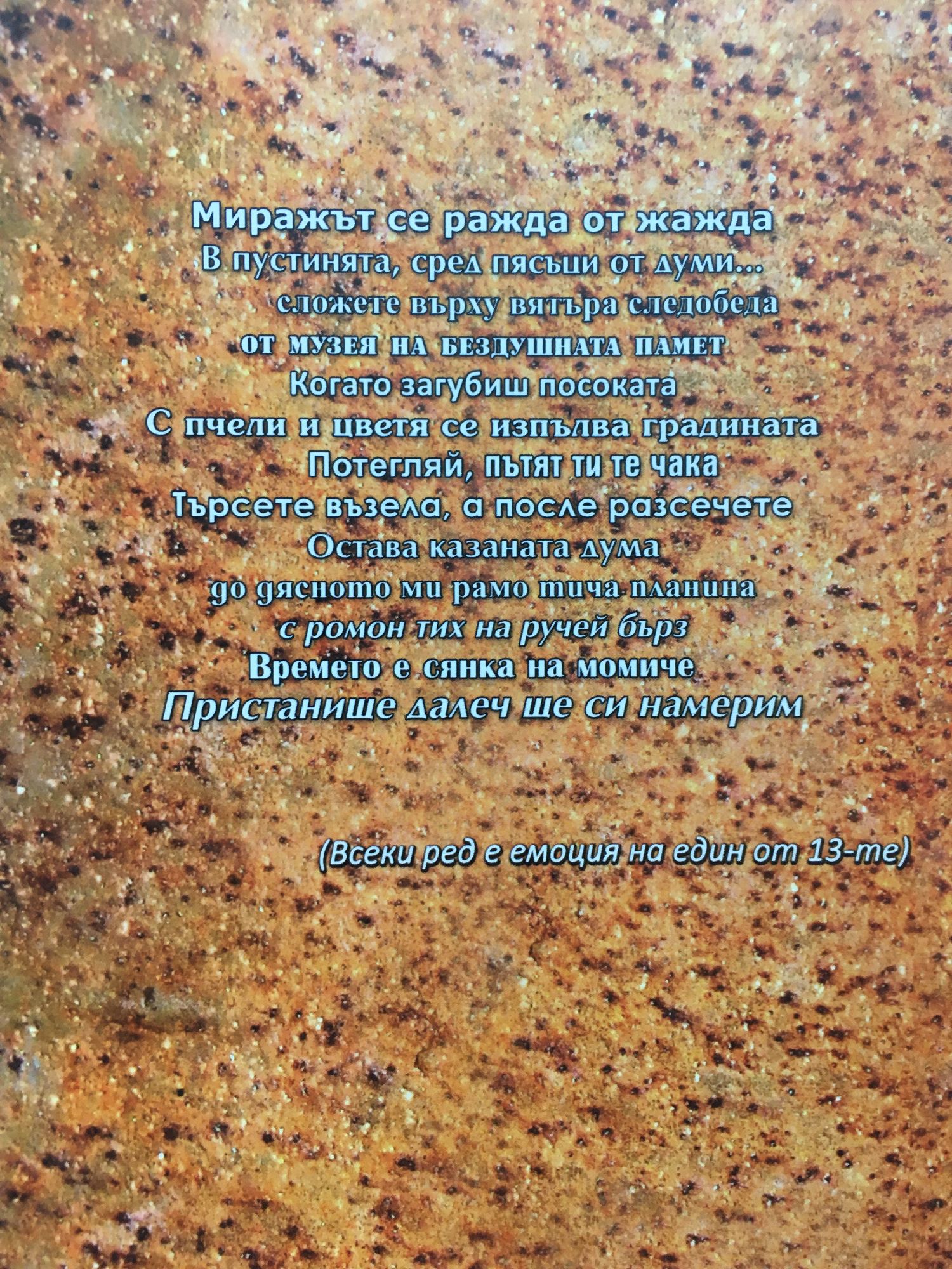 Миражът се ражда от жажда В пустинята, сред пясъци от думи... сложете върху вятъра следобеда от музея на бездушната памет Когато загубиш посоката С пчели и цветя се изпълва градината Потегляй, пътят ти те чака Търсете възела, а после разсечете Остава казаната дума до дясното ми рамо тича планина с ромон тих на ручей бърз Времето е сянка на момиче Пристанище далеч ще си намерим (Всеки ред е емоция на един от 13-те)