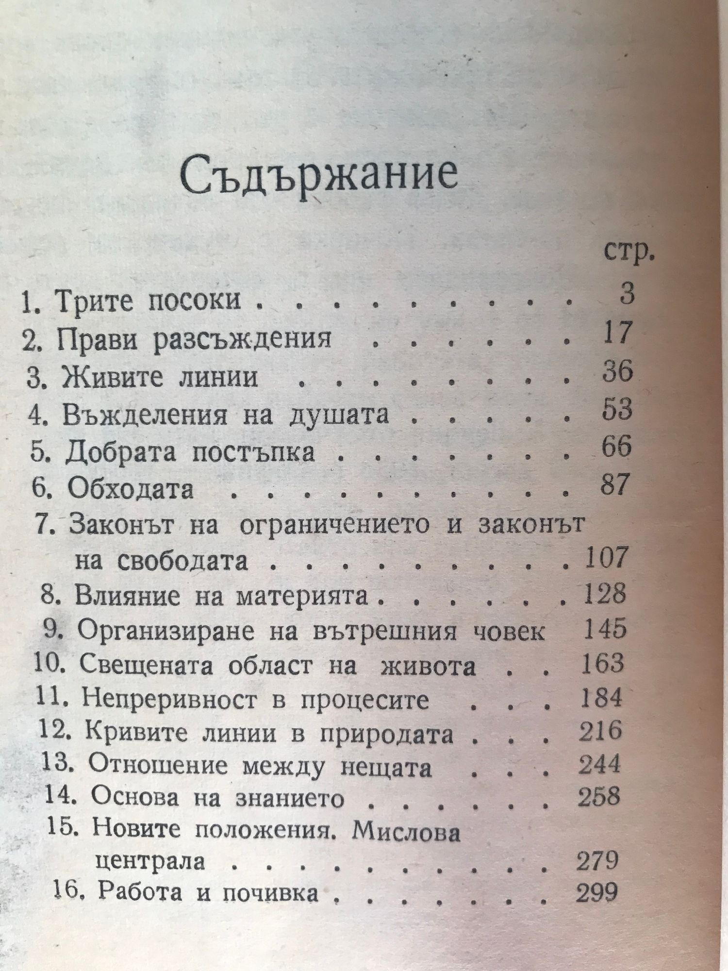 Съдържание: 1. Трите посоки..........................................................................стр. 3 2. Прави разсъждения.............................................................стр. 17 3. Живите линии........................................................................стр. 36 4. Въжделения на душата........................................................стр. 53 5. Добрата постъпка.................................................................стр. 66 6. Обходата.................................................................................стр. 87 7. Законът на ограничението и законът на свободата.......стр. 107 8. Влияние на материята..........................................................стр. 128 9. Организиране на вътрешния човек..................................стр. 145 10. Свещената област на живота...........................................стр. 163 11. Непреривност в процесите...............................................стр. 184 12. Кривите линии в природата..............................................стр. 216 13. Отношение между нещата................................................стр. 244 14. Основа на знанието...........................................................стр. 258 15. Новите положения. Мислова централа.........................стр. 279 16. Работа и почивка...............................................................стр. 299
