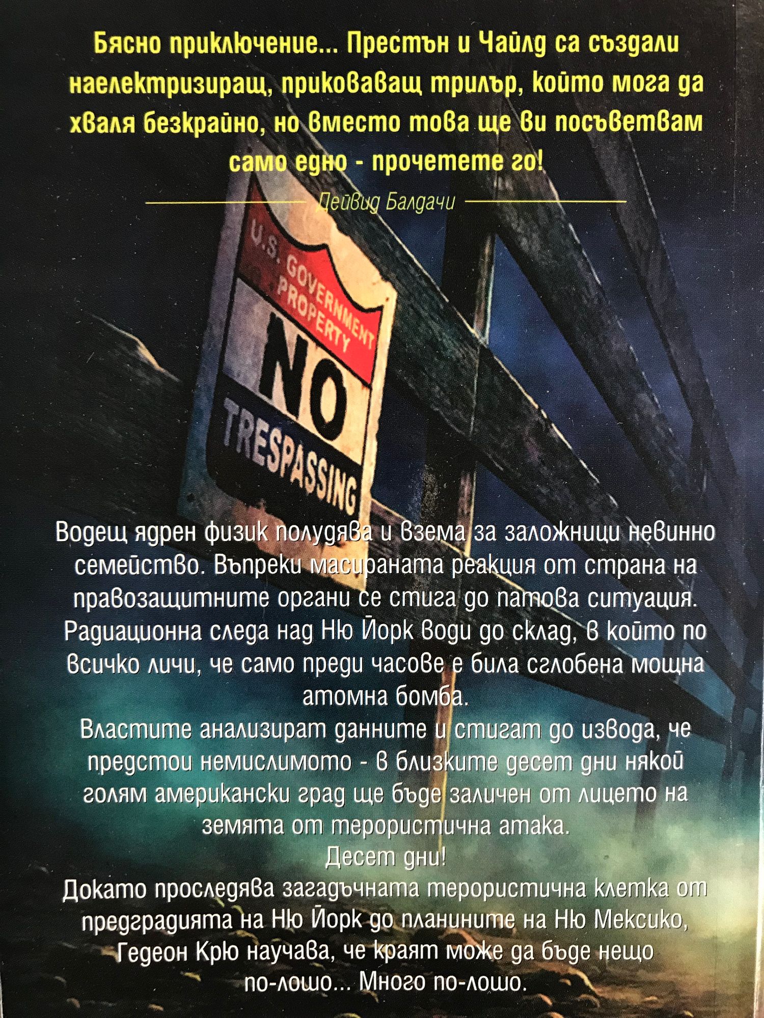 Водещ ядрен физик полудява и взема за заложници невинно семейство. Въпреки масираната реакция от страна на правозащитните органи се стига до патова ситуация. Радиационна следа над Ню Йорк води до склад, в който по всичко личи, че само преди часове е била сглобена мощна атомна бомба. Властите анализират данните и стигат до извода, че предстои немислимото - в близките десет дни някой голям американски град ще бъде заличен от лицето на земята от терористична атака. Десет дни! Докато проследява загадъчната терористична клетка от предградията на Ню Йорк до планините на Ню Мексико Гедеон Крю научава, че краят може да бъде нещо по-лошо... Много по-лошо. "Бясно приключение...Престън и Чайлд са създали наелектризиращ, приковаващ трилър, който мога да хваля безкрайно, но вместо това ще ви посъветвам само едно - прочетете го!" Дейвид Балдачи