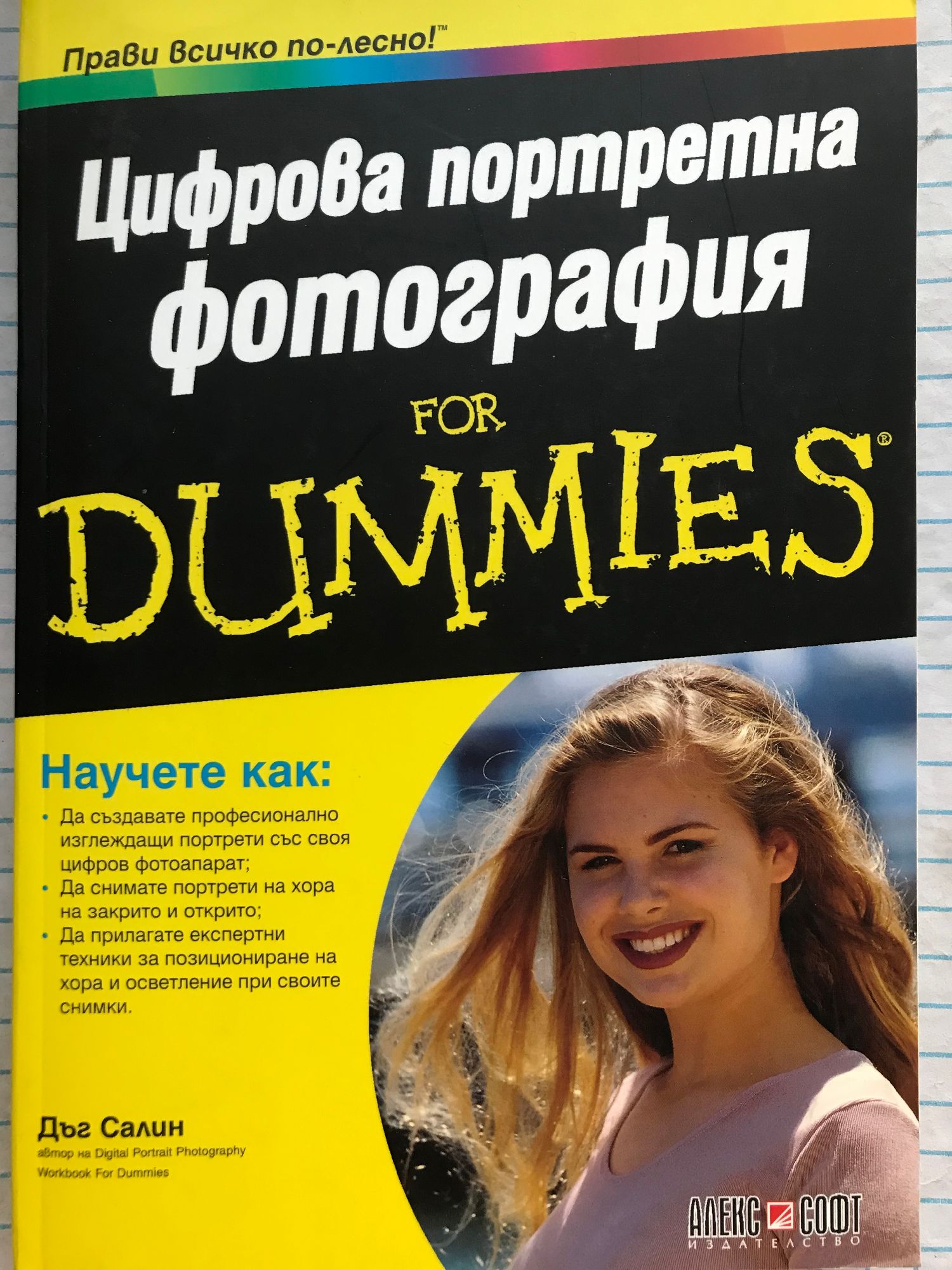 Прави всичко по-лесно! Научете професионални техники за заснемане на страхотни портрети на деца, домашни любимци и цели семейства. Ако е направен правилно, добрият портрет улавя много повече от това как изглежда човек: той разкрива и част от неговия живот и характер. Този наръчник ще ви покаже как да накарате това да се случи, чрез съвети за оборудване и осветление, насоки за работа с различни обекти, информация за това, как да избирате най-подходящите места за снимки и инструкции за усъвършенстване вида на изображенията при свалянето им на компютър. Изберете правилното оборудване. Научете какво да търсите в идеалния фотоапарат, както и какви да бъдат обективите, филтрите и източниците на светлина Вижте своя обект. Усъвършенствайте уменията си за наблюдение, като обръщате внимание на заобикалящия ви свят и на хората около вас Място, място, място. Разположете своя обект в естествената му среда, която трябва да разкрива нещо за него Борете се с предизвикателствата. Разкрийте тайните за заснемането на бебета, малки деца и домашни любимци, особено котки Направете изображенията си дори по-добри. Засилете ефектите, които сте създали чрез подходящо подрязване, оразмеряване и ретуширане на снимките Отворете книгата и открийте: Важни подробности за композицията на снимката Как да работите с реквизит за снимане Различни подходи към осветлението и резултатите, до които водят те Съвети как да се възползвате от обстановката, в която ще снимате Какво различава един портрет от моментна снимка Как да използвате фокусна дължина и апертура Десет топ съвета за редактиране на изображения Какво е хистограма и как да я използвате Дъг Салин ръководи фотографски бизнес, като е специализирал в създаването на снимки по специални поводи като сватби и портрети. Той е автор и на наръчника "Digital Photography Workbook For Dummies" и съавтор на "Building Web Sites All-in-One For Dummies". Портфолиото на Дъг включва официални и неофициални портрети на хора.