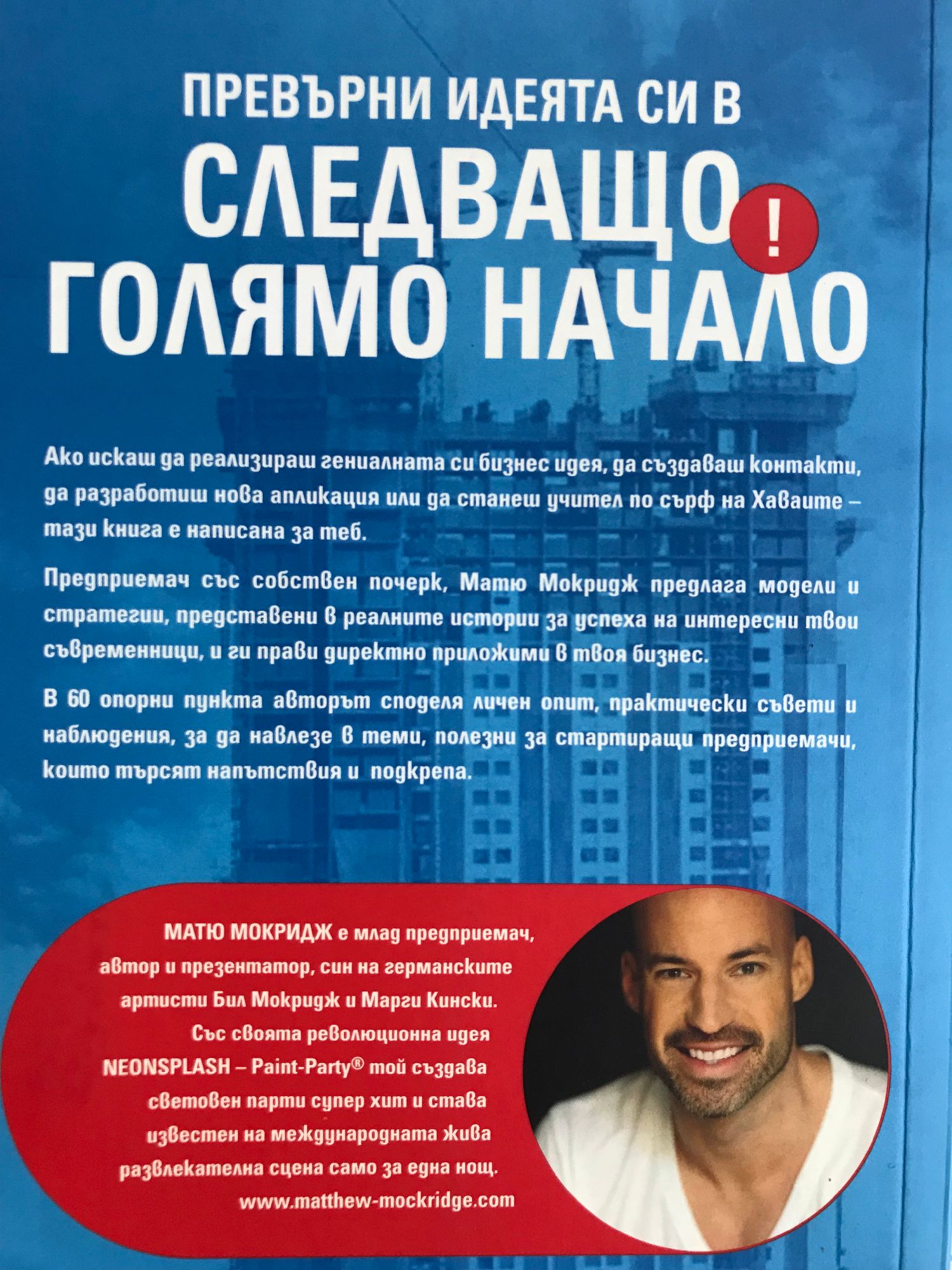 Ако искаш да реализираш гениалната си бизнес идея, да създаваш контакти, да разработиш нова апликация или да станеш учител по сърф на Хаваите - тази книга е написана за теб. Предприемач със собствен почерк, Матю Мокридж предлага модели и стратегии, представени в реалните истории за успеха на интересни твои съвременници, и ги прави директно приложими в твоя бизнес. В 60 опорни пункта авторът споделя личен опит, практически съвети и наблюдения, за да навлезе в теми, полезни за стартиращи предприемачи, които търсят напътствия и подкрепа. Матю Мокридж е млад предприемач, автор и презентатор, син на германските артисти Бил Мокридж и Марги Кински. Със своята революционна идея NEONSPLASH-Paint-Party той създава световен парти супер хит и става известен на международната жива развлекателна сцена само за една нощ.