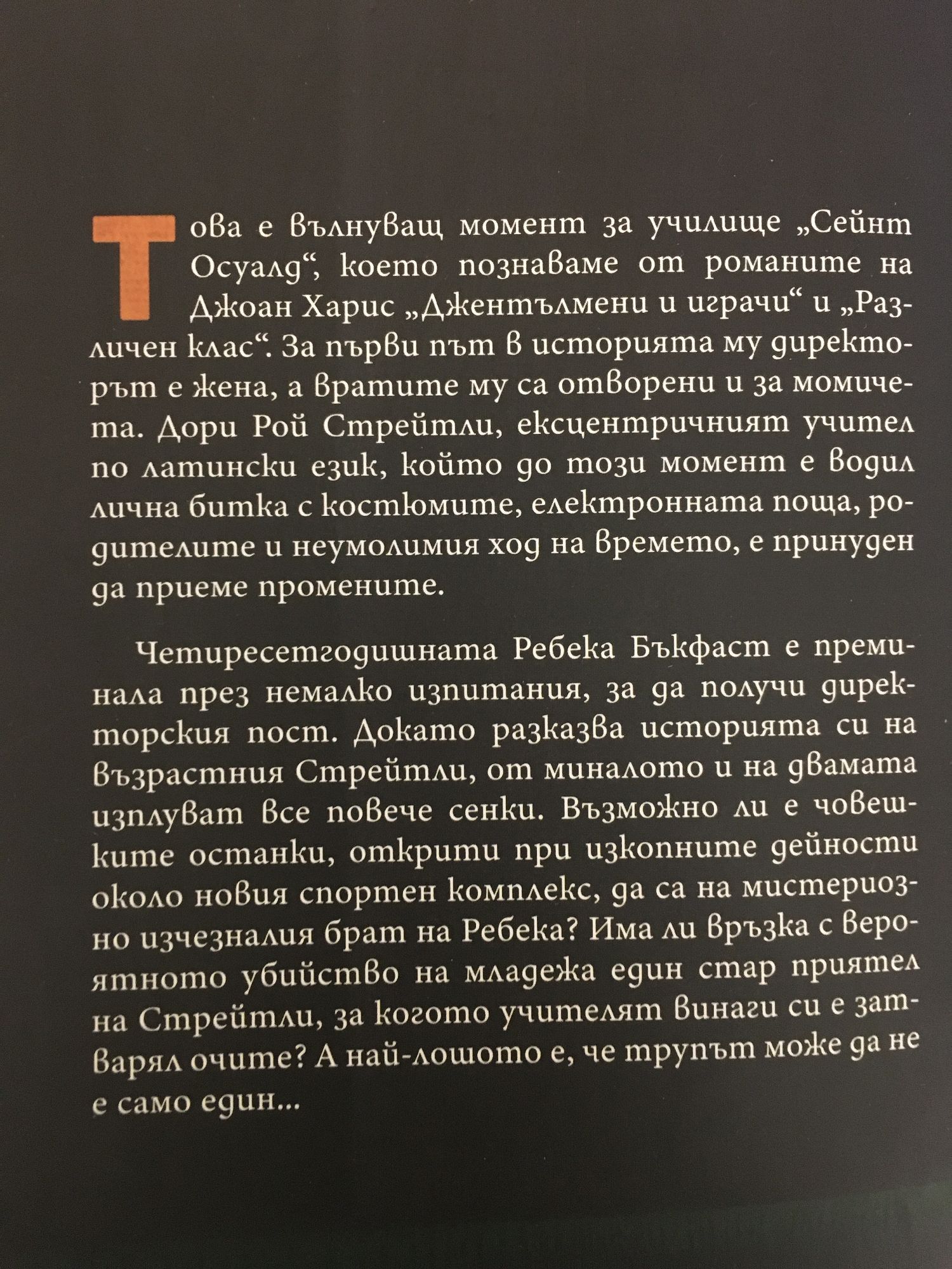 Това е вълнуващ момент за училище „Сейнт Осуалд“, което познаваме от романите на Джоан Харис „Джентълмени и играчи“ и „Различен клас“. За първи път в историята му директорът е жена, а вратите му са отворени и за момичета. Дори Рой Стрейтли, ексцентричният учител по латински език, който до този момент е водил лична битка с костюмите, електронната поща, родителите и неумолимия ход на времето, е принуден да приеме промените. Четиресетгодишната Ребека Бъкфаст е преминала през немалко изпитания, за да получи директорския пост. Докато разказва историята си на възрастния Стрейтли, от миналото и на двамата изплуват все повече сенки. Възможно ли е човешките останки, открити при изкопните дейности около новия спортен комплекс, да са на мистериозно изчезналия брат на Ребека? Има ли връзка с вероятното убийство на младежа един стар приятел на Стрейтли, за когото учителят винаги си е затварял очите? А най-лошото е, че трупът може да не е само един...