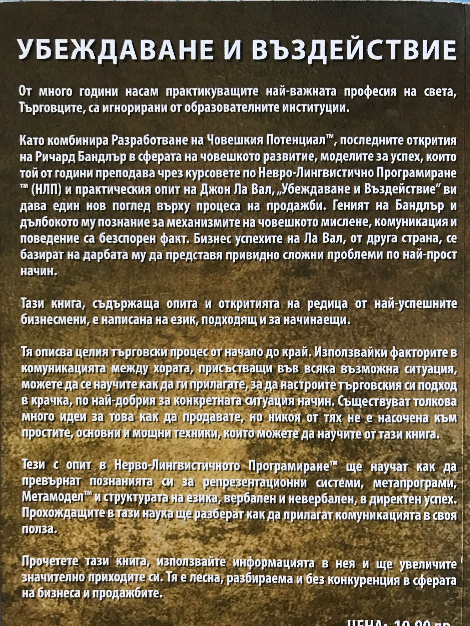 От много години насам практикуващите най-важната професия на света, Търговците, са игнорирани от образователните институции. Като комбинира Разработване на Човешкия Потенциал™, последните открития на Ричард Бандлър в сферата на човешкото развитие, моделите за успех, които той от години преподава чрез курсовете по Невро-Лингвистично Програмиране™ (НЛП) и практическия опит на Джон Ла Вал, „Убеждаване и Въздействие" ви дава един нов поглед върху процеса на продажби. Геният на Бандлър и дълбокото му познание за механизмите на човешкото мислене, комуникация и поведение са безспорен факт. Бизнес успехите на Ла Вал, от друга страна, се базират на дарбата му да представя привидно сложни проблеми по най-прост начин. Тази книга, съдържаща опита и откритията на редица от най-успешните бизнесмени, е написана на език, подходящ и за начинаещи. Тя описва целия търговски процес от начало до край. Използвайки факторите в комуникацията между хората, присъстващи във всяка възможна ситуация, можете да се научите как да ги прилагате, за да настроите търговския си подход в крачка, по най-добрия за конкретната ситуация начин. Съществуват толкова много идеи за това как да продавате, но никоя от тях не е насочена към простите, основни и мощни техники, които можете да научите от тази книга. Тези с опит в Нерво-Лингвистичното Програмиране™ ще научат как да превърнат познанията си за репрезентационни системи, металрограми, Метамодел™ и структурата на езика, вербален и невербален, в директен успех. Прохождащите в тази наука ще разберат как да прилагат комуникацията в своя полза. Прочетете тази книга, използвайте информацията в нея и ще увеличите значително приходите си. Тя е лесна, разбираема и без конкуренция в сферата на бизнеса и продажбите.