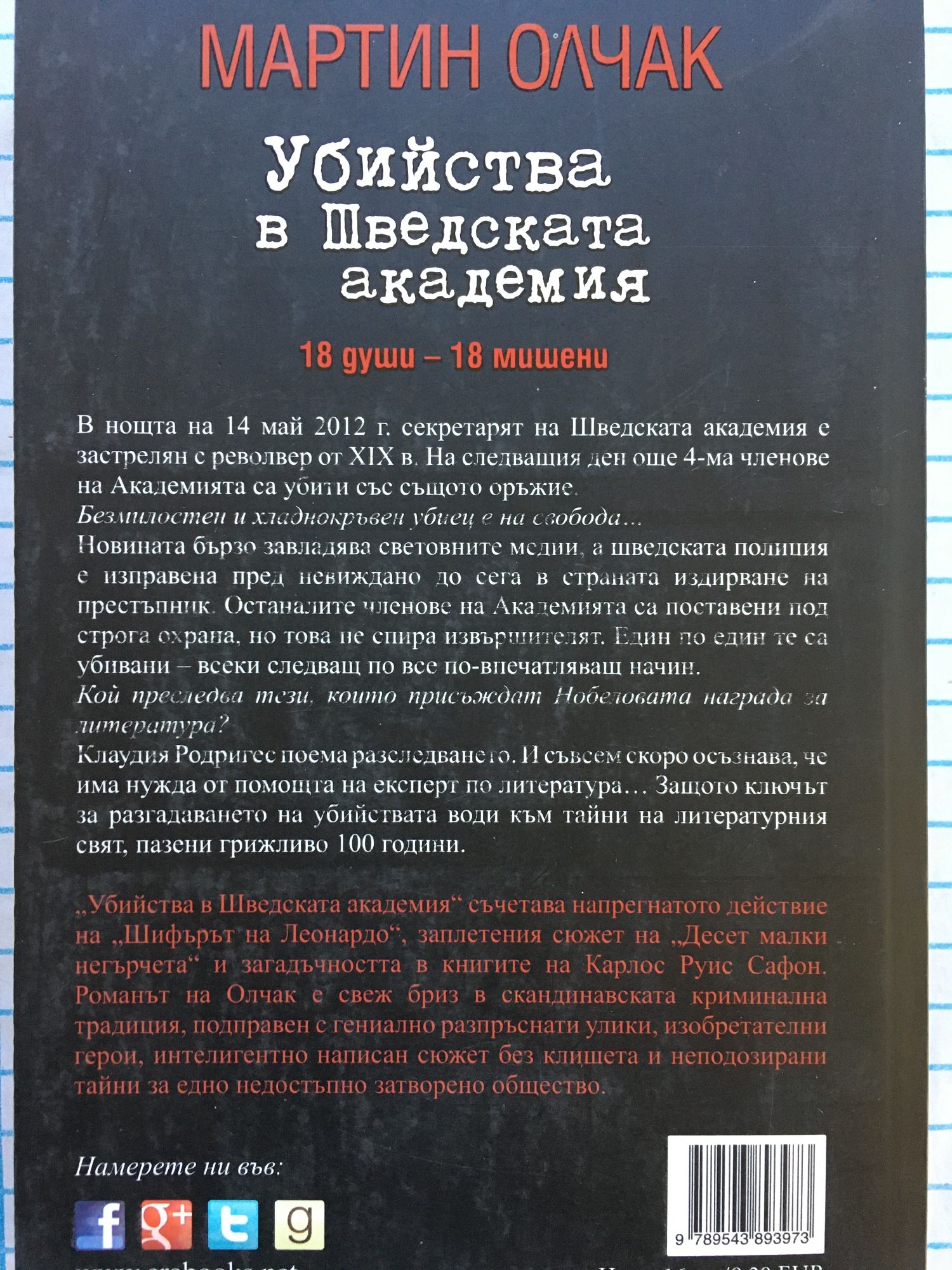 18 души – 18 мишени В нощта на 14 май 2012 г. секретарят на Шведската академия е застрелян с револвер от XIX в. На следващия ден още 4-ма членове на Академията са убити със същото оръжие. Безмилостен и хладнокръвен убиец е на свобода… Новината бързо завладява световните медии, а шведската полиция е изправена пред невиждано до сега в страната издирване на престъпник. Останалите членове на Академията са поставени под строга охрана, но това не спира извършителят. Един по един те са убивани – всеки следващ по все по-впечатляващ начин. Кой преследва тези, които присъждат Нобеловата награда за литература? Клаудия Родригес поема разследването. И съвсем скоро осъзнава, че има нужда от помощта на експерт по литература… Защото ключът за разгадаването на убийствата води към тайни на литературния свят, пазени грижливо 100 години. „Убийства в Шведската академия“ съчетава напрегнатото действие на „Шифърът на Леонардо“, заплетения сюжет на „Десет малки негърчета“ и загадъчността в книгите на Карлос Руис Сафон. Романът на Олчак е свеж бриз в скандинавската криминална традиция, подправен с гениално разпръснати улики, изобретателни герои, интелигентно написан сюжет без клишета и неподозирани тайни за едно недостъпно затворено общество.