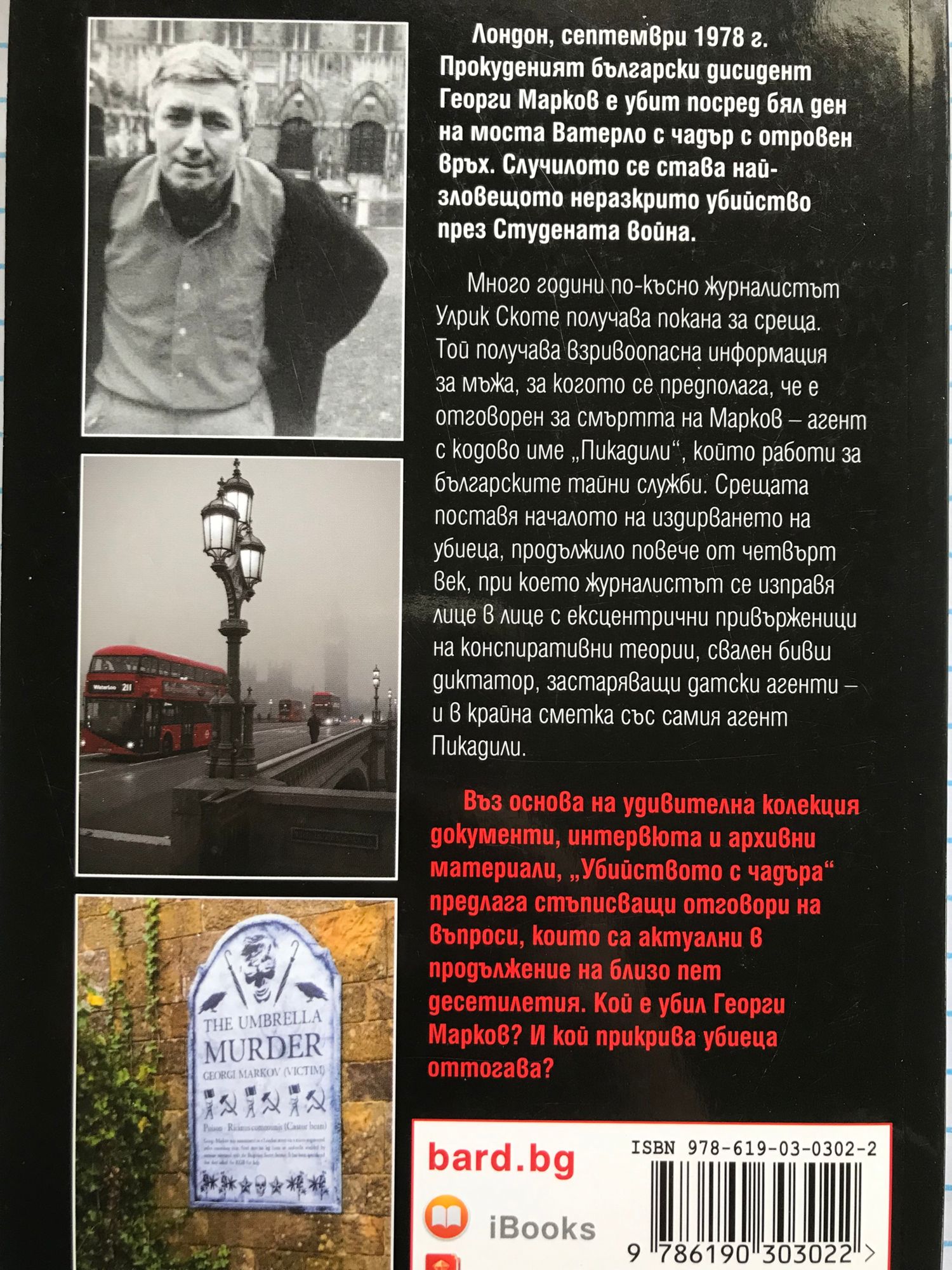 Лондон, септември 1978 г. Прокуденият български дисидент Георги Марков е убит посред бял ден на моста Ватерло, като е използван чадър с отровен връх. Случилото се става най-зловещото неразкрито убийство през Студената война. Много години по-късно журналистът Улрик Скоте получава покана за среща. Дадена му е взривоопасна информация за мъжа, за когото се предполага, че е отговорен за смъртта на Марков – агент с кодово име „Пикадили“, който работи за българските тайни служби. Срещата поставя началото на издирването на убиеца, продължило повече от четвърт век, при което журналистът се изправя лице в лице с ексцентрични привърженици на конспиративни теории, свален бивш диктатор, застаряващи датски агенти – и в крайна сметка със самия агент Пикадили. Въз основа на удивителна колекция документи, интервюта и архивни материали, „Убийството с чадъра“ предлага стъписващи отговори на въпроси, които са актуални в продължение на близо пет десетилетия. Кой е убил Георги Марков? И кой прикрива убиеца оттогава?