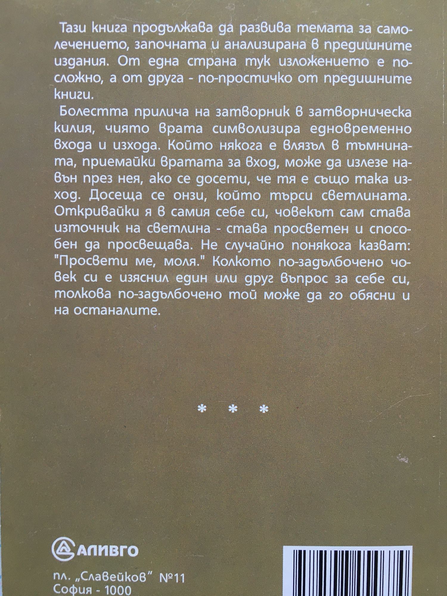 Тази книга продължава да развива темата за самолечението, започната и анализирана в предишните издания. От една страна тук изложението е по-сложно, а от друга – по-простичко от предишните книги. Болестта прилича на затворник в затворническа килия, чиято врата символизира едновременно входа и изхода. Който някога е влязъл в тъмнината, приемайки вратата за вход, може да излезе навън през нея, ако се досети, че тя е също така изход. Досеща се онзи, който търси светлината. Откривайки я в самия себе си, човекът сам става източник на светлина – става просветен и способен да просвещава. Не случайно понякога казват: „Просвети ме по този въпрос, моля.“ Колкото по-задълбочено човек си е изяснил един или друг въпрос за себе си, толкова по-задълбочено той може да го обясни и на останалите.