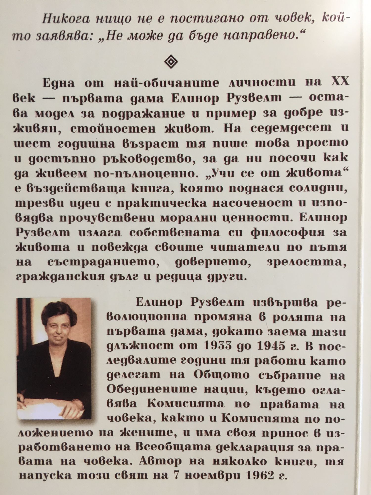 Една от най-обичаните личности на ХХ век - първата дама Елинор Рузвелт - остава модел за подражание и пример за добре изживян, стойностен живот. На седемдесет и шест годишна възраст тя пише това просто и достъпно ръководство, за да ни посочи как да живеем по-пълноценно. "Учи се от живота" е въздействаща книга, която поднася солидни, трезви идеи с практическа насоченост и изповядва прочувствени морални ценности. Елинор Рузвелт излага собствената си философия за живота и повежда своите читатели по пътя на състраданието, доверието, зрелостта, гражданския дълг и редица други.