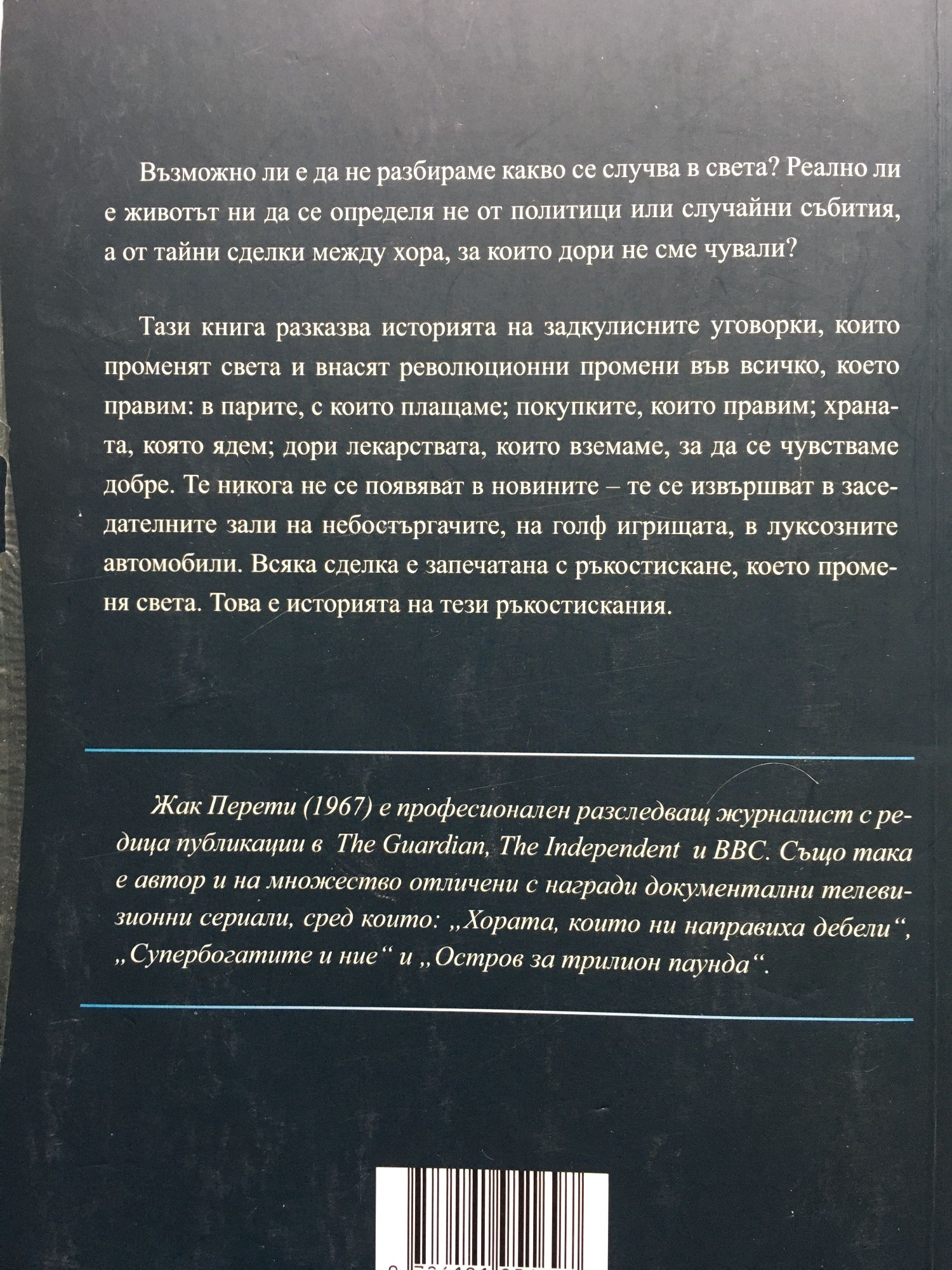 Възможно ли е да не разбираме какво се случва в света? Реално ли е животът ни да се определя не от политици или случайни събития, а от тайни сделки между хора, за които дори не сме чували? Тази книга разказва историята на тайните сделки, които променят света и внасят революционни промени във всичко, което правим: в парите, с които плащаме, покупките, които правим, храната, която ядем, дори лекарствата, които вземаме, за да се чувстваме добре. Те никога не се появяват в новините – те се уговарят в заседателните зали на небостъргачите, на голф игрищата, в луксозните автомобили. Всяка сделка е запечатана с ръкостискане, което променя света. Това е историята на тези ръкостискания.