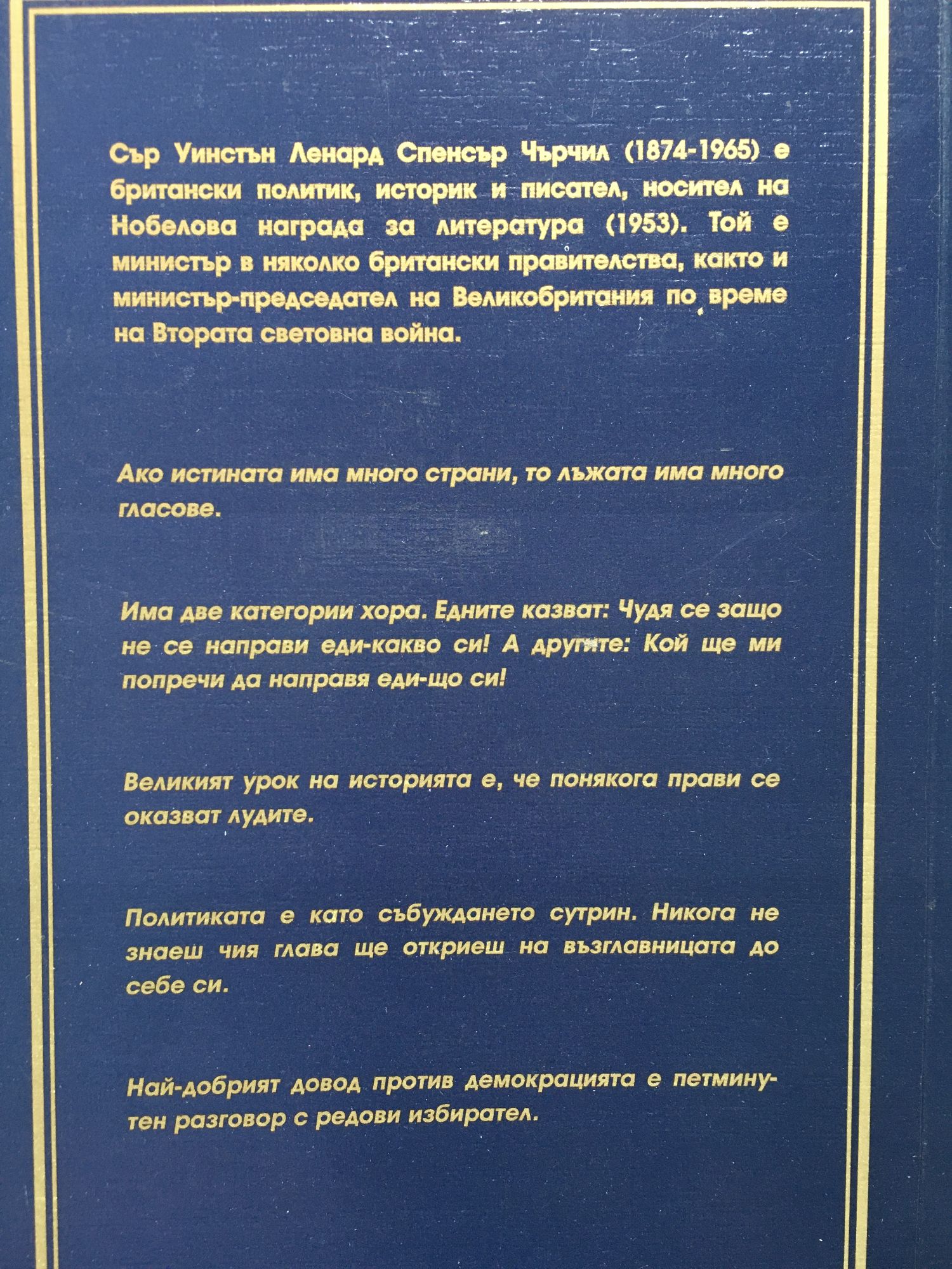 Сър Уинстън Ленард Спенсър Чърчил (1874- 1965) британски политик, историк и писател, носител на Нобелова награда за литература (1953). Той е министър в няколко британски правителства, както и министър-председател на Великобритания по време на Втората световна война. Ако истината има много страни, то лъжата има много гласове. Има две категории хора. Едните казват: Чудя се защо не се направи еди.какво си! А другите: Кой ще ми попреча да направя еди-що си! Великият урок на историята е, че понякога прави се оказват лудите. Политиката е като събуждането сутрин. Никога не знаеш чия глава ще откриеш на възглавницата до себе си. Най-добрият довод против демокрацията е петминутен разговор с редови избирател.