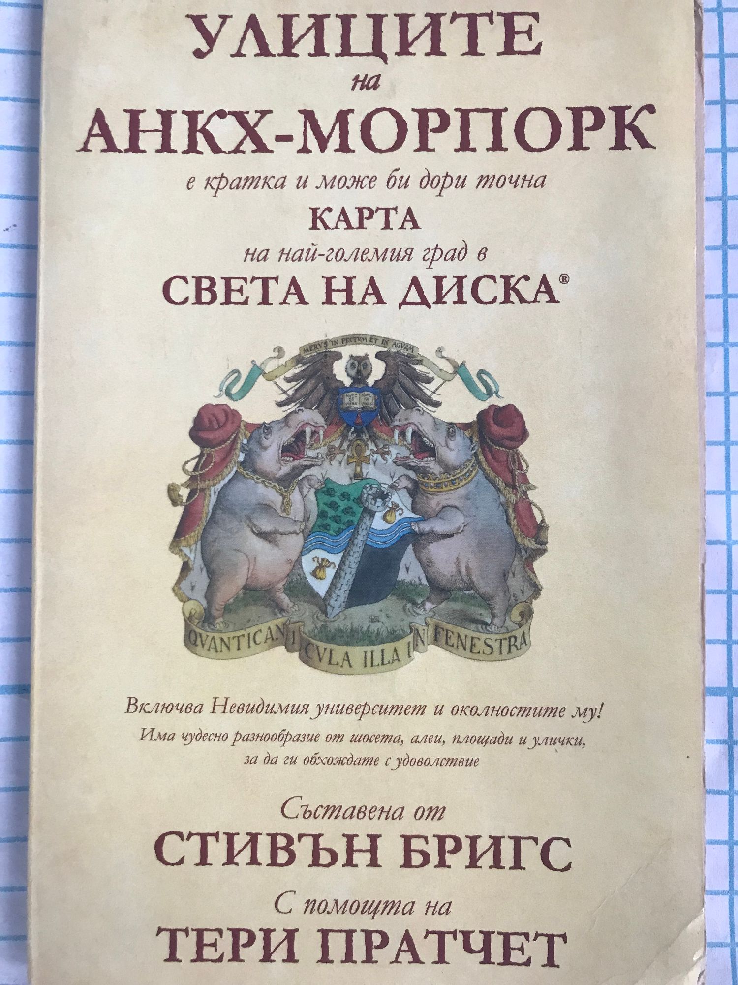 “Казват, че всички пътища водят към Анкх-Морпорк. Но не е вярно. Всички пътища водят извън Анкх-Морпорк, само че хората понякога вървят по тях в погрешна посока.” Из “Подвижни образи” Анкх-Морпорк! "Градъ на иляди изненади" (ако се вярва на прочутото издание на Гилдията на търговците)! Целият живот е тук! Макар че, ако свърне в неподходяща уличка, може и да свърши бързичко! Градът, прославен в бестселърите за Света на Диска от Тери Пратчет, за пръв път е нанесен най-прилежно на карта. Ще намерите всичко - от Невидимия университет до Сенките, от забележителности като Двореца на Патриция до малко познати... ъ-ъ, кътчета като Музея на джуджешкия хляб, сврян в Уличката на пумпала. Вижте всеизвестните улици, по които са ходили толкова много герои, и то твърде припряно в някои случаи! Както би казал изтъкнатият предприемач от Анкх-Морпорк - ССПГ Диблър: "На далавера сте, каквато ще да е цената... и направо сами си прерязваме гърлата. Е, почти."