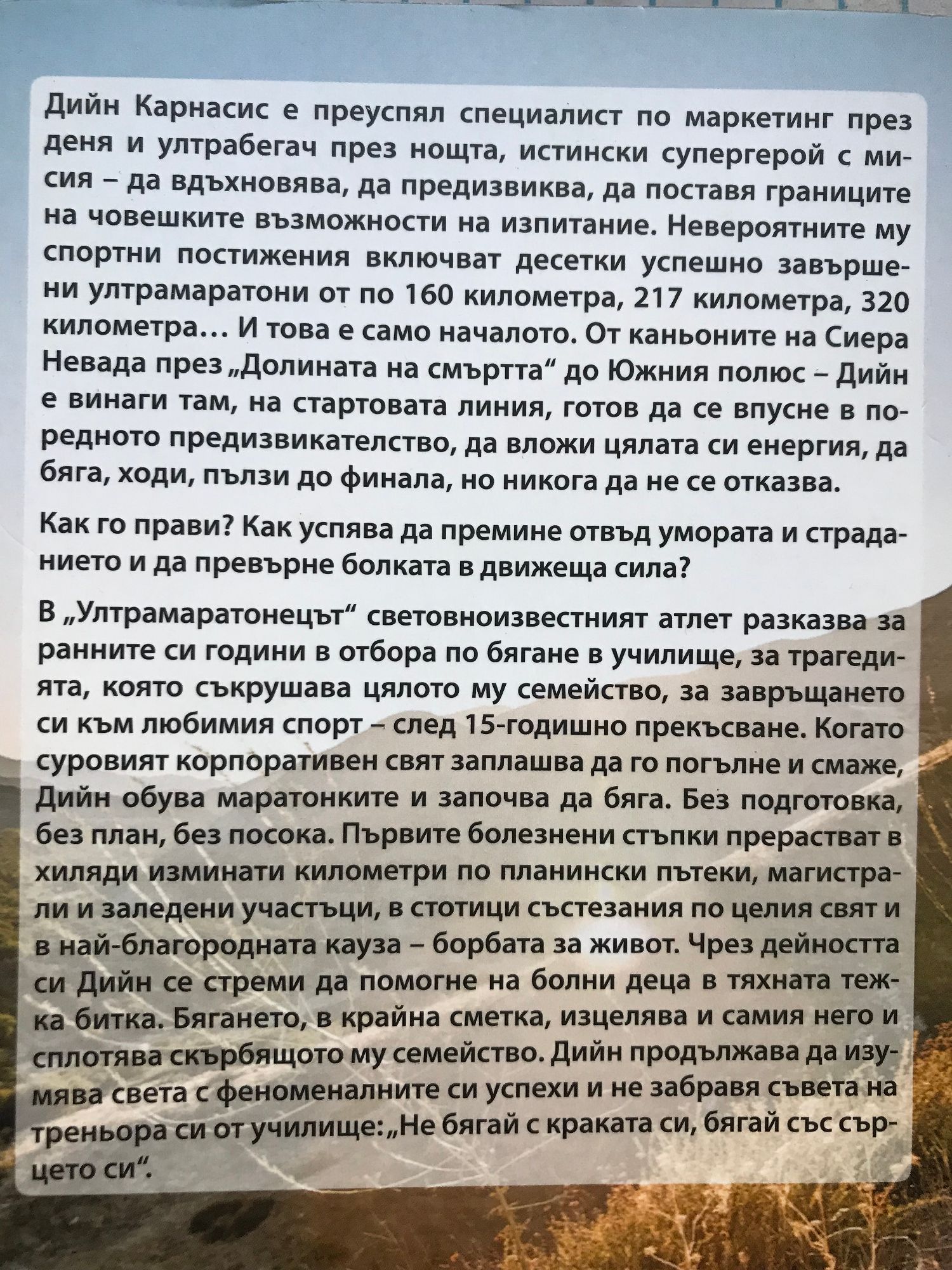 Дийн Карнасис е преуспял специалист по маркетинг през деня и ултрабегач през нощта, истински супергерой с мисия – да вдъхновява, да предизвиква, да поставя границите на човешките възможности на изпитание. Невероятните му спортни постижения включват десетки успешно завършени ултрамаратони от по 160 километра, 217 километра, 320 километра… И това е само началото. От каньоните на Сиера Невада през „Долината на смъртта“ до Южния полюс – Дийн е винаги там, на стартовата линия, готов да се впусне в поредното предизвикателство, да вложи цялата си енергия, да бяга, ходи, пълзи до финала, но никога да не се отказва. Как го прави? Как успява да премине отвъд умората и страданието и да превърне болката в движеща сила? В „Ултрамаратонецът“ световноизвестният атлет разказва за ранните си години в отбора по бягане в училище, за трагедията, която съкрушава цялото му семейство, за завръщането си към любимия спорт – след 15-годишно прекъсване. Когато суровият корпоративен свят заплашва да го погълне и смаже, Дийн обува маратонките и започва да бяга. Без подготовка, без план, без посока. Първите болезнени стъпки прерастват в хиляди изминати километри по планински пътеки, магистрали и заледени участъци, в стотици състезания по целия свят и в най-благородната кауза – борбата за живот. Чрез дейността си Дийн се стреми да помогне на болни деца в тяхната тежка битка. Бягането, в крайна сметка, изцелява и самия него и сплотява скърбящото му семейство. Дийн продължава да изумява света с феноменалните си успехи и не забравя съвета на треньора си от училище: „Не бягай с краката си, бягай със сърцето си“.