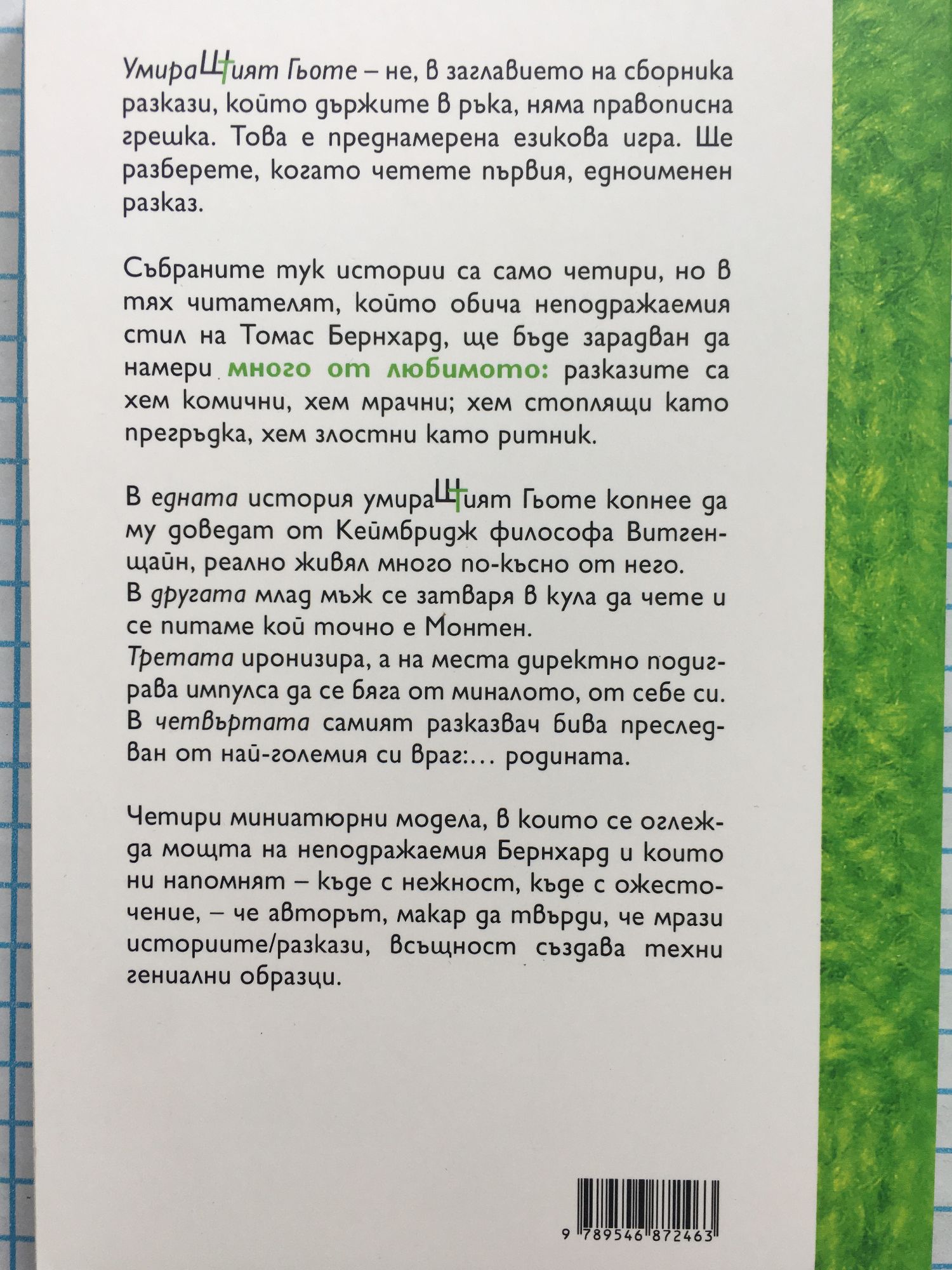 „УмираШТият Гьоте“ – не, в заглавието на сборника разкази, който държите в ръка, няма правописна грешка. Това е преднамерена езикова игра. Ще разберете, когато четете първия, едноименен разказ. Събраните тук истории са само четири, но в тях читателят, който обича неподражаемия стил на Томас Бернхард, ще бъде зарадван да намери много от любимото: разказите са хем комични, хем мрачни, хем стоплящи като прегръдка, хем злостни като ритник. Сборникът съдържа разказите: „Умираштият Гьоте“; „Монтен. Разказ“; „Виждане“; „В пламъци. Пътепис до някогашен приятел“. В едната история умираШТият Гьоте копнее да му доведат от Кеймбридж философа Витгенщайн, реално живял много по-късно от него. В другата млад мъж се затваря в кула да чете и се питаме кой точно е Монтен. Третата иронизира, а на места директно подиграва импулса да се бяга от миналото, от себе си. В четвъртата самият разказвач бива преследван от най-големия си враг:… родината. Четири миниатюрни модела, в които се оглежда мощта на неподражаемия Бернхард и които ни напомнят – къде с нежност, къде с ожесточение, – че авторът, макар да твърди, че мрази историите/разкази, всъщност създава техни гениални образци.