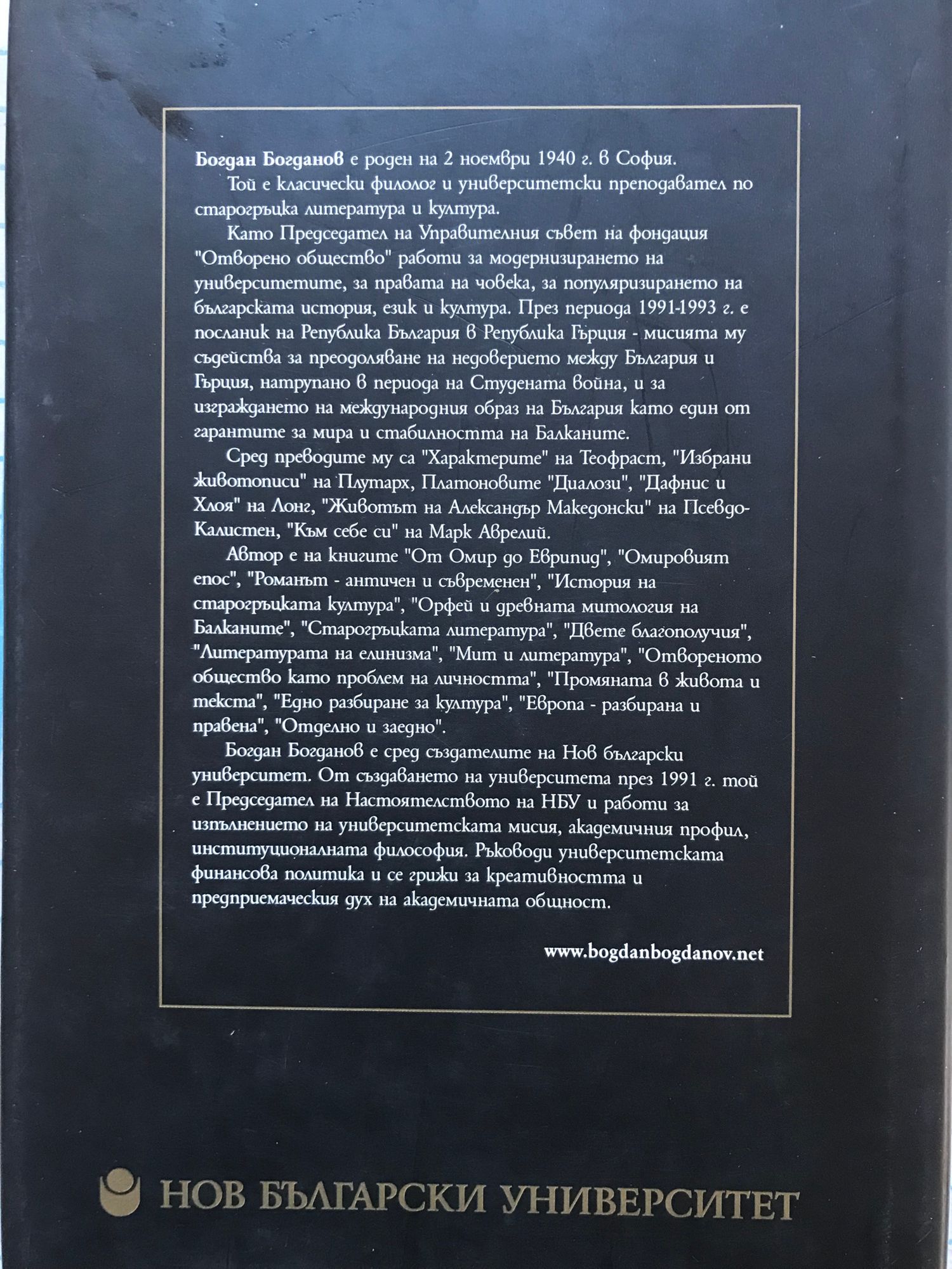 Богдан Богданов е роден на 2 ноември 1940 г. в София. Той е класически филолог и университетски преподавател по старогръцка литература и култура. Като Председател на Управителния съвет на фондация "Отворено общество" работи за модернизирането на университетите, за правата на човека, за популяризирането на българската история, език и култура. През периода 1991-1993 г. е посланик на Република България в Република Гърция - мисията му съдейства за преодоляване на недоверието между България и Гърция, натрупано в периода на Студената война, и за изгразкдането на международния образ на България като един от гарантите за мира и стабилността на Балканите. Сред преводите му са "Характерите" на Теофраст, "Избрани животописи" на Плутарх, Платоновите "Диалози", "Дафнис и Хлоя" на Лонг, "Животът на Александър Македонски" на Псевдо- Калистен, "Към себе си" на Марк Аврелий. Автор е на книгите "От Омир до Еврипид", "Омировият епос", "Романът - античен и съвременен", "История на старогръцката култура", "Орфей и древната митология на Балканите", "Старогръцката литература", "Двете благополучия", "Литературата на елинизма", "Мит и литература", "Отвореното общество като проблем на личността", "Промяната в живота и текста", "Едно разбиране за култура", "Европа - разбирана и правена", "Отделно и заедно". Богдан Богданов е сред създателите на Нов български университет. От създаването на университета през 1991 г. той е Председател на Настоятелството на НБУ и работи за изпълнението на университетската мисия, академичния профил, институционалната философия. Ръководи университетската финансова политика и се грижи за креативността и предприемаческия дух на академичната общност.
