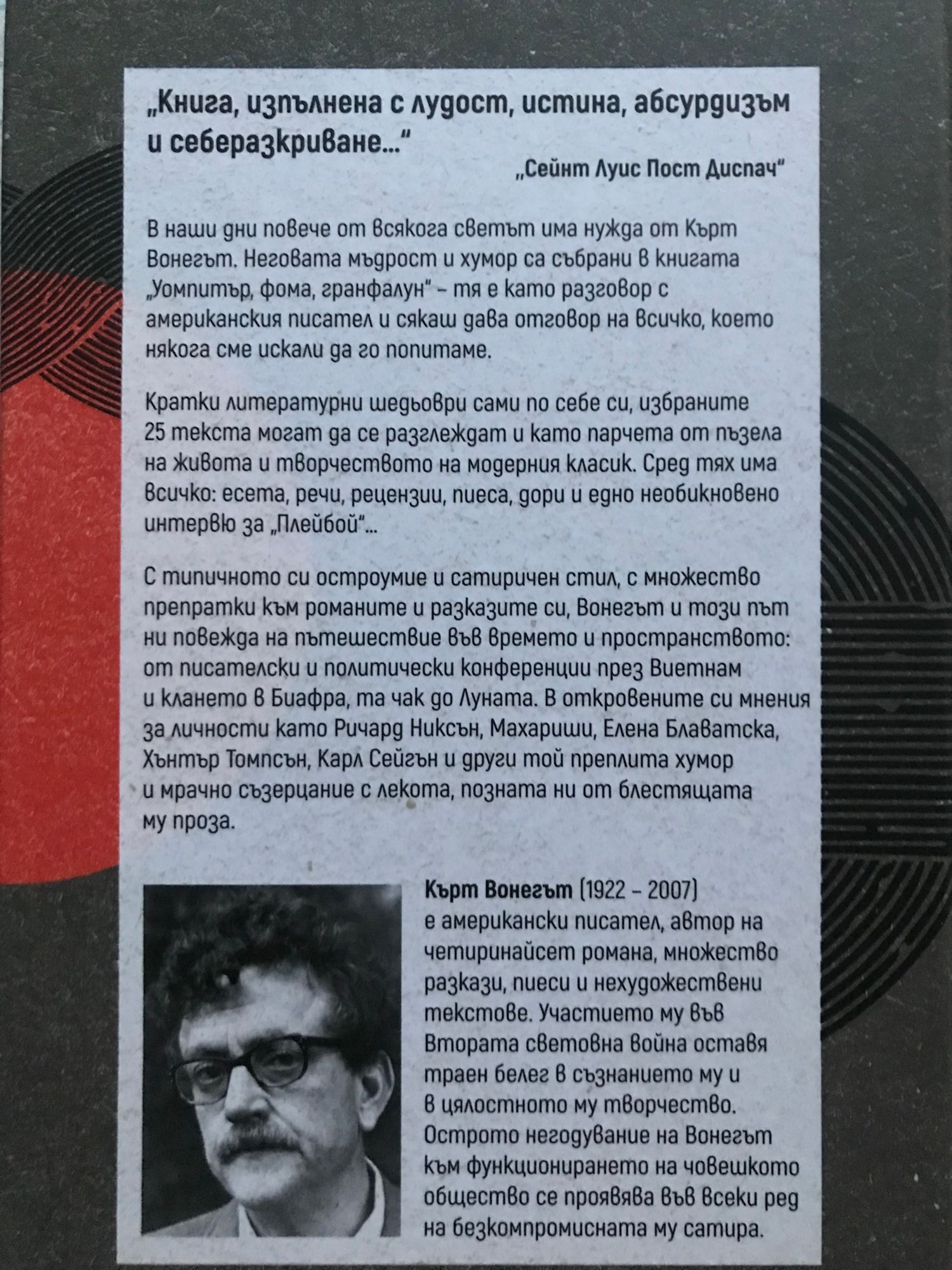 „Книга, изпълнена с лудост, истина, абсурдизъм и себеразкриване…“ „Сейнт Луис Пост Диспач“ В наши дни повече от всякога светът има нужда от Кърт Вонегът. Неговата мъдрост и хумор са събрани в книгата „Уомпитър, фома, гранфалун“ – тя е като разговор с американския писател и сякаш дава отговор на всичко, което някога сме искали да го попитаме. Кратки литературни шедьоври сами по себе си, избраните 25 текста могат да се разглеждат и като парчета от пъзела на живота и творчеството на модерния класик. Сред тях има всичко: есета, речи, рецензии, пиеса, дори и едно необикновено интервю за „Плейбой“… С типичното си остроумие и сатиричен стил, с множество препратки към романите и разказите си, Вонегът и този път ни повежда на пътешествие във времето и пространството: от писателски и политически конференции през Виетнам и клането в Биафра, та чак до Луната. В откровените си мнения за личности като Ричард Никсън, Махариши, Елена Блаватска, Хънтър Томпсън, Карл Сейгън и други той преплита хумор и мрачно съзерцание с лекота, позната ни от блестящата му проза.