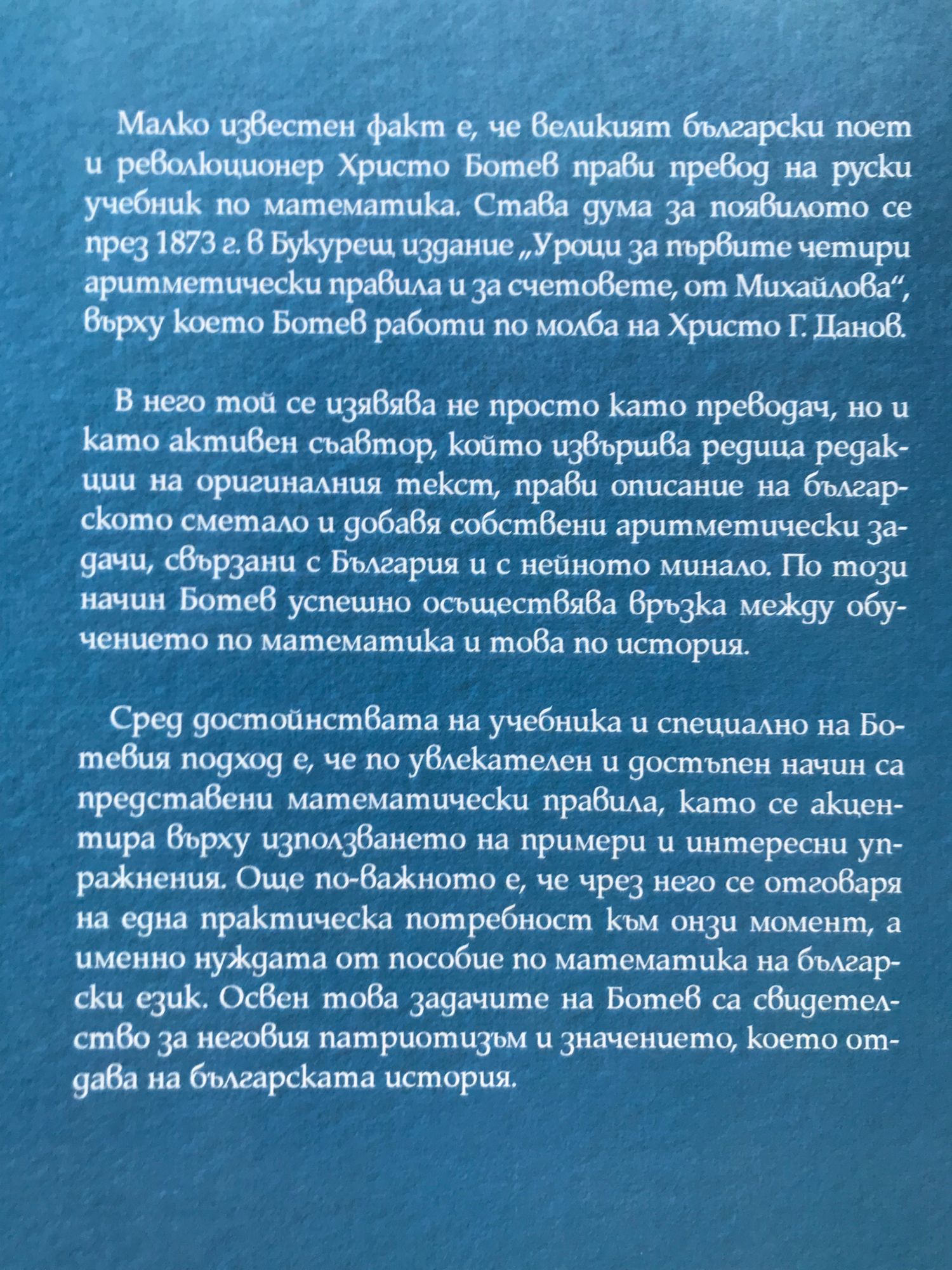 Фототипно издание на руския учебник по математика, издаден в Букурещ през 1873 г. в превод, редакция и съавторство на Христо Ботев Малко известен факт е, че великият български поет и революционер Христо Ботев прави превод на руски учебник по математика. Става дума за появилото се през 1873 г. в Букурещ издание „Уроци за първите четири аритметически правила и за счетовете, от Михайлова”, върху което Ботев работи по молба на Христо Г. Данов. В него той се изявява не просто като преводач, но и като активен съавтор, който извършва редица редакции на оригиналния текст, прави описание на българското сметало и добавя собствени аритметически задачи, свързани с България и с нейното минало. По този начин Ботев успешно осъществява връзка между обучението по математика и това по история. Сред достойнствата на учебника и специално на Ботевия подход е, че по увлекателен и достъпен начин са представени математически правила, като се акцентира върху използването на примери и интересни упражнения. Още по-важното е, че чрез него се отговаря на една практическа потребност към онзи момент, а именно нуждата от пособие по математика на български език. Освен това задачите на Ботев са свидетелство за неговия патриотизъм и значението, което отдава на българската история.