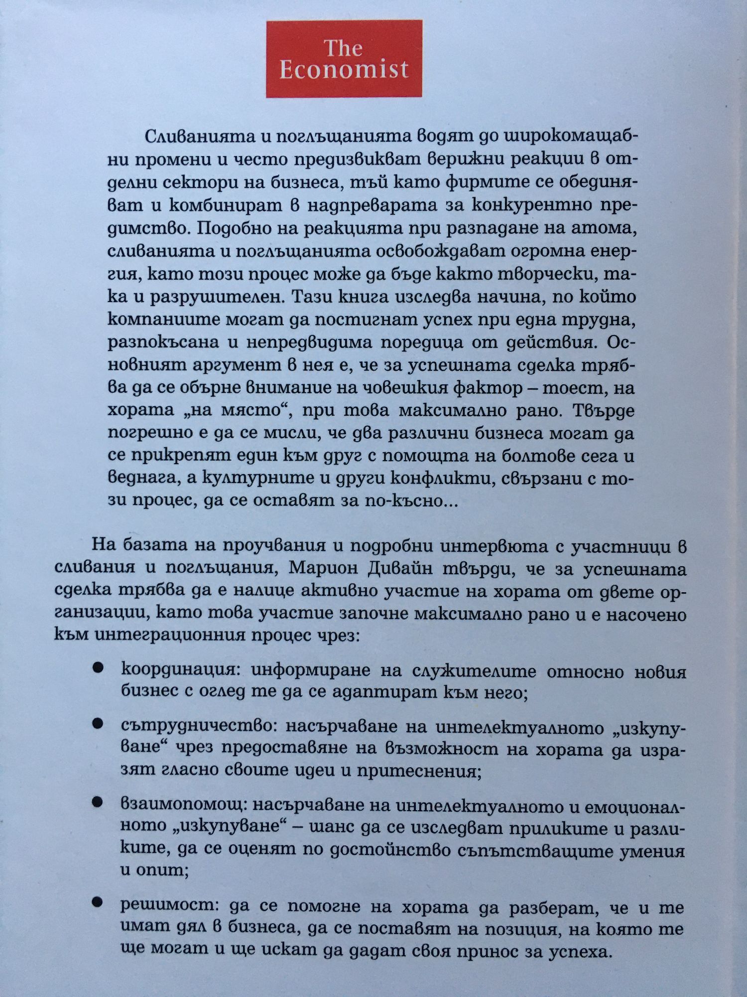 Сливанията и поглъщанията водят до широкомащабни промени и често предизвикват верижни реакции в отделни сектори на бизнеса, тъй като фирмите се обединяват и комбинират в надпреварата за конкурентно предимство. Подобно на реакцията при разпадане на атома, сливанията и поглъщанията освобождават огромна енергия, като този процес може да бъде както творчески, така и разрушителен. Тази книга изследва начина, по който компаниите могат да постигнат успех при една трудна, разпокъсана и непредвидима поредица от действия. Основният аргумент в нея е, че за успешната сделка трябва да се обърне внимание на човешкия фактор — тоест, на хората „на място", при това максимално рано. Твърде погрешно е да се мисли, че два различни бизнеса могат да се прикрепят един към друг с помощта на болтове сега и веднага, а културните и други конфликти, свързани с този процес, да се оставят за по-късно... На базата на проучвания и подробни интервюта с участници в сливания и поглъщания, Марион Дивайн твърди, че за успешната сделка трябва да е налице активно участие на хората от двете организации, като това участие започне максимално рано и е насочено към интеграционния процес чрез: - координация: информиране на служителите относно новия бизнес с оглед те да се адаптират към него; - сътрудничество: насърчаване на интелектуалното „изкупуване" чрез предоставяне на възможност на хората да изразят гласно своите идеи и притеснения; - взаимопомощ: насърчаване на интелектуалното и емоционалното „изкупуване" - шанс да се изследват приликите и разликите, да се оценят по достойнство съпътстващите умения и опит; - решимост: да се помогне на хората да разберат, че и те имат дял в бизнеса, да се поставят на позиция, на която те ще могат и ще искат да дадат своя принос за успеха.