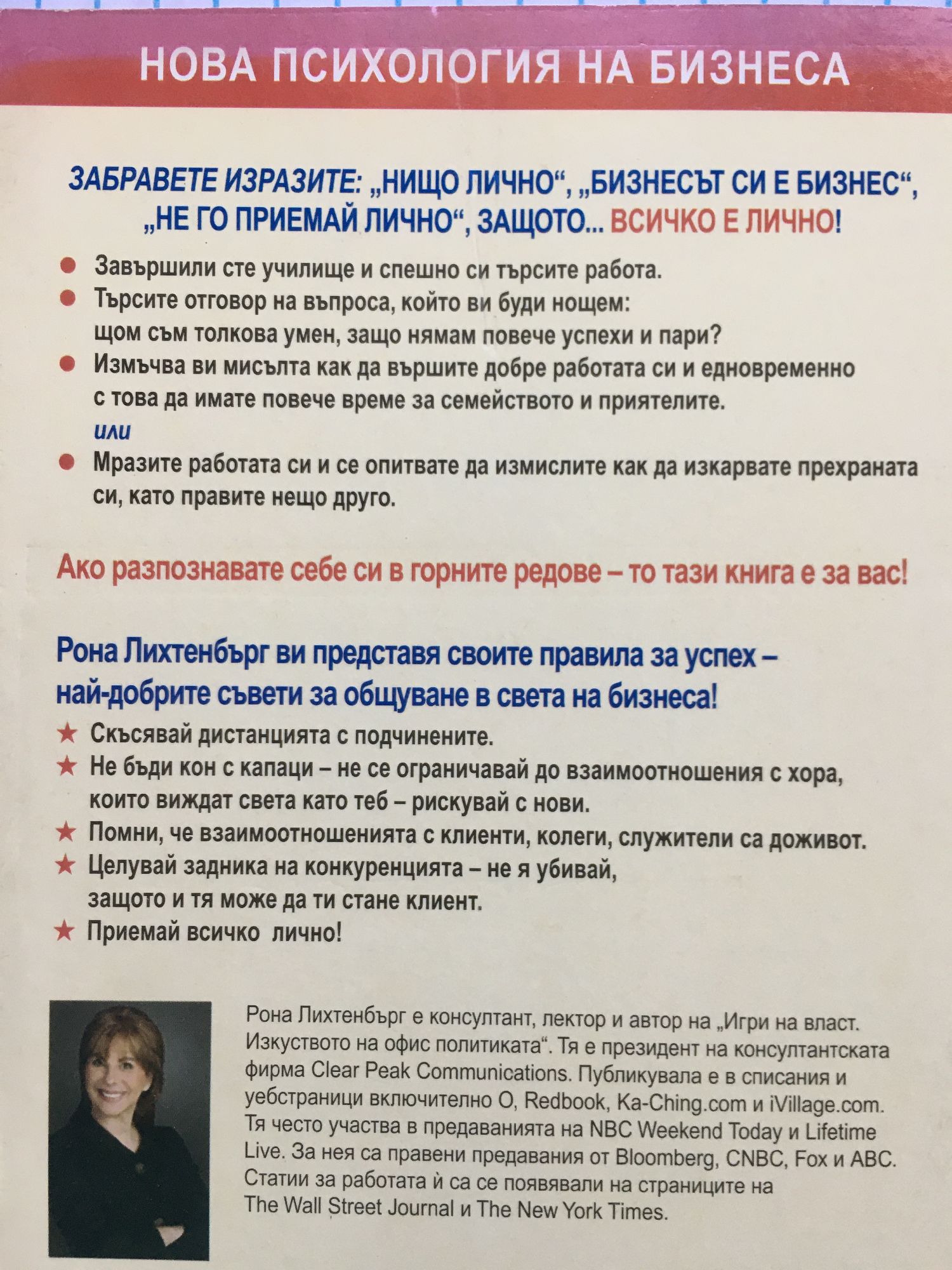 ЗАБРАВЕТЕ ИЗРАЗИТЕ: "НИЩО ЛИЧНО", "БИЗНЕСЪТ СИ Е БИЗНЕС", "НЕ ГО ПРИЕМАЙ ЛИЧНО", ЗАЩОТО... ВСИЧКО Е ЛИЧНО! - Завършили сте училище и спешно си търсите работа. - Търсите отговор на въпроса, който ви буди нощем: щом съм толкова умен, защо нямам повече успехи и пари? - Измъчва ви мисълта как да вършите добре работата си и едновременно с това да имате повече време за семейството и приятелите. или - Мразите работата си и се опитвате да измислите как да изкарвате прехраната си, като правите нещо друго. Ако разпознавате себе си в горните редове - то тази книга е за вас! Рона Лихтенбърг ви представя своите правила за успех -най-добрите съвети за общуване в света на бизнеса! - Скъсявай дистанцията с подчинените. - Не бъди кон с капаци - не се ограничавай до взаимоотношения с хора, които виждат света като теб - рискувай с нови. - Помни, че взаимоотношенията с клиенти, колеги, служители са доживот. - Целувай задника на конкуренцията - не я убивай, защото и тя може да ти стане клиент. - Приемай всичко лично!