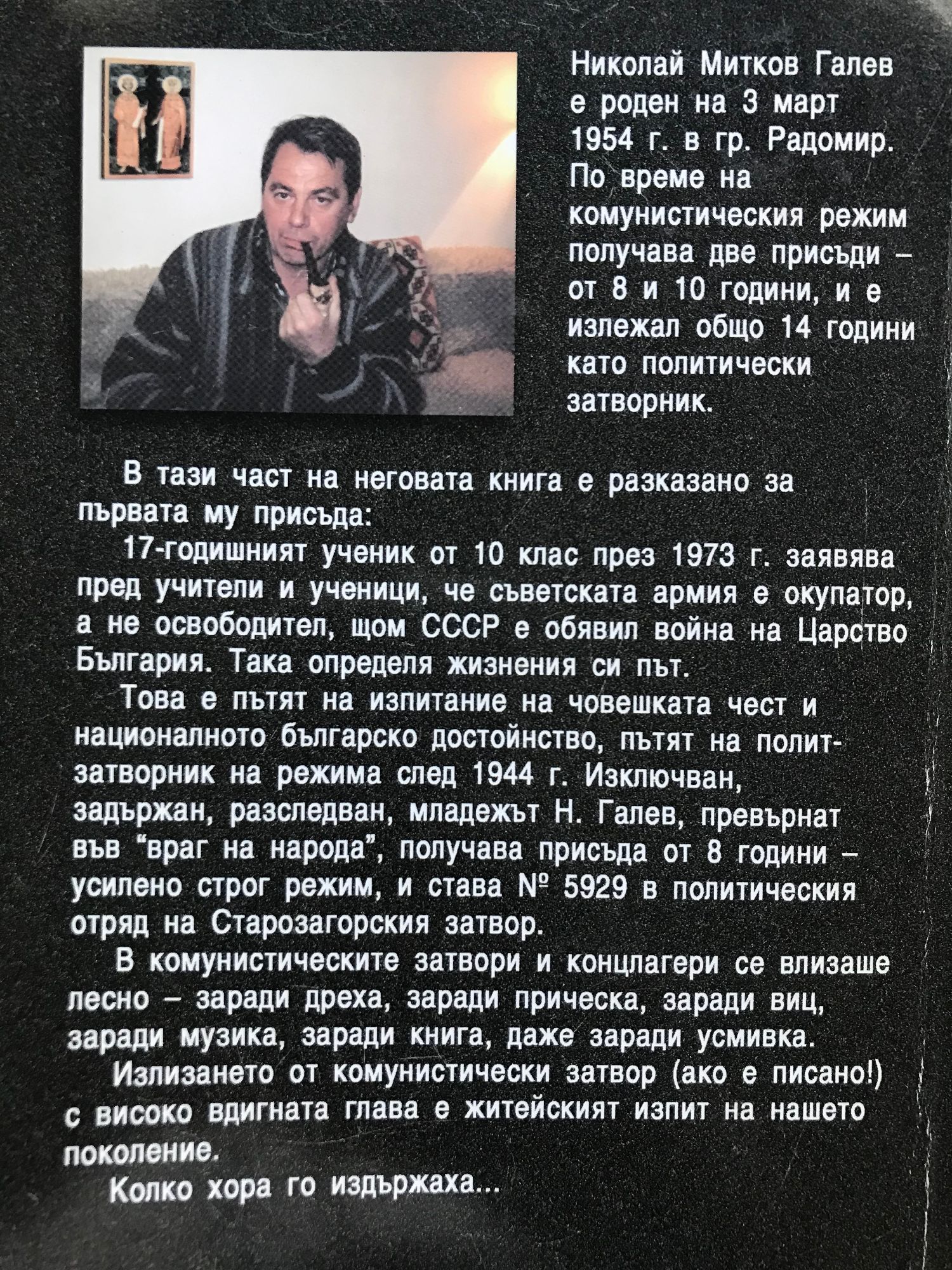 Николай Митков Галев е роден на 3 март 1954 г. в гр. Радомир. По време на комунистическия режим получава две присъди -от 8 и 10 години, и е излежал общо 14 години като политически затворник. В тази част на неговата книга е разказано за първата му присъда: 17-годишният ученик от 10 клас през 1973 г. заявява пред учители и ученици, че съветската армия е окупатор, а не освободител, щом СССР е обявил война на Царство България. Така определя жизнения си път. Това е пътят на изпитание на човешката чест и националното българско достойнство, пътят на политзатворник на режима след 1944 г. Изключван, задържан, разследван, младежът Н. Галев, превърнат във "враг на народа", получава присъда от 8 години -усилено строг режим, и става № 5929 в политическия отряд на Старозагорския затвор. В комунистическите затвори и концлагери се влизаше лесно - заради дреха, заради прическа, заради виц, заради музика, заради книга, даже заради усмивка. Излизането от комунистически затвор (ако е писано!) с високо вдигната глава е житейският изпит на нашето поколение. Колко хора го издържаха...