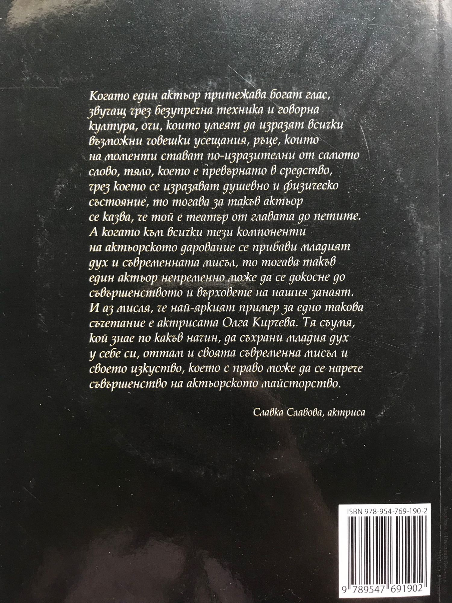 " Когато един актьор притежава богат глас, звучащ чрез безупречна техника и говорна култура, очи, които умеят да изразят всички възможни човешки усещания, ръце, които на моменти стават по-изразителни от самото слово, тяло, което е превърнато в средство, чрез което се изразяват душевно и физическо състояние, то тогава за такъв актьор се казва, че той е театър от главата до петите. А когато към всички тези компоненти на актьорското дарование се прибави младият дух и съвременната мисъл, то тогава такъв един актьор непременно може да се докосне до съвършенството и върховете на нашия занаят. И аз мисля, че най-яркият пример за едно такова съчетание е актрисата Олга Кирчева. Тя съумя, кой знае по какъв начин, да съхрани младия дух у себе си, оттам и своята съвременна мисъл и своето изкуство, което с право може да се нарече съвършенство на актьорското майсторство..." Славка Славова, актриса