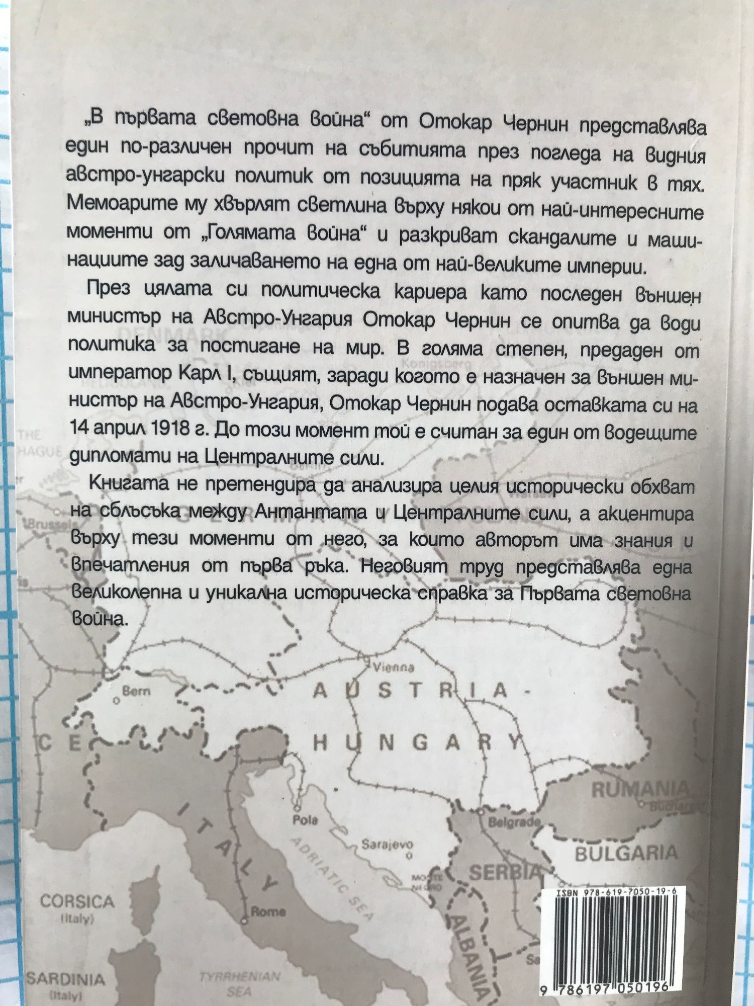 В Първата световна война“ от Отокар Чернин представлява един по-различен прочит на събитията през погледа на видния австро-унгарски политик, от позицията на пряк участник в тях. Мемоарите му хвърлят светлина върху някои от най-интересните моменти от „Голямата война“ и разкриват скандалите и машинациите зад заличаването на една от най-великите империи. През цялата си политическа кариера Отокар Чернин се опитва да води политика за постигане на мир. В голяма степен предаден от император Карл Първи, същият, заради който е назначен за външен министър на Австро-Унгария, Отокар Чернин подава оставката си на 14 април 1918 г. До този момент той е считан за дипломат номер едно на Централните сили. Книгата не претендира да анализира целия исторически обхват на сблъсъка между Антантата и Централните сили, а акцентира върху тези моменти от нея, за които авторът има знания и впечатления от първа ръка. Неговият труд представлява една великолепна и уникална историческа справка за Първата световна война.