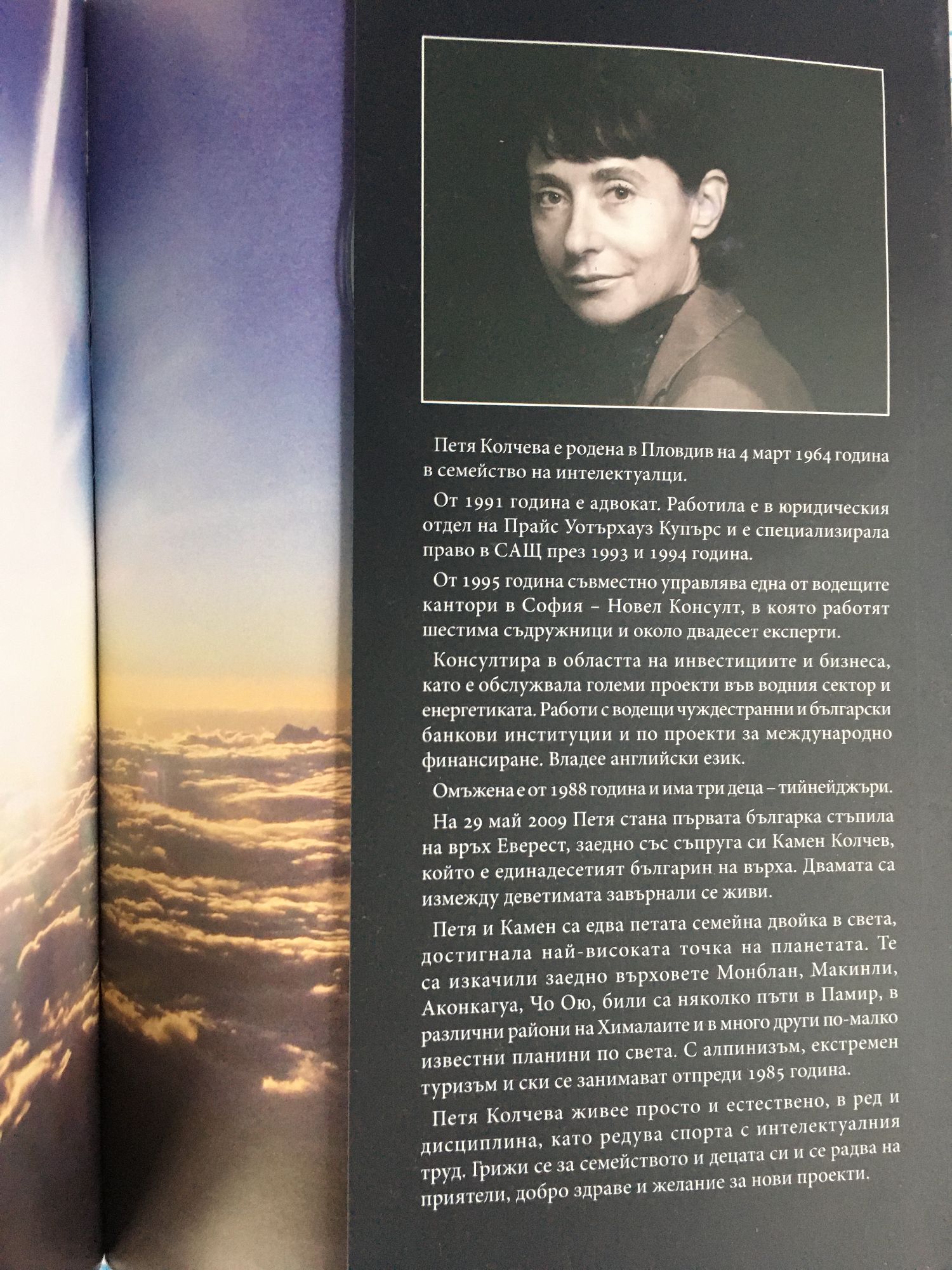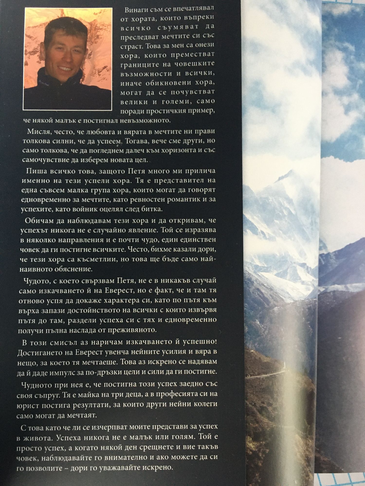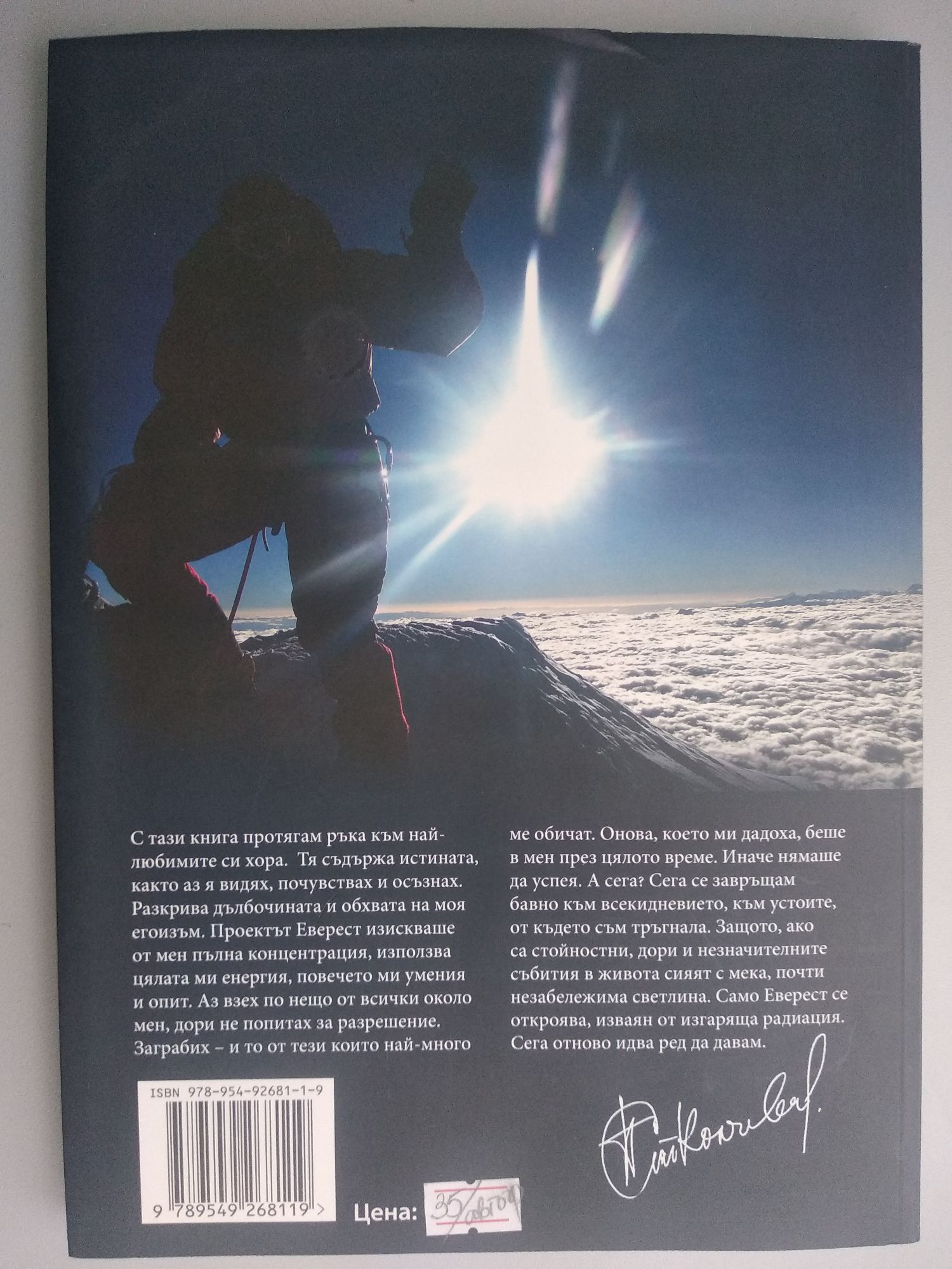 С тази книга протягам ръка към най-любимите си хора. Тя съдържа истината, както аз я видях, почуствах и осъзнах. Разкрива дълбочината и обхвата на моя егоизъм. Проектът Еверест изискваше от мен пълна концентрация, използва цялата ми енергия, повечето ми умения и опит. Аз взех по нещо от всички около мен, дори не попитах за разрешение. Заграбих - и то от тези, които най-много ме обичат. Онова, което ми дадоха, беше в мен през цялото време. Иначе нямаше да успея. А сега? Сега се завръщам бавно към всекидневието, към устоите, от където съм тръгнала. Защото, ако са стойностни, дори и незначителните събития в живота сияят с мека, почти незабележима светлина. Само Еверест се откроява, изваян от изгаряща радиация. Сега отново идва ред да давам.