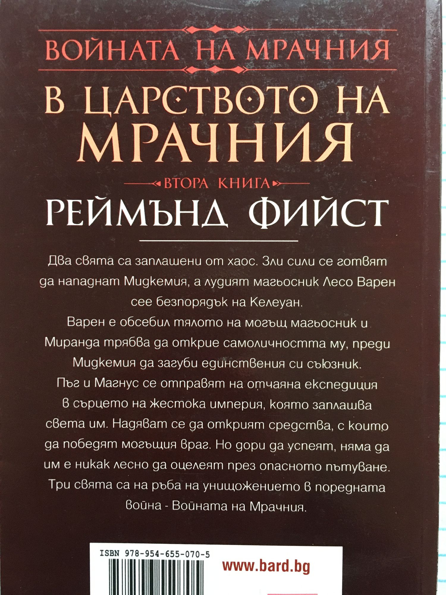 Два свята са заплашени от хаос. Зли сили се готвят да нападнат Мидкемия, а лудият магьосник Лесо Варен сее безпорядък на Келеуан. Варен е обсебил тялото на могъщ магьосник и Миранда трябва да открие самоличността му, преди Мидкемия да загуби единствения си съюзник. Пъг и Магнус се отправят на отчаяна експедиция в сърцето на жестока империя, която заплашва света им. Надяват се да открият средства, с които да победят могъщия враг. Но дори да успеят, няма да им е никак лесно да оцелеят през опасното пътуване. Три свята са на ръба на унищожението в поредната война - Войната на Мрачния.