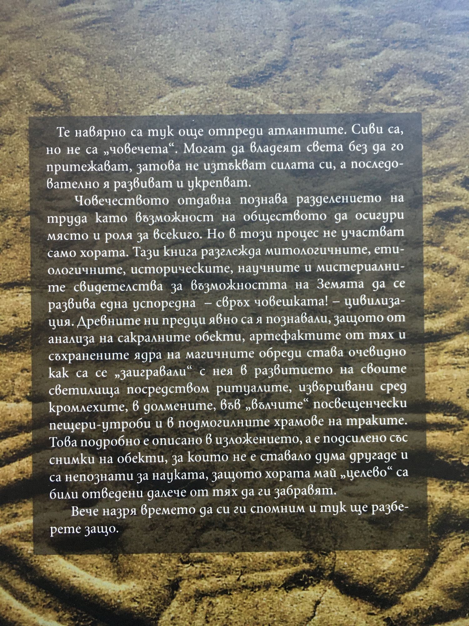 Човечеството отдавна познава разделението на труда като възможност на обществото да осигури място и роля за всекиго. Но в този процес не участват само хората. Тази книга разглежда митологичните, етиологичните, историческите, научните и мистериалните свидетелства за възможността на Земята да се развива една успоредна – свръх човешката! – цивилизация. Древните ни предци явно са я познавали, защото от анализа на сакралните обекти, артефактите от тях и съхранените ядра на магичните обреди става очевидно как са се „заигравали“ с нея в развитието на своите светилища посредством ритуалите, извършвани сред кромлехите, в долмените, във „вълчите“ посвещенчески пещери-утроби и в подмогилните храмове на траките. Това подробно е описано в изложението, а е подсилено със снимки на обекти, за които не е ставало дума другаде и са непознати за науката, защото хората май „целево“ са били отведени далече от тях да ги забравят. Вече назря времето да си ги спомним и тук ще разберете защо.