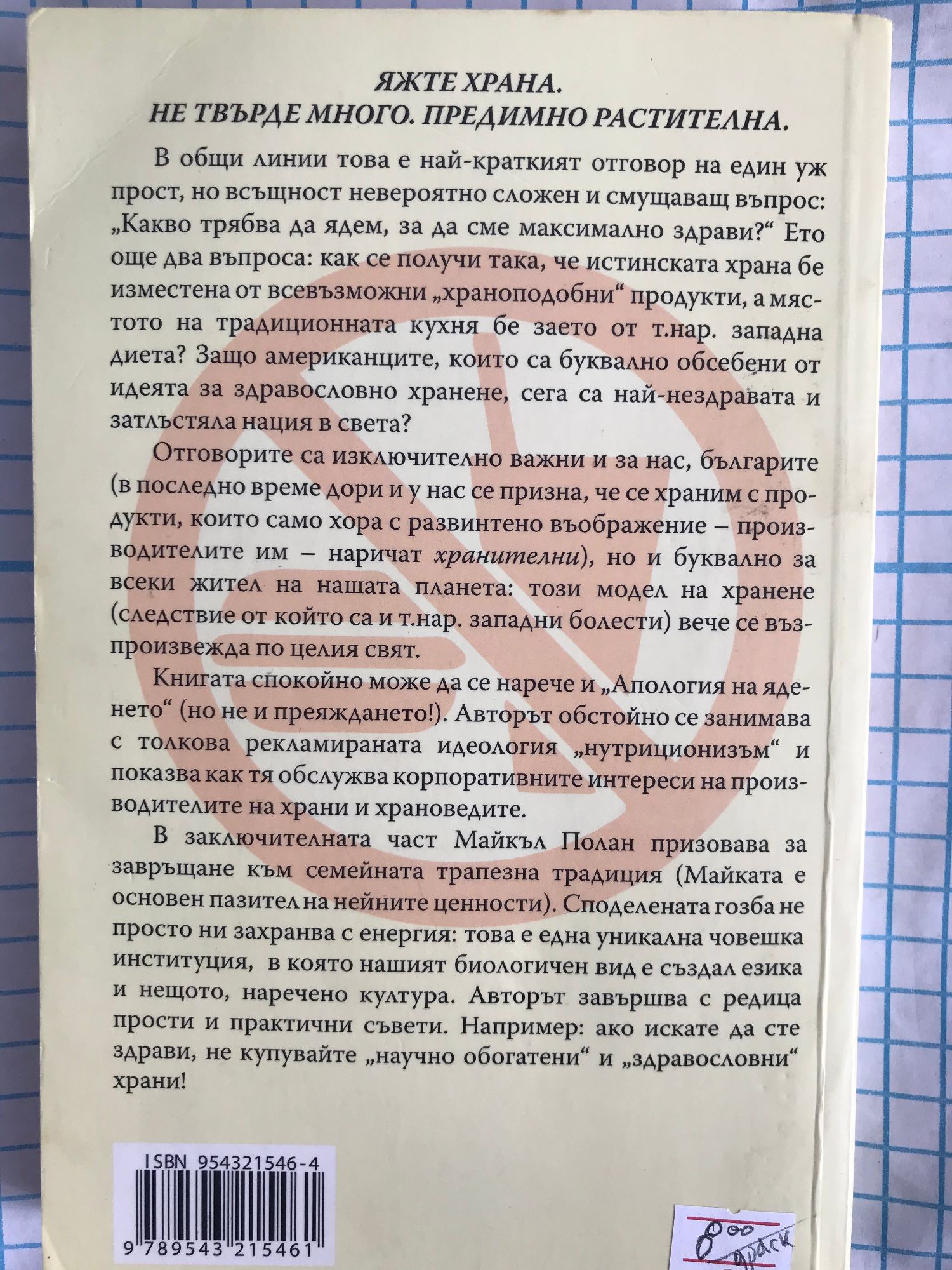 Как се получи така, че истинската храна бе изместена от всевъзможни "храноподобни" продукти, а мястото на традиционната кухня бе заето от т.нар. Западна диета? Защо американците, които са буквално обсебени от идеята за здравословно хранене, сега са най-нездравата и затлъстяла нация в света? Отговорите са изключително важни не само за нас, българите (в последно време се разкри, че ние се храним с продукти, които само човек с развинтено въображение - или производителите им - наричат храна), но и буквално за всеки жител на нашата планета: този модел на хранене (следствие от който са и т.нар. западни болести) вече се възпроизвежда по целия свят. Яжте храна. Не твърде много. Предимно растения. Върху тези прости правила е изградена и цялата книга, която спокойно може да се нарече и "Апология на яденето" (но не и преяждането!). Авторът обстойно се занимава с толкова рекламираната идеология "нутриционизъм" и показва как тя обслужва корпоративните интереси на производителите на храни и храноведите. В заключителната част Полан призовава за завръщане към семейната трапезна традиция (Майката е основен пазител на нейните ценности). Споделената гозба не просто ни захранва с енергия: това е една уникална човешка институция, в която нашият биологичен вид е създал езика и нещото, наречено култура. Авторът завършва с редица прости и практични съвети. Например: ако искате да сте здрави, не купувайте "научно обогатени" и "здравословни" храни!