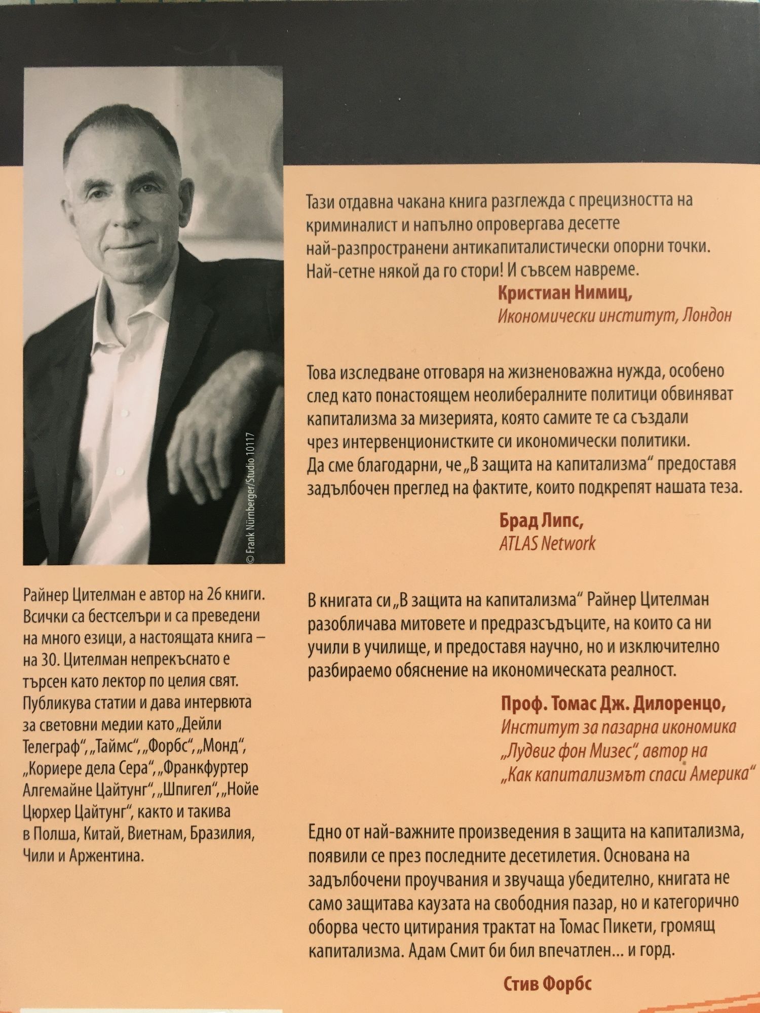 Райнер Цителман проучва десетте най-разпространени обвинения срещу капитализма – води до глад и бедност, до задълбочаващо се неравенство, до излишно потребителство, до разрушаване на околната среда, до климатични промени, до войни… Капитализмът, твърдят неговите критици, поставя печалбите над човечеството, създава доминиращи монополи, подкопава демокрацията. Цителман разглежда подробно всяко от тези обвинения и разкрива значимите грешки в него. Предлага контратези, като ги обосновава с изобилни исторически свидетелства и неопровержими факти, доказващи, че не капитализмът се е провалил: провалили са се антикапиталистическите експерименти, които се правят вече цял век. Втората част на книгата „В защита на капитализма“ разглежда схващанията за естеството на капитализма, битуващи в Европа, САЩ, Латинска Америка и Азия. Проучването се основава на анализ, специално поръчан от Ipsos MORI за 32 държави, чиито резултати се публикуват тук за първи път. Едно от най-важните произведения в защита на капитализма, появили се през последните десетилетия. Основана на задълбочени проучвания и звучаща убедително, книгата не само защитава каузата на свободния пазар, но и категорично оборва често цитирания трактат на Томас Пикети, громящ капитализма. Адам Смит би бил впечатлен... и горд.