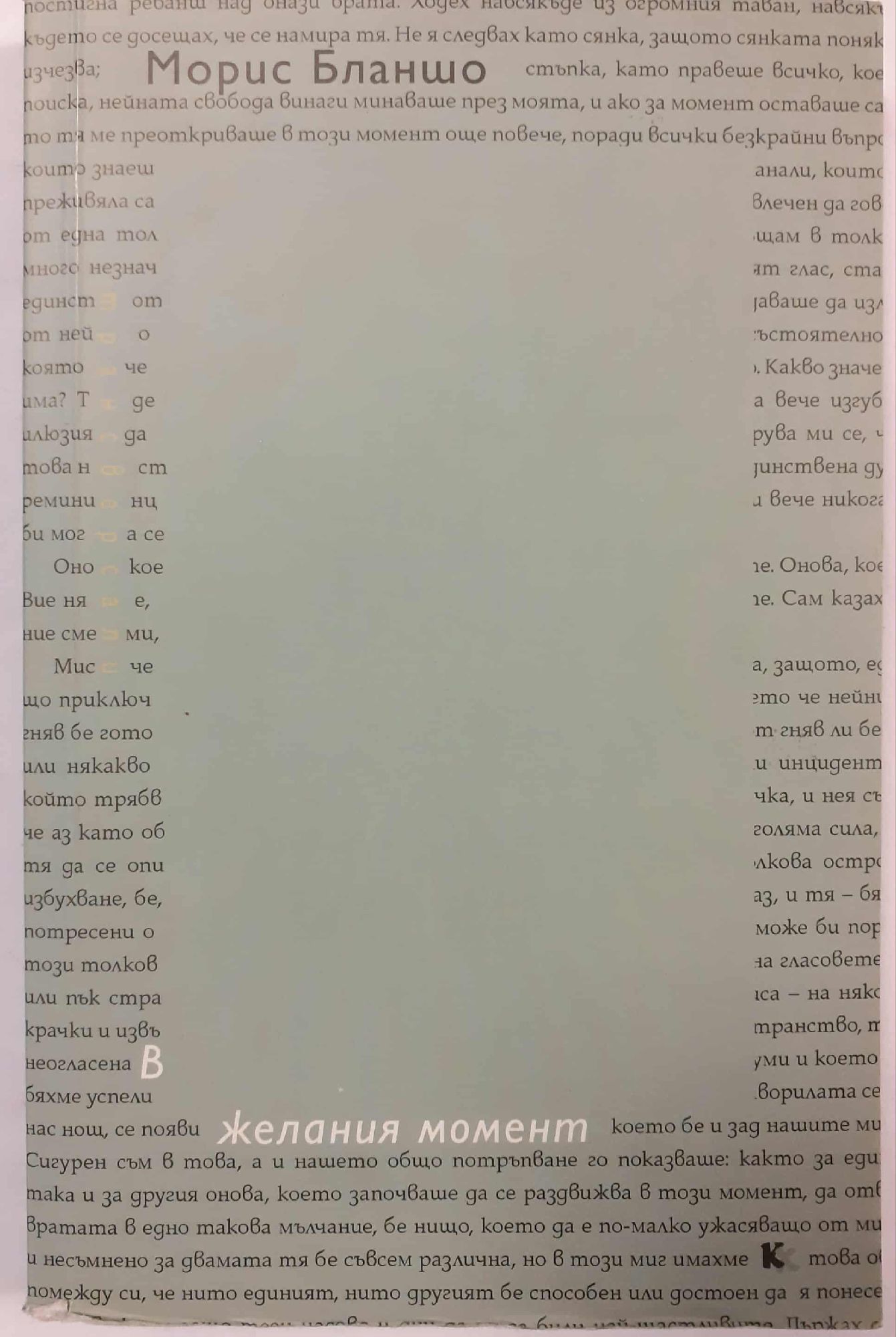 Времето на оригиналната поява на тези четири томчета - Смъртната присъда (1948), в Желания момент (1951), Онзи, който не ме придружаваше (1953), Последният човек (1957), - тоест средата на XX век, вместено във времето на живеенето на Морис Бланшо (1907-2003) и на произвеждането на неговите текстове, е вече първо просветване, към което може да придойде още светлост от това, че то пък е начало на времето на радикално оттегляне на Бланшо от френската столица и от публичността, на която тя е ослепителен синоним, към проблясванията на самотно мислене в покрай средиземноморското селище Ез. На български език вече са налични два сборника, обединили повечето от легендарните му литературнокритически текстове - Предстоящата книга и Литературното пространство. Но тези четири книги сега са първите от Бланшо в тукашен контекст, на които би трябвало да бъде залепен етикет фикция. Както става ясно обаче, това е класическо, но в случая на Бланшо и на типа мислене, към който той принадлежи, леко непрецизно дефиниране, най-Вече поради невъзможността ясно да се прокарва граница с хуманитаристиката, а и съмнителността на това, доколко дълбокомислено е всяко териториализиране чрез прокарване на граници. Книгите карат да се мисли, че са жанр, за който засега няма назоваване, или пък че са дълго като книга название на самия отказ от назоваване на жанрове. Съсипващо неопределими текстове, които припомнят, че Бланшо не крие пристрастието си към усилия, подобни на полаганите от Маларме - да се правят безплодни разграниченията между критика, рефлексия, романи, поеми... В името на опита „писане", което е „най-грандиозното насилие, защото трансгресира Закона, всеки закон и собствения си закон".