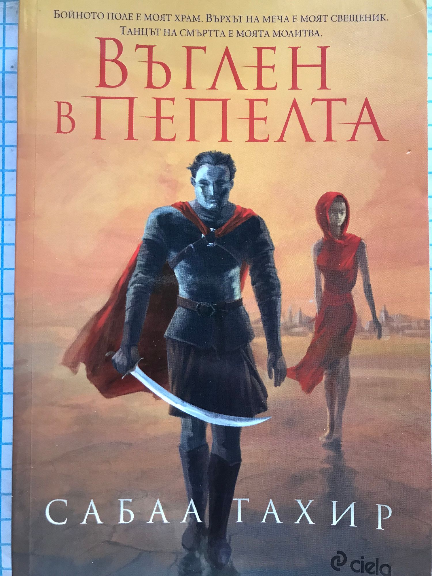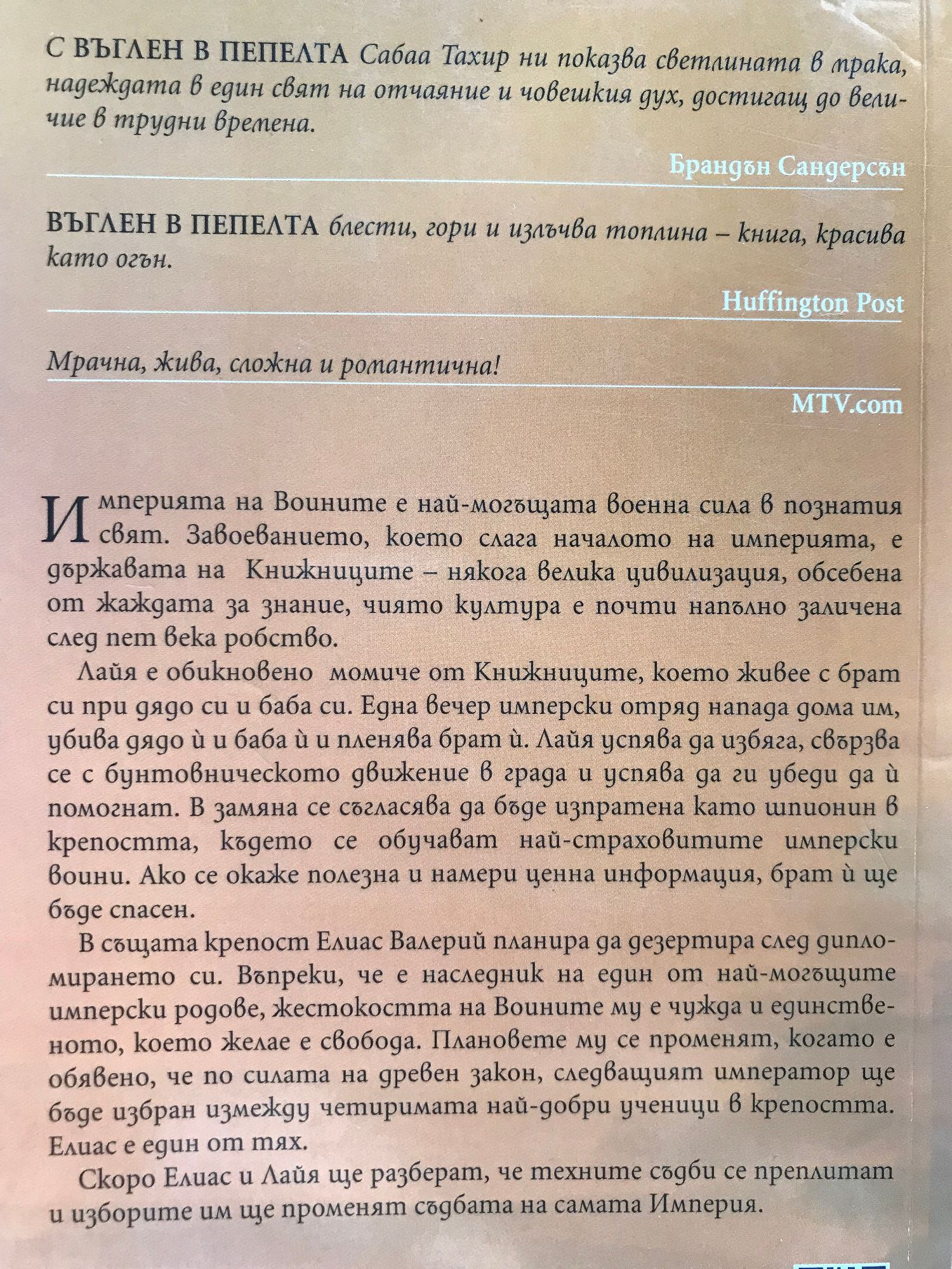 Империята на Воините е най-могъщата военна сила в познатия свят. Армиите й смазват всяка съпротива, благодарение на по-добрите си оръжия и безмилостните си войници. Завоеванието, което слага началото на империята, е държавата на Книжниците – някога велика цивилизация, обсебена от жаждата за знание, чиято култура е почти напълно заличена след пет века робство. Лайа е обикновено момиче от Книжниците, което живее с брат си при дядо си и баба си. Една вечер имперски отряд напада дома им, убива дядо й и баба й и пленява брат й. Лайа успява да избяга, свързва се с бунтовническото движение в града и успява да ги убеди да й помогнат. В замяна се съгласява да бъде изпратена като шпионин в крепостта, където се обучават най-страховитите имперски воини - Маските. Ако се окаже полезна и намери ценна информация, брат й ще бъде спасен. В същата крепост Елиас Валерий планира да дезертира след дипломирането си. Въпреки, че е наследник на един от най-могъщите имперски родове, жестокостта на Воините му е чужда и единственото, което желае е свобода. Плановете му се променят, когато е обявено,че по силата на древен закон, следващият император ще бъде избран измежду четиримата най-добри ученици в крепостта. Елиас е един от тях. Скоро Елиас и Лайя ще разберат, че техните съдби се преплитат и изборите им ще променят съдбата на самата Империя. „С „Въглен в пепелта” Сабаа Тахир ни показва светлината в мрака, надеждата в един свят на отчаяние и човешкия дух, достигащ до величие в трудни времена.” Брандън Сандерсън „Въглен в пепелта блести, гори и излъчва топлина – книга, красива като огън.“ Huffington Post „Мрачна, жива, сложна и романтична!“