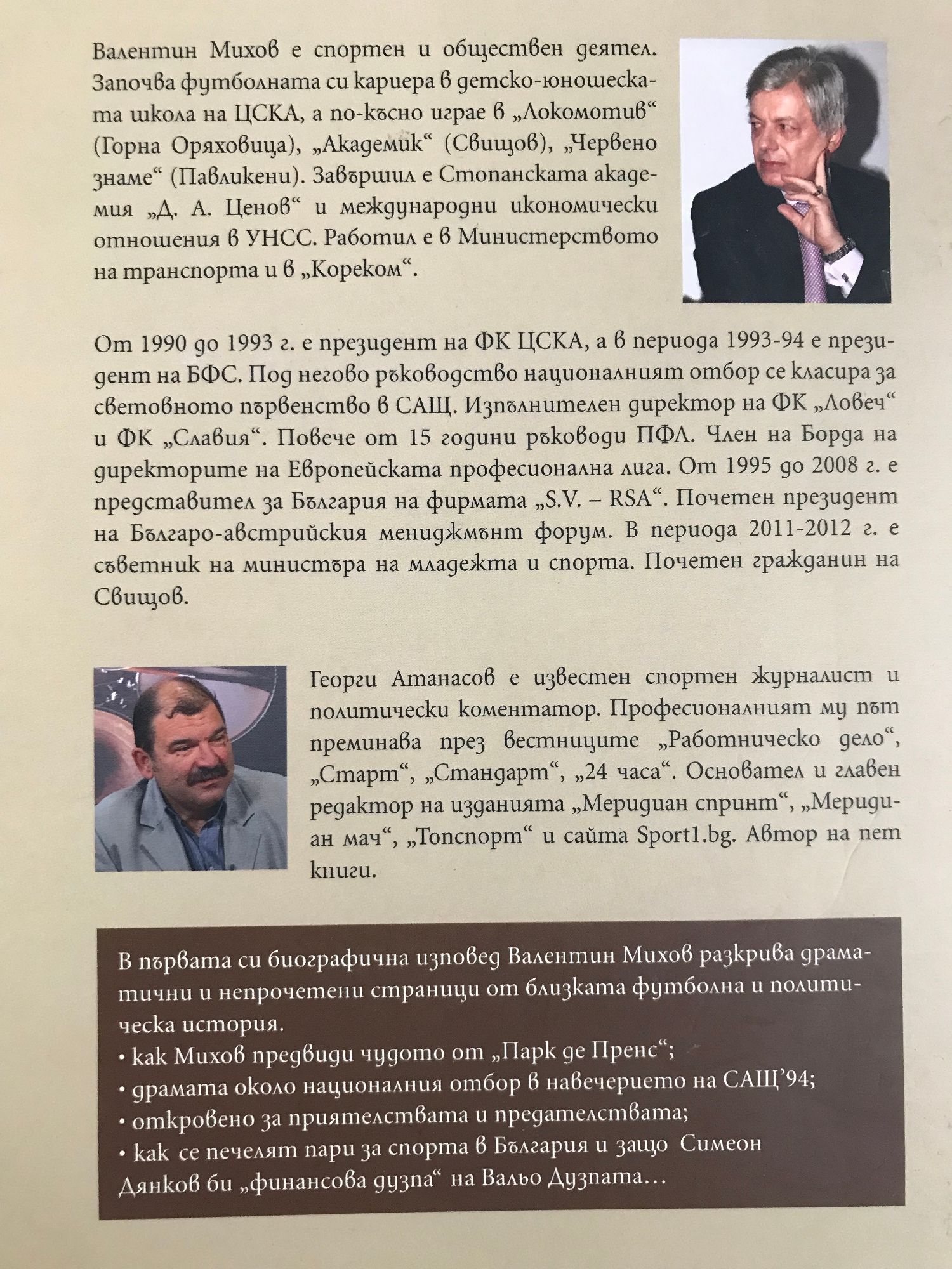 Валентин Михов е спортен и обществен деятел. Започва футболната си кариера в детско-юношеската школа на ЦСКА, а по-късно играе в "Локомотив" (Горна Оряховица), "Академик" (Свищов), "Червено знаме" (Павликени). Завършил е Стопанската академия "Д. А. Ценов" и международни икономически отношения в УНСС. Работил е в Министерството на транспорта и в "Кореком". От 1990 до 1993 г. е президент на ФК ЦСКА, а в периода 1993 - 1994 г. е президент на БФС. Изпълнителен директор на ФК "Ловеч" и ФК "Славия". Повече от 15 години ръководи ПФЛ. Член на Борда на директорите на Европейската професионална лига. Почетен президент на Българо-австрийския мениджмънт форум. В периода 2011 - 2012 е съветник на министъра на младежта и спорта. За приноса си в спорта, за благотворителната, гражданската и социалната си дейност е награден с орден "Стара планина". В първата си биографична изповед Валентин Михов разкрива драматични и непрочетени страници от близката футболна и политическа история - как Михов предвиди чудото от "Парк де Пренс"; драмата около националния отбор в навечерието на САЩ'94; откровено за приятелствата и предателствата; могат ли да се печелят пари за спорта в България и как Симеон Дянков би "финансова дузпа" на Вальо Дузпата... "Дълго мислих, преди да пристъпя към тази своеобразна изповед с помощта на доказан професионалист на словото като Георги Атанасов. Познаваме се от 25 години, преминали сме през различни етапи, но никога не сме прескачали границата на етичната норма. Освен всичко друго той е журналист и публицист с позиция и принципи и това го прави силен коректив в областта на спорта и обществено-политическите теми. Двамата си приличаме, защото не мълчим, а следваме убежденията си независимо от цената..." Валентин Михов Георги Атанасов е известен спортен журналист и политически коментатор. Професионалният му път преминава през вестниците "Работническо дело", "Старт", "Стандарт", "24 часа". Основател и главен редактор на изданията "Меридиан спринт", "Меридиан мач" и "Топспорт". Автор е на пет книги.