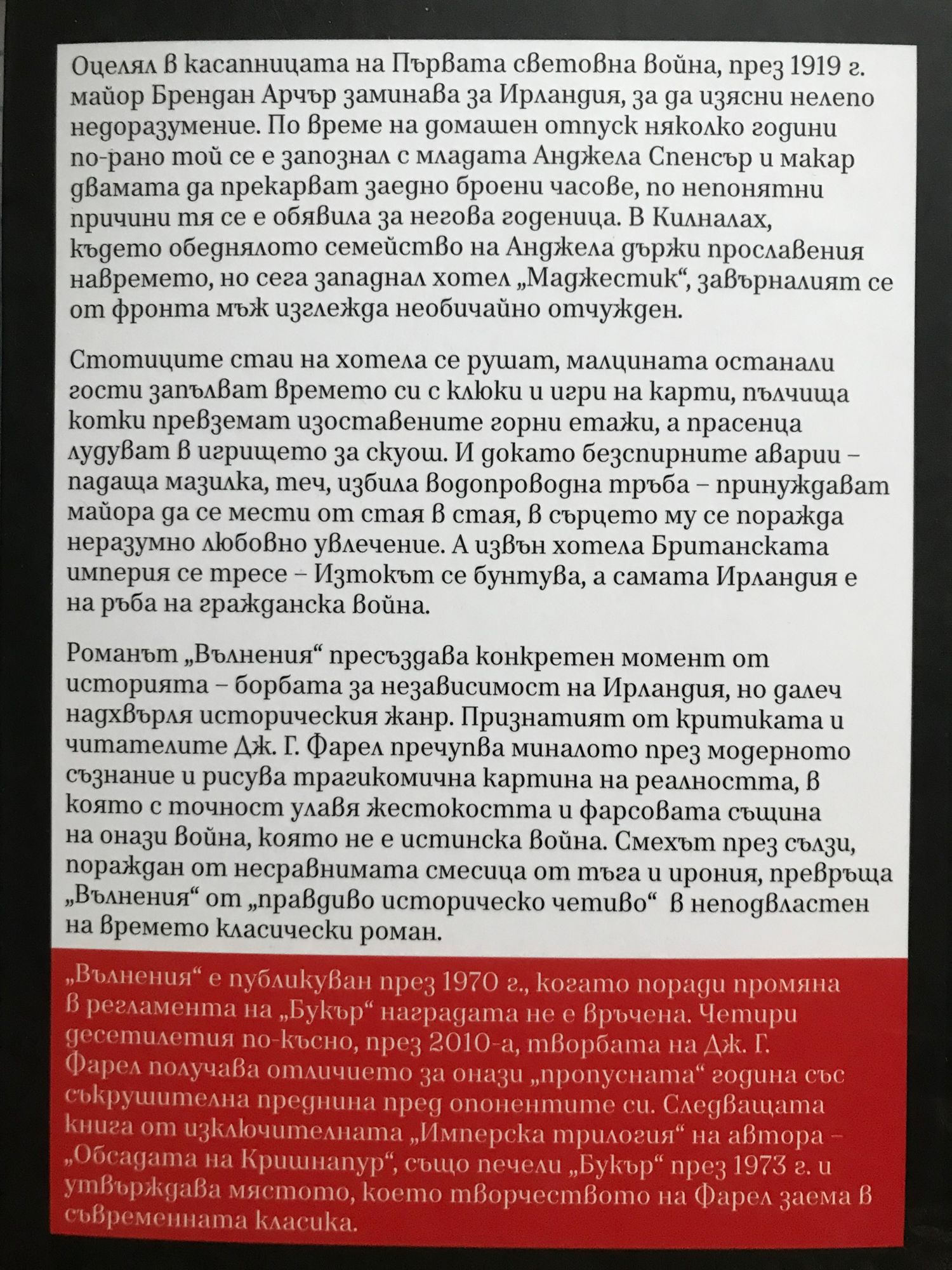 Оцелял в касапницата на Първата световна война, през 1919 г. майор Брендан Арчър заминава за Ирландия, за да изясни нелепо недоразумение. По време на домашен отпуск няколко години по-рано той се е запознал с младата Анджела Спенсър и макар двамата да прекарват заедно броени часове, по непонятни причини тя се е обявила за негова годеница. В Килналах, където обеднялото семейство на Анджела държи прославения навремето, но сега западнал хотел „Маджестик“, завърналият се от фронта мъж изглежда необичайно отчужден. Стотиците стаи на хотела се рушат, малцината останали гости запълват времето си с клюки и игри на карти, пълчища котки превземат изоставените горни етажи, а прасенца лудуват в игрището за скуош. И докато безспирните аварии – падаща мазилка, теч, избила водопроводна тръба – принуждават майора да се мести от стая в стая, в сърцето му се поражда неразумно любовно увлечение. А извън хотела Британската империя се тресе – Изтокът се бунтува, а самата Ирландия е на ръба на гражданска война. Романът „Вълнения“ пресъздава конкретен момент от историята – борбата за независимост на Ирландия, но далеч надхвърля историческия жанр. Признатият от критиката и читателите Дж. Г. Фарел пречупва миналото през модерното съзнание и рисува трагикомична картина на реалността, в която с точност улавя жестокостта и фарсовата същина на онази война, която не е истинска война. Смехът през сълзи, пораждан от несравнимата смесица от тъга и ирония, превръща „Вълнения“ от „правдиво историческо четиво“ в неподвластен на времето класически роман. „Вълнения“ е публикуван през 1970 г., когато поради промяна в регламента на „Букър“ наградата не е връчена. Четири десетилетия по късно, през 2010-а, творбата на Дж. Г. Фарел получава отличието за онази „пропусната“ година със съкрушителна преднина пред опонентите си. Следващата книга от изключителната „Имперска трилогия“ на автора – „Обсадата на Кришнапур“, също печели „Букър“ през 1973 г. и утвърждава мястото, което творчеството на Фарел заема в съвременната класика.